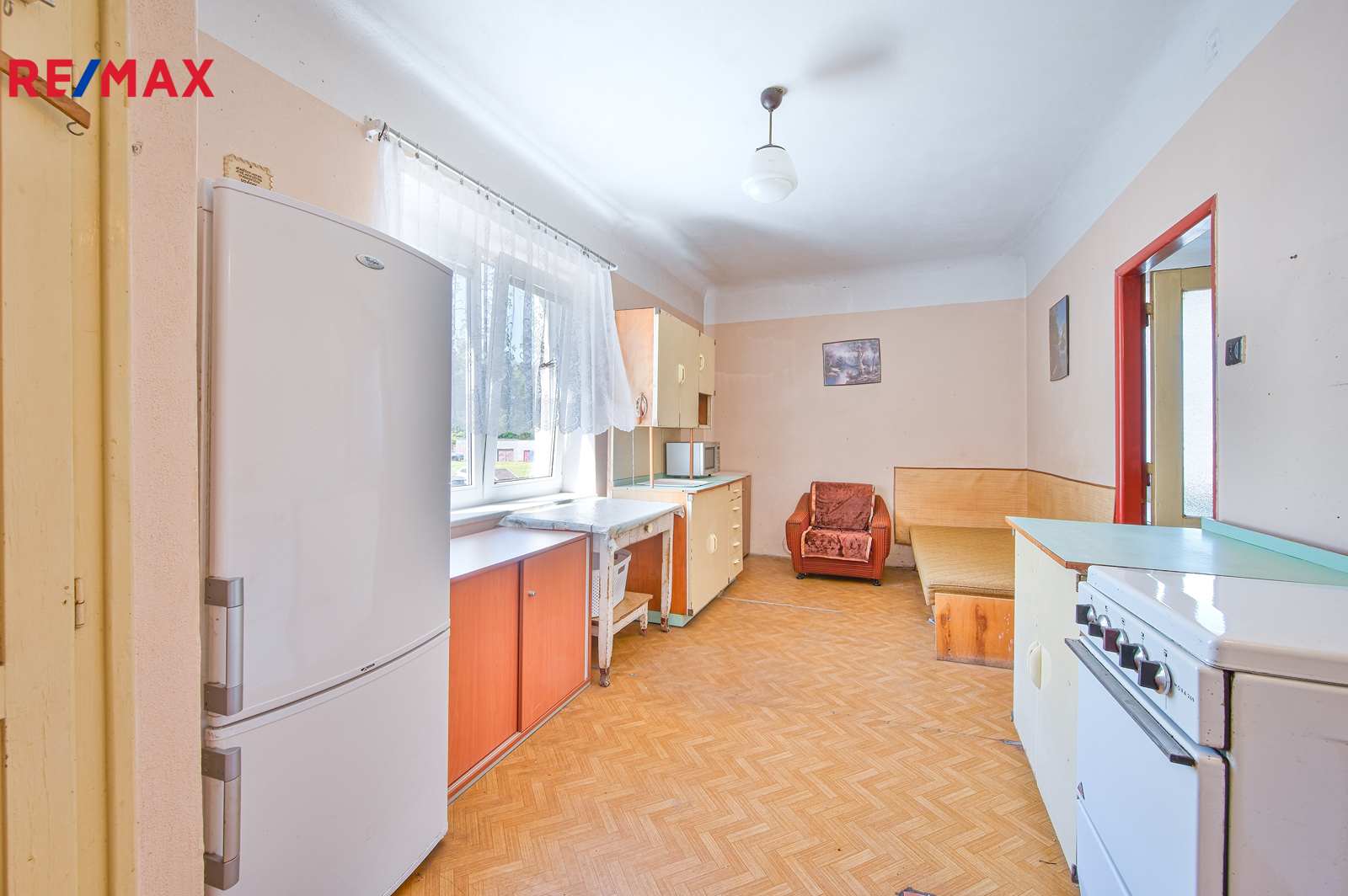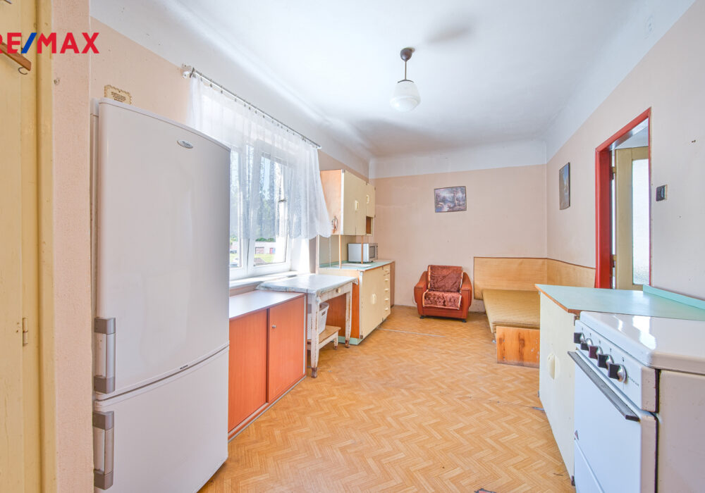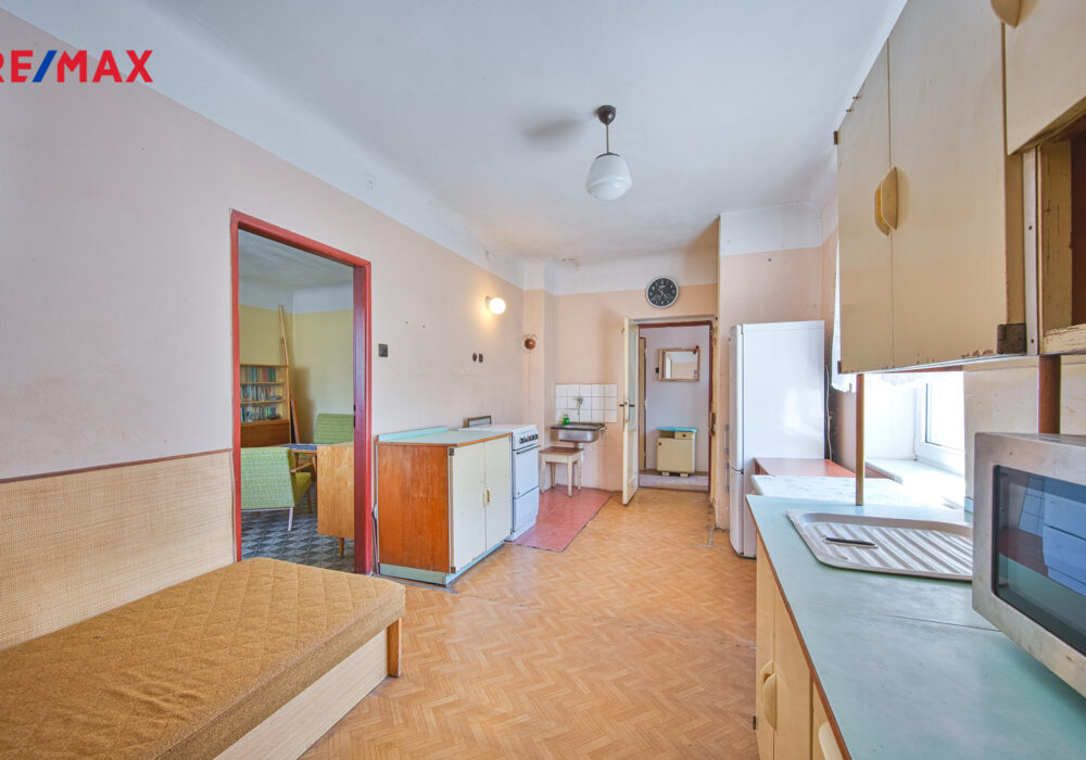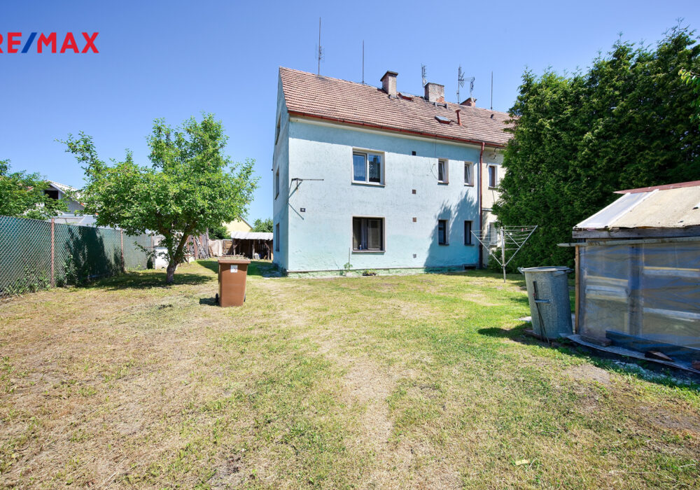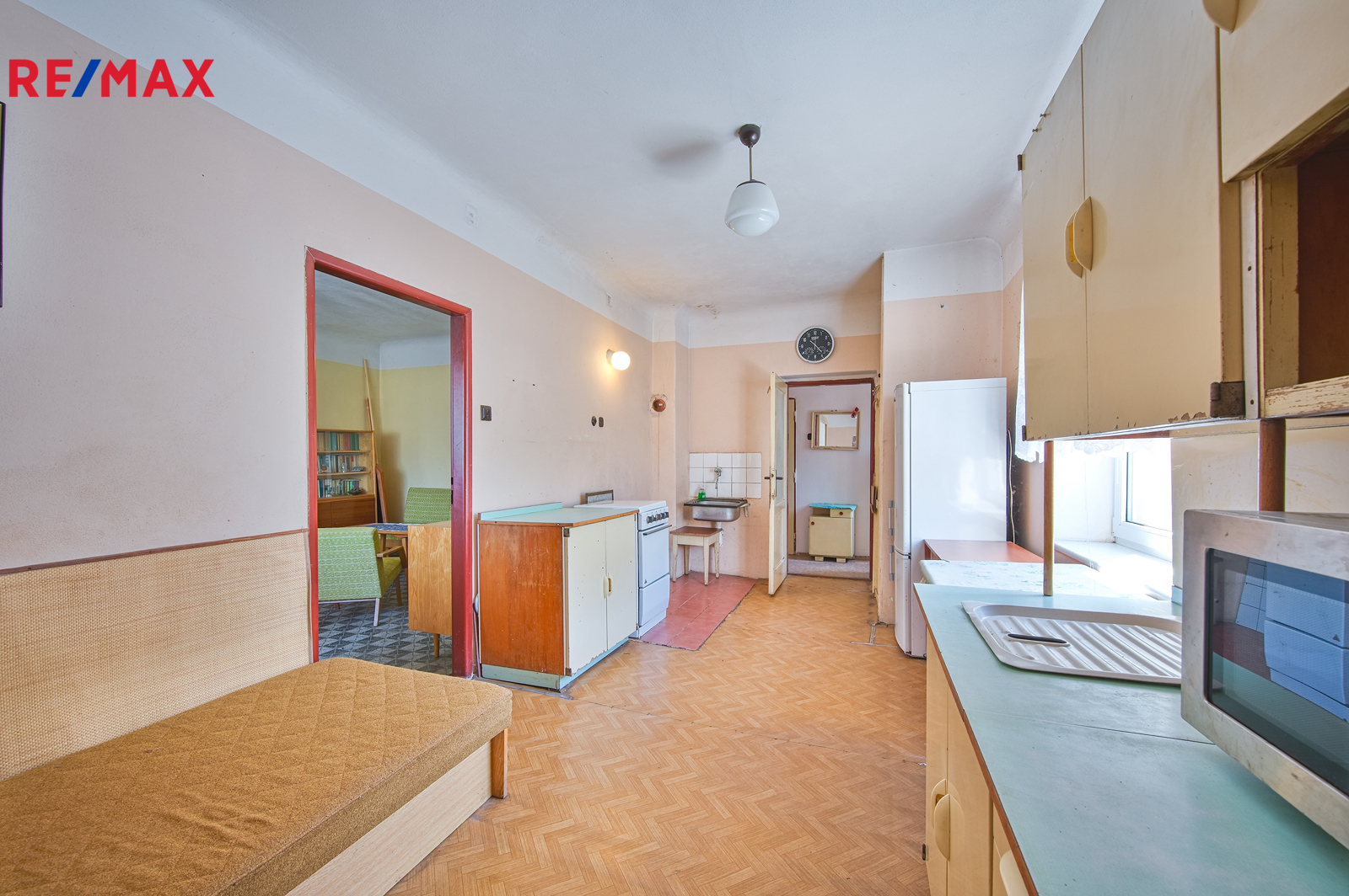 Ve výhradním zastoupení majitele nabízíme k prodeji 1/4 RD a zahrady v osobním vlastnictví. Pod podílem si můžeme představit bytovou jednotku o dispozici 1+1 s celkovou podlahovou plochou 45m2, který se nachází ve 2.NP (1. patro) cihlového domu z celkových 3 podlaží bez výtahu. Bytová jednotka se skládá ze vstupní chodby, kuchyně, koupelny, WC. a velkého obývacího pokoje. Zahrada, která náleží k domu má výměru 768m2 a koupí tak získáte podíl 1/4 na tomto pozemku.