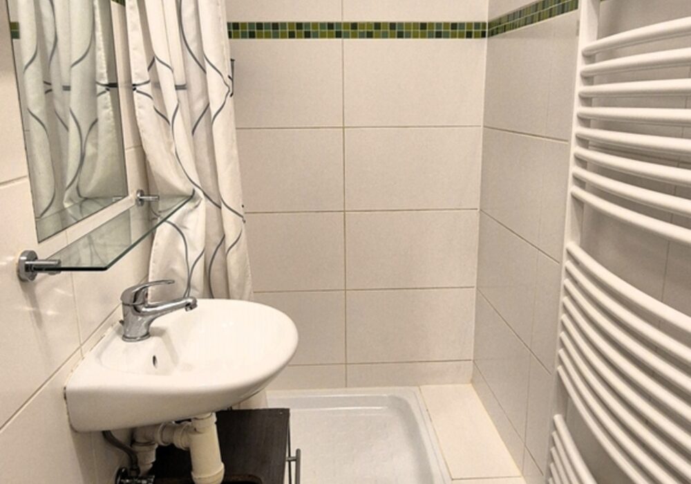 Koupelna je zděná, vybavená sprchovým koutem, umyvadlem a žebříkovým topením. Pračka je prakticky umístěna v kuchyňském koutě, event. je možné zde umístit myšku (příprava na připojení myčky je již na místě). Kuchyňská linka umožňuje instalaci indukční desky.