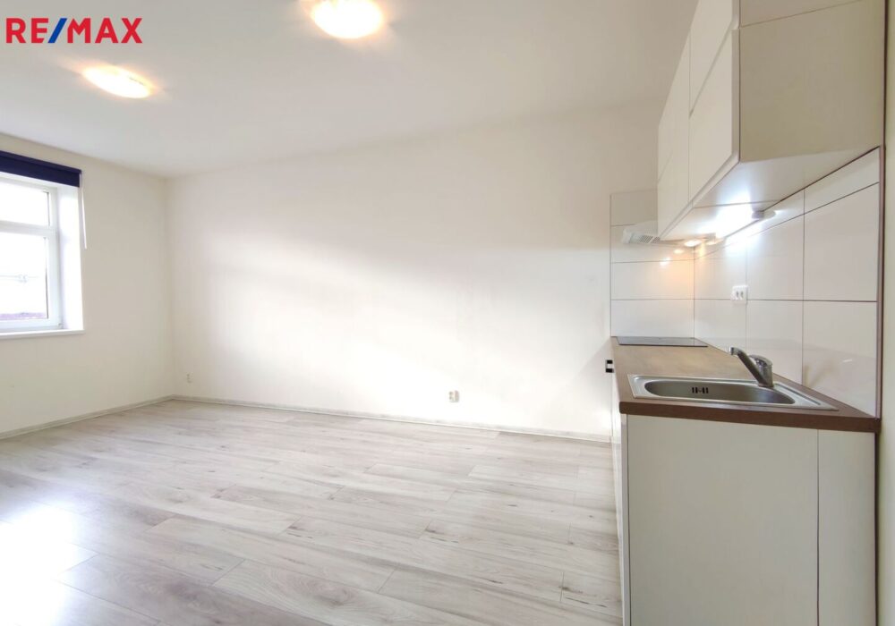 Prostorný obývací pokoj s oknem do klidného vnitrobloku, kde se nachází kuchyňská linka se sklokeramickou deskou a elektrickou troubou, vedle linky místo na lednici.