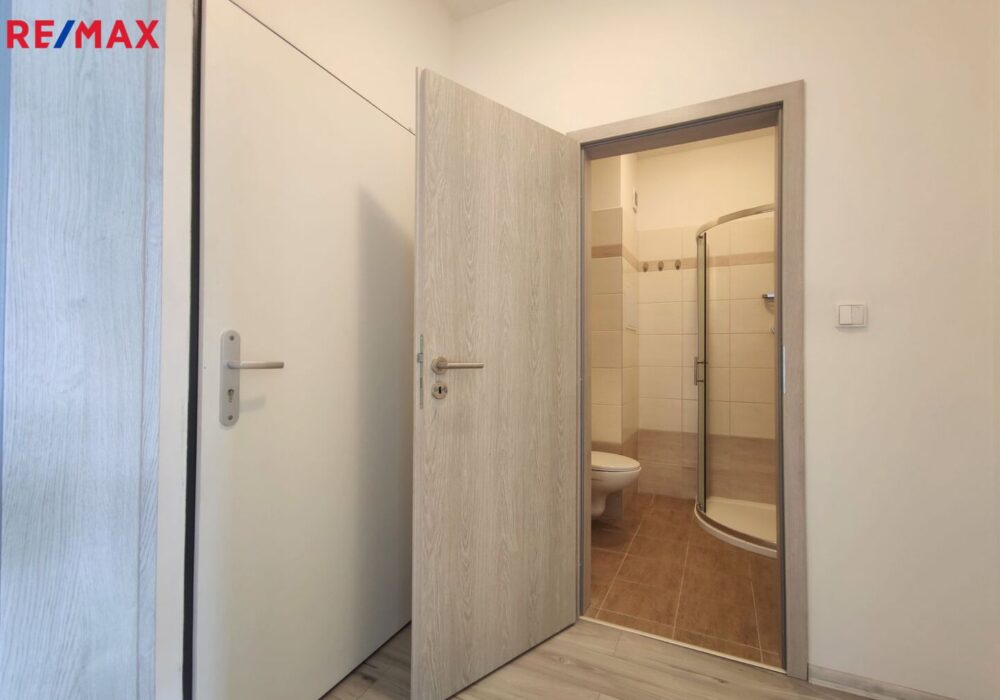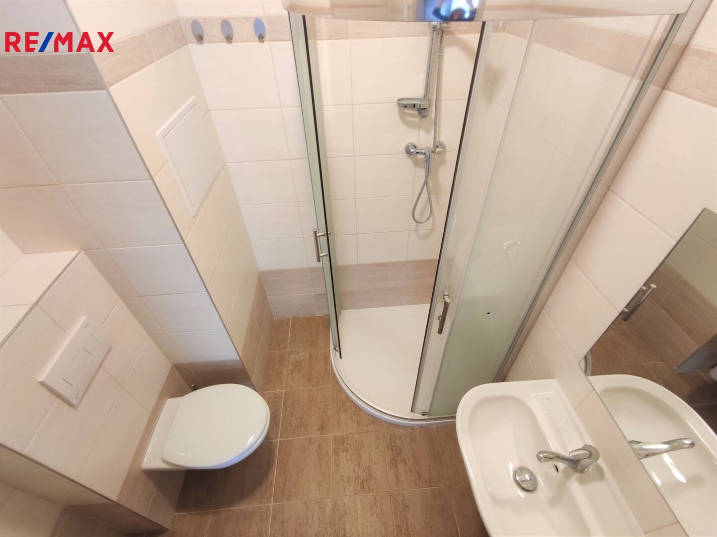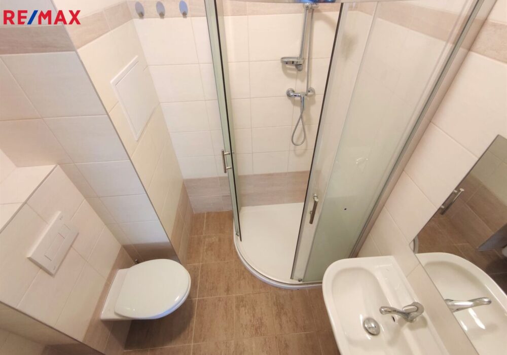 V koupelně se nachází sprchový kout, WC, umyvadlo se zrcadlem a místo s přívodem pro pračku.