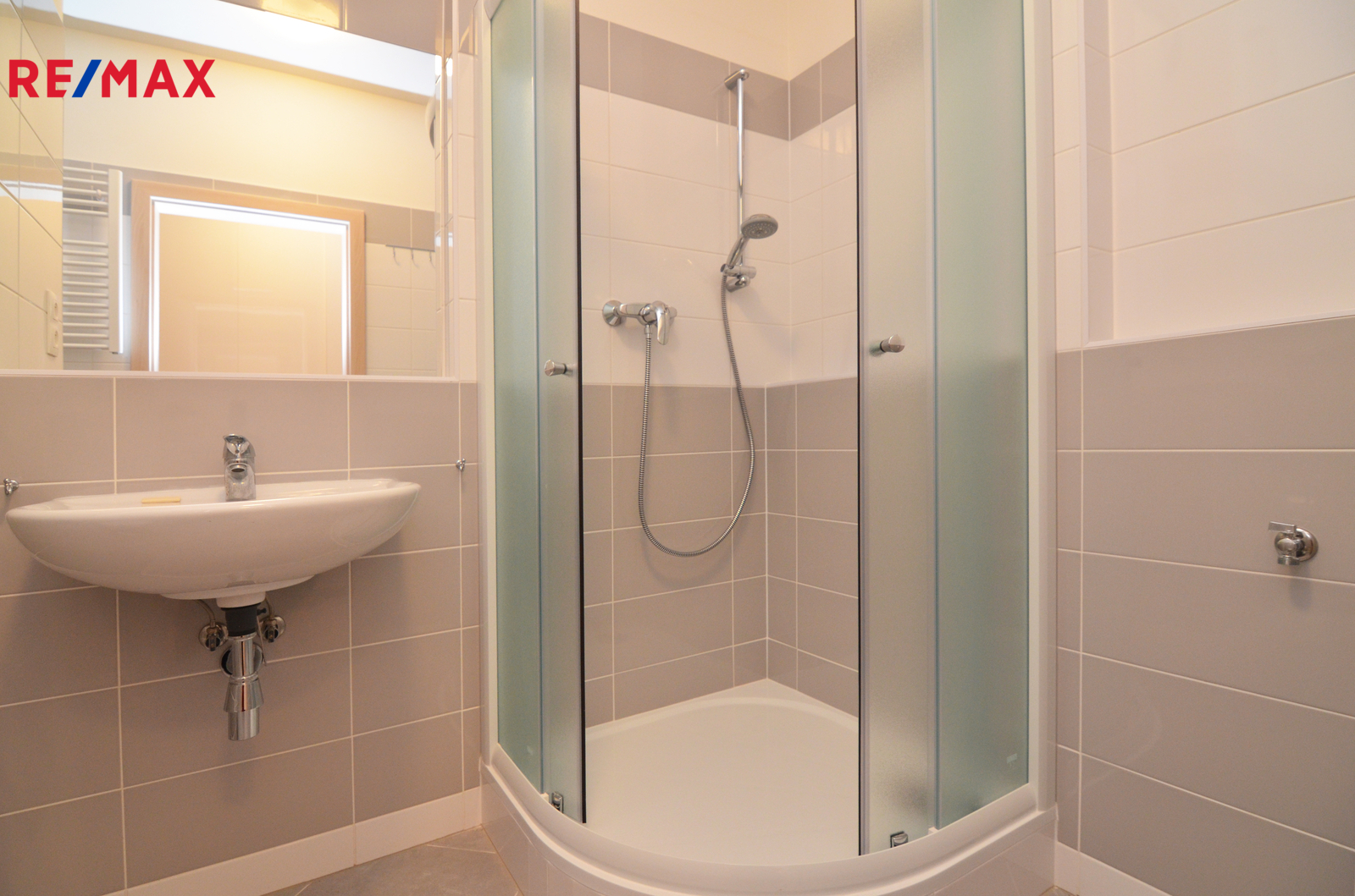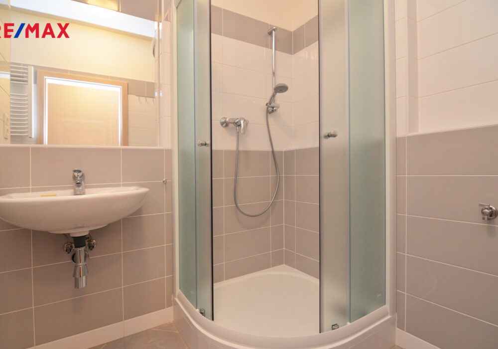 Koupelna se sprchovým koutem, umyvadlem a WC.