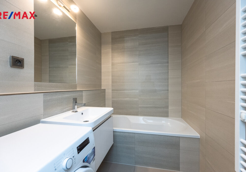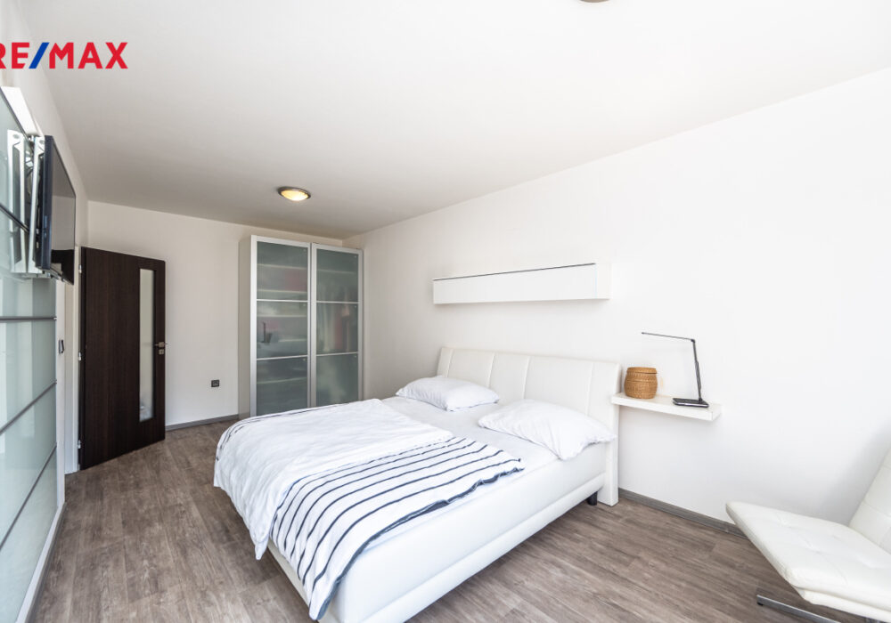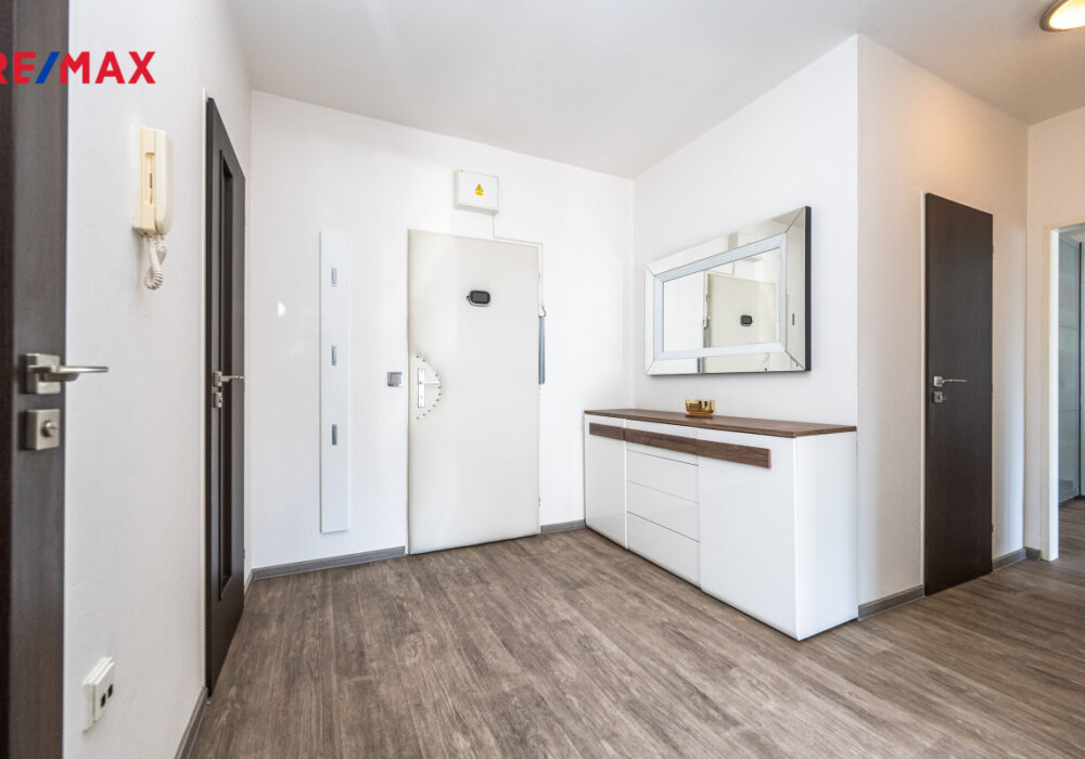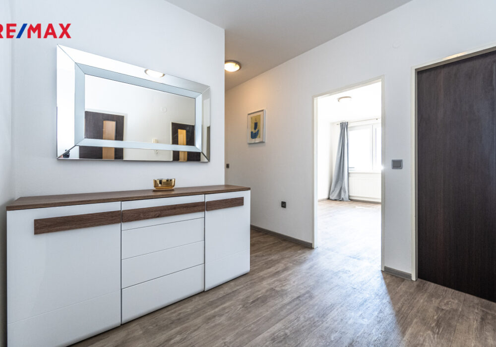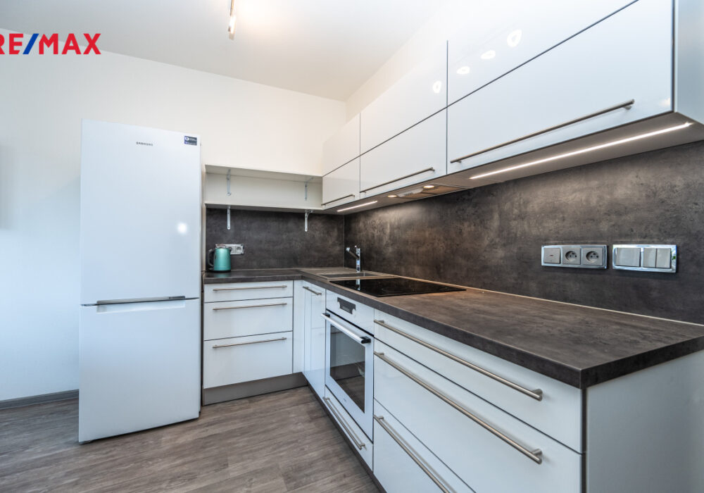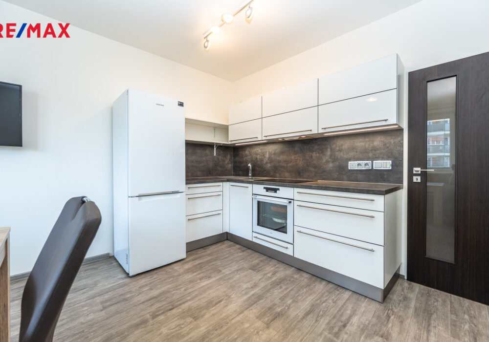 Byt prošel kompletní rekonstrukcí – nové podlahy, kuchyňská linka, koupelna, dveře.