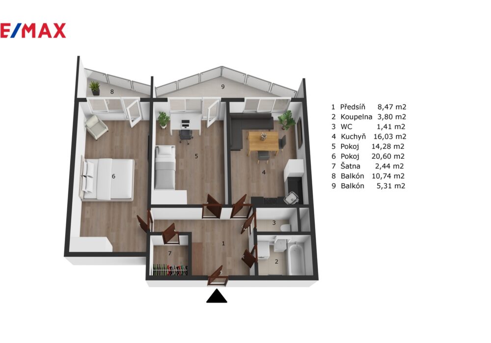 Dispozičně je byt řešen jako 2+1, 2 samostatné ložnice a velká kuchyň, kterou je možno využívat i jako obývací pokoj.