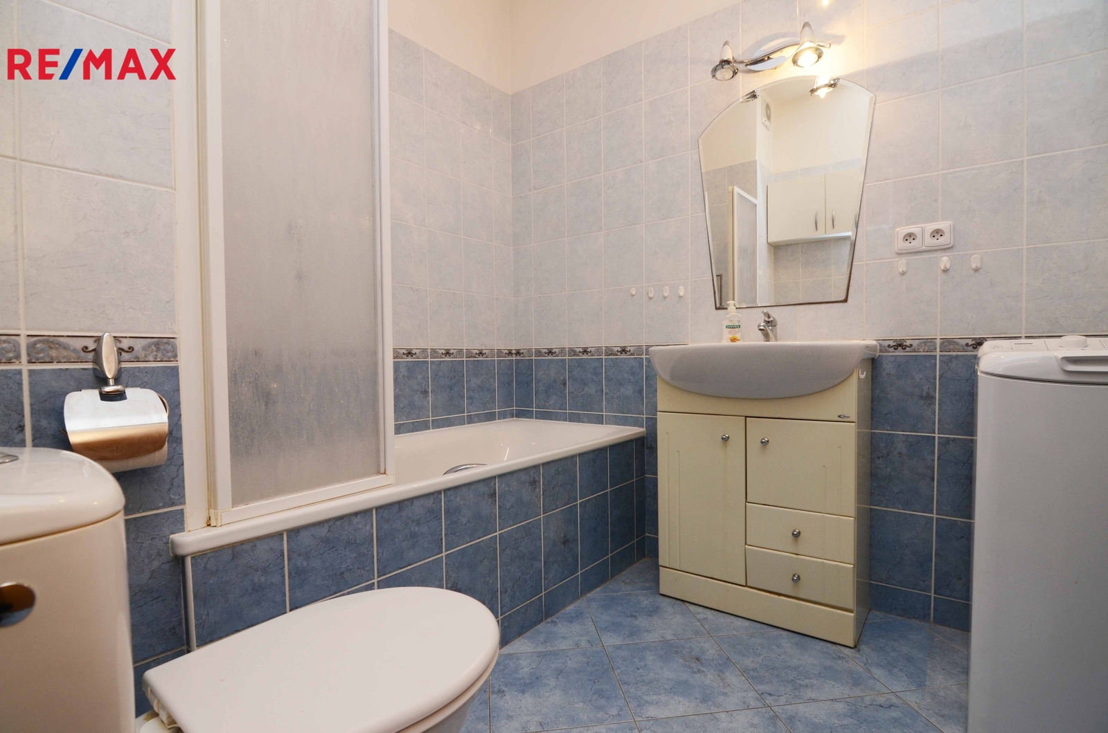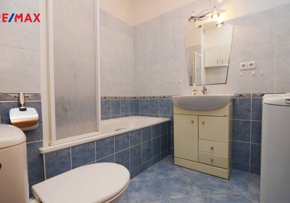Koupelna s vanou, umyvadlem, WC a pračkou.