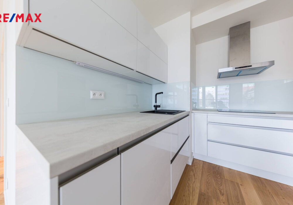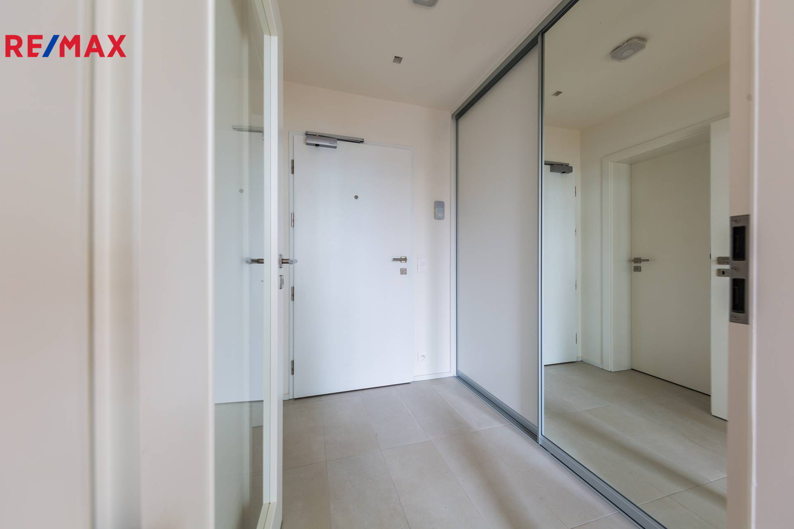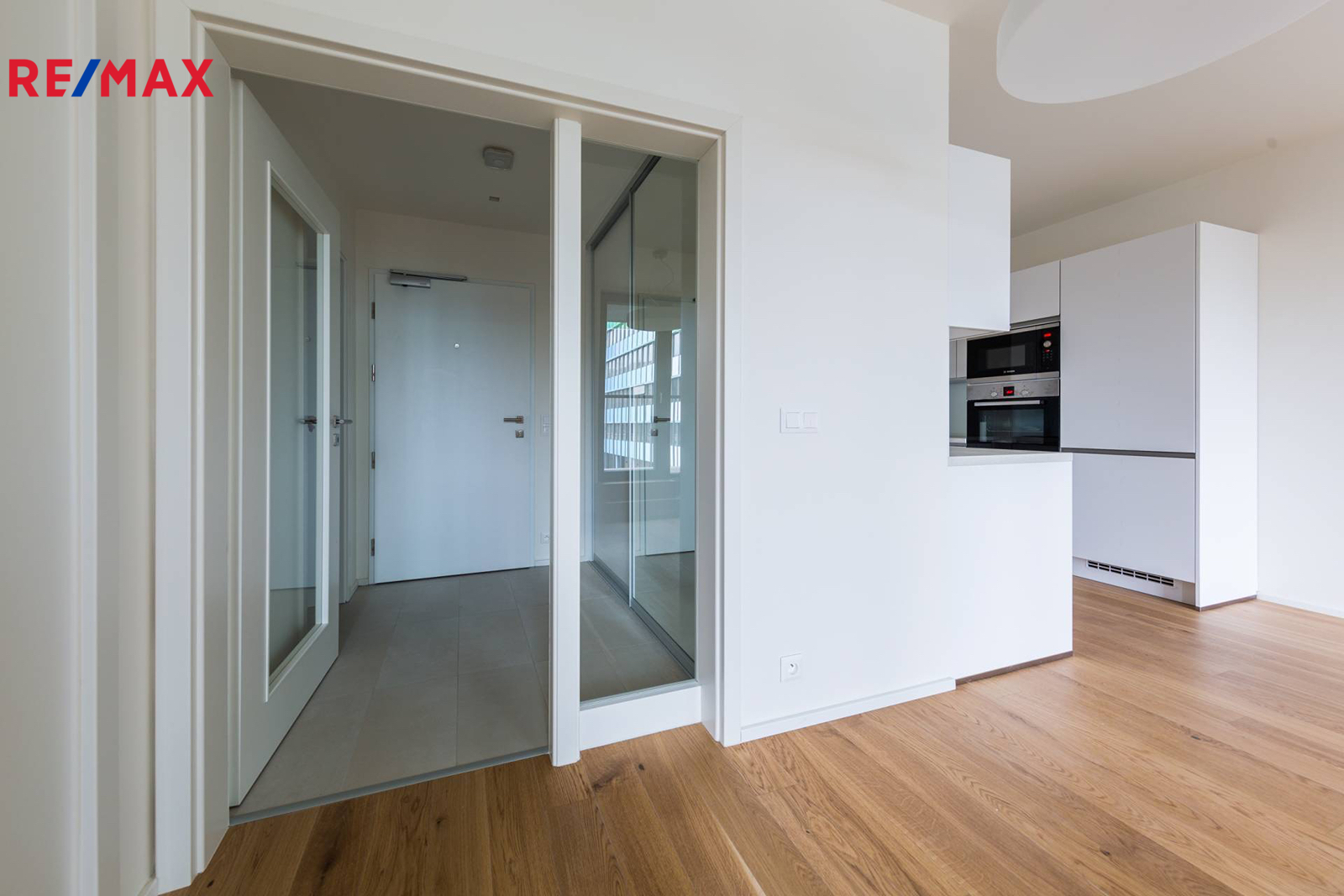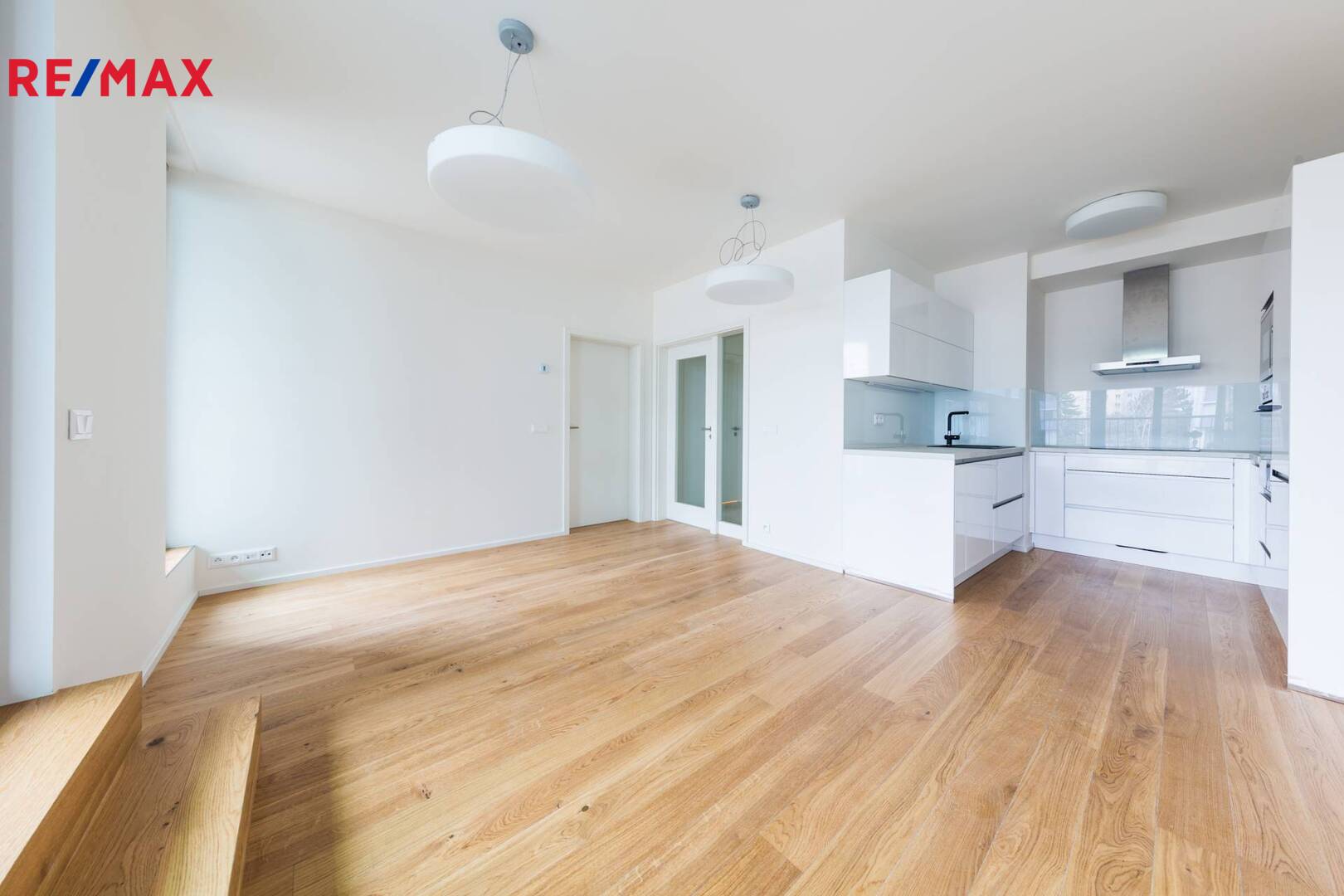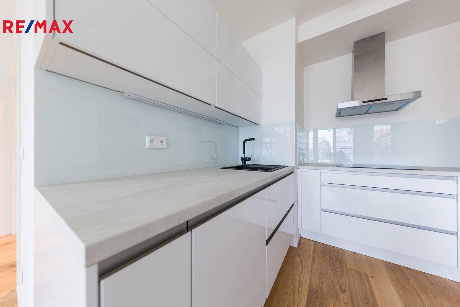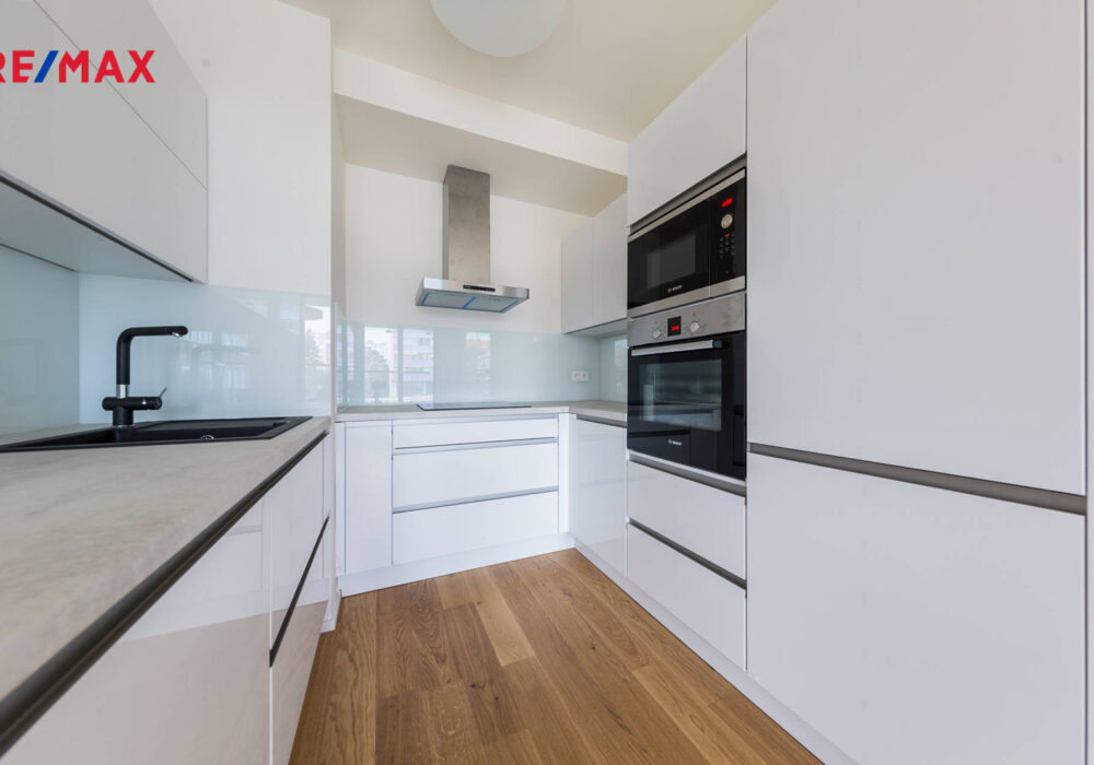 Dovolujeme si vám nabídnout byt v novostavbě projektu 4blok s terasou, garážovým stáním, sklepem a velmi příjemnou atmosférou. Tento prosluněný byt ve 4. patře nabízí dispozici 2+kk, celkovou velikost 63m2 (48m2 byt, 9m2 terasa, 6m2 komora). Na prostornou terasu vedou malebné schůdky z ložnice i obývacího pokoje. Obývací pokoj (23m2) disponuje plně vybaveným kuchyňským koutem – myčka nádobí, varná deska, digestoř, elektrická pečící trouba, mikrovlnná trouba, lednice s mrazničkou (vše značky BOSH), dřez a kuchyňská baterie (Franke), vše doplněno dostatkem pracovní plochy a úložných prostor. Ložnice o velikosti 15m2 má stejně jako obývací pokoj dřevěnou podlahu a je vybavena prostornou vestavěnou skříní s posuvnými dveřmi. Koupelna (4m2) s elegantní sprchovou zástěnou, umyvadlem (Villeroy & Boch), toaletou a topným žebříčkem. Vstupní hala s další vestavěnou skříní, bezpečnostními dveřmi a dlažbou na podlaze. Prostorný sklep/komora náležící k bytu se nachází na stejném patře jako byt a k dispozici je jedno garážového stání.
