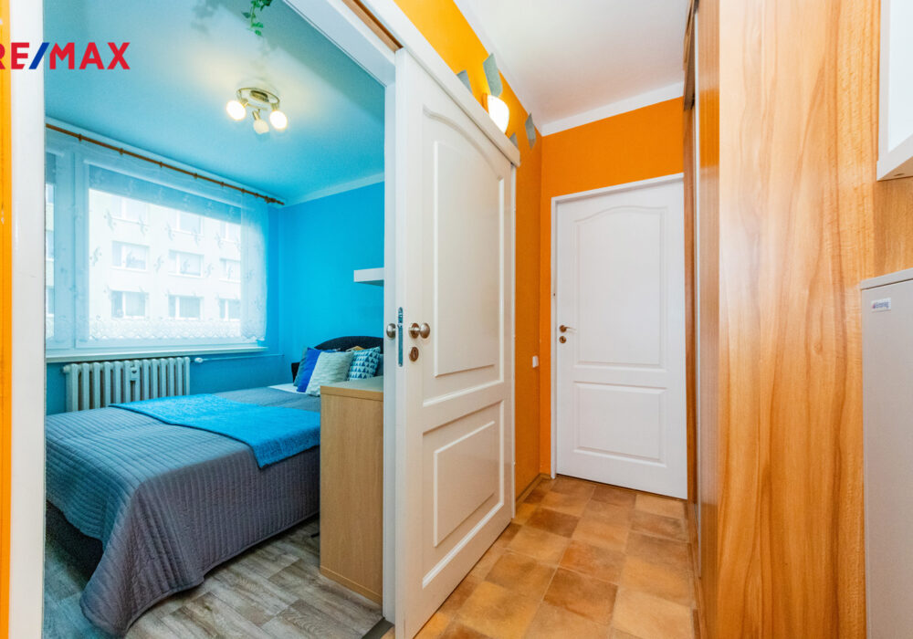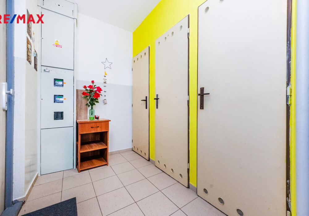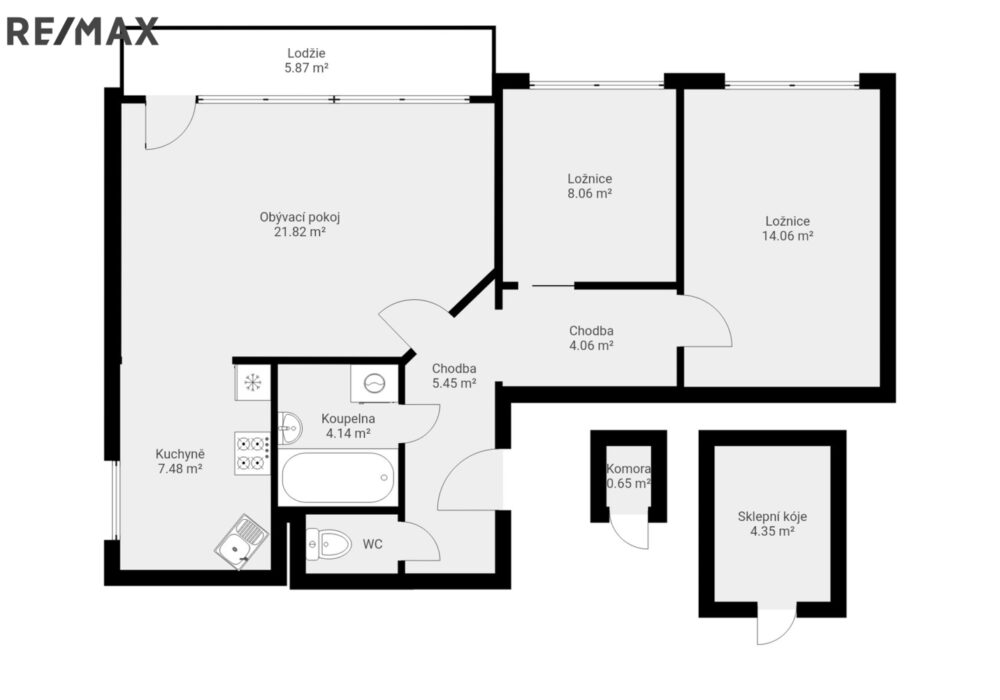 Dispozice zahrnuje dva samostatné pokoje, kuchyni a prostorný obývací pokoj se vstupem na lodžii (6 m²), která zajišťuje dostatek světla a příjemné místo k odpočinku. K bytu patří také komora na chodbě (1 m²) a sklep (4 m²), které poskytují dostatek úložného prostoru.