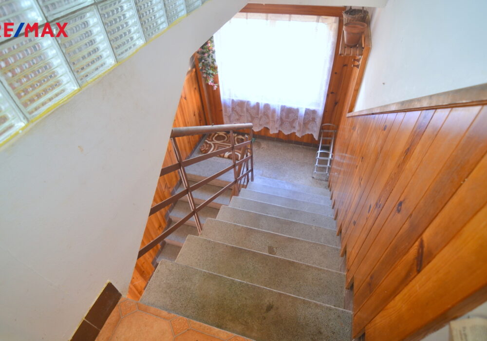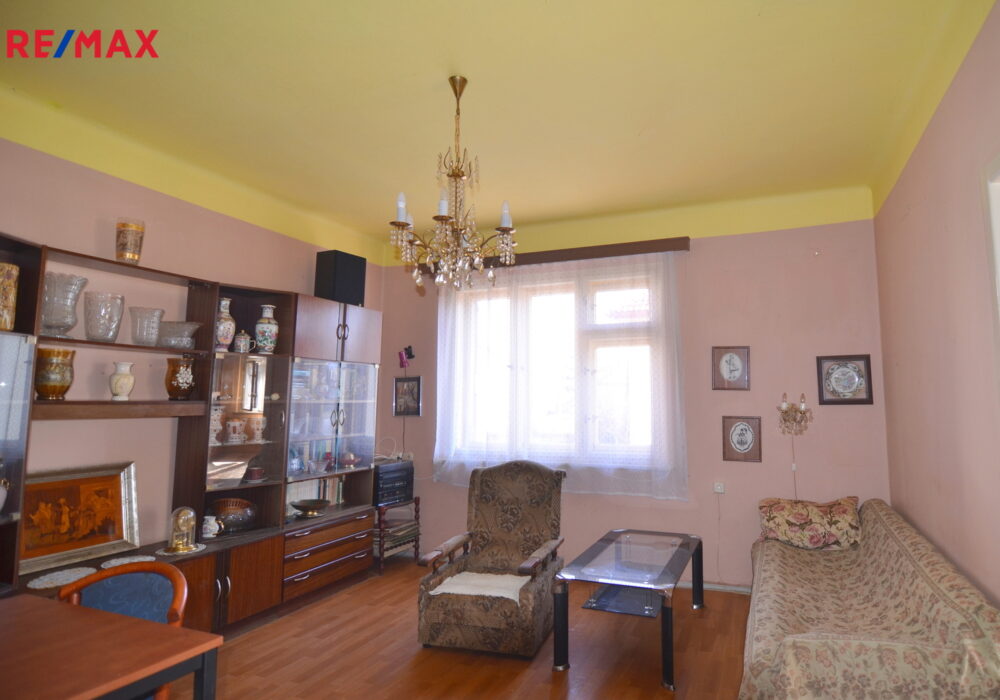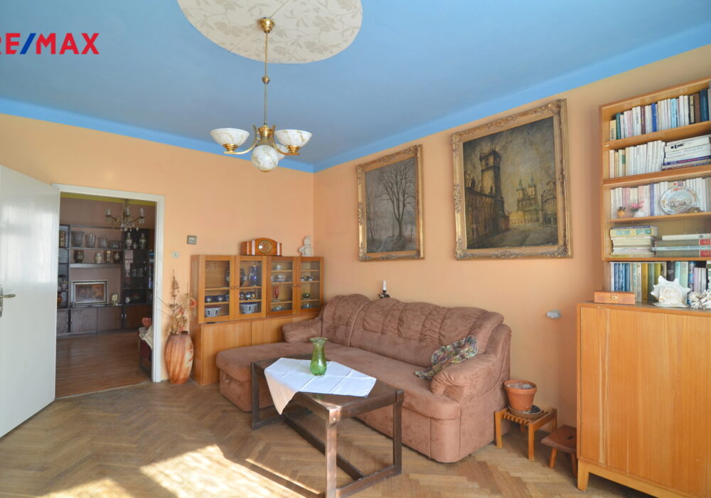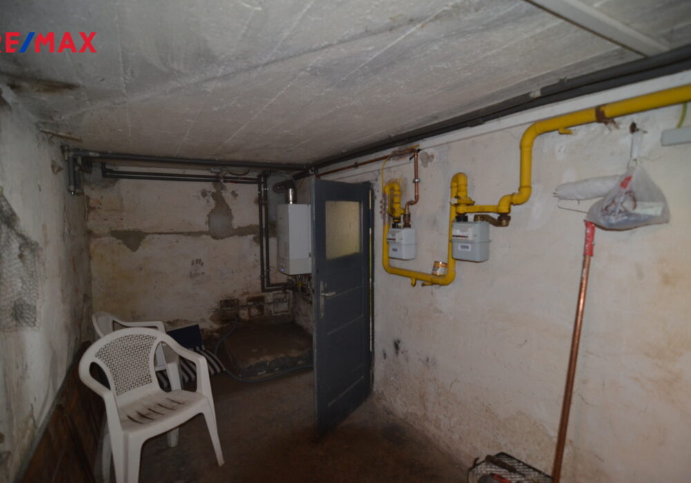 Samotná bytová jednotka (74 m2), která se nabízí, se nachází v 1. patře a je přístupná po schodišti ze společného zádveří. K dispozici je pak také polovina sklepu v suterénu domu o velikosti 13 m2 a další skladovací prostory na nižší půdě nad bytem.