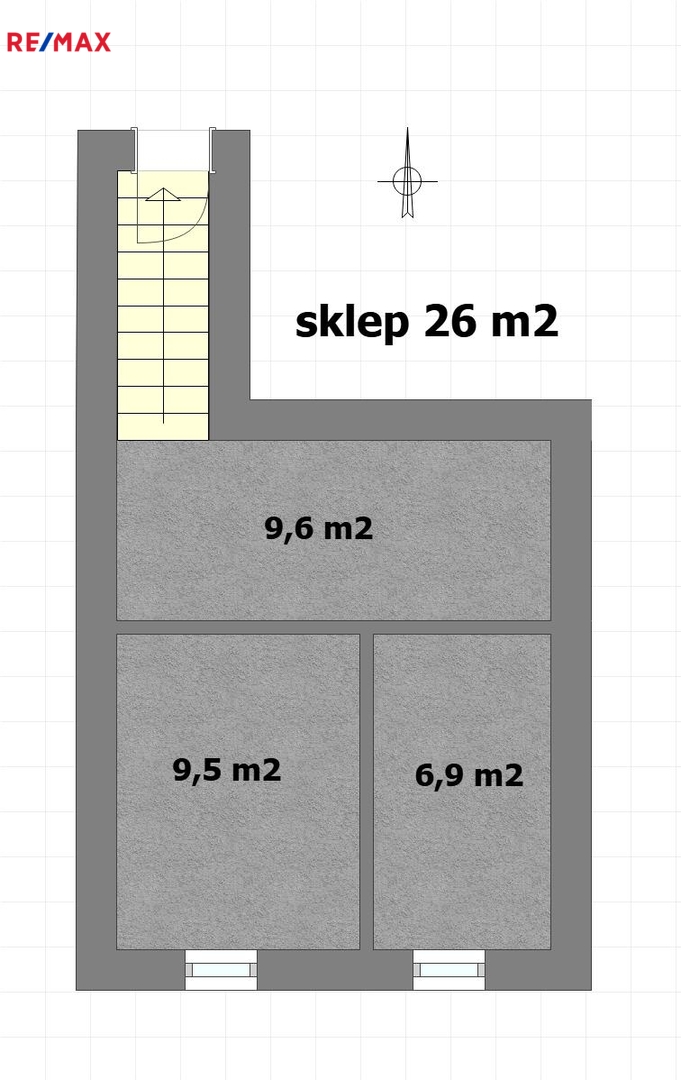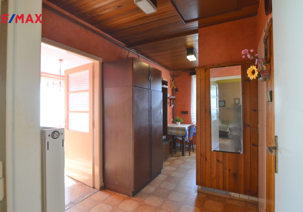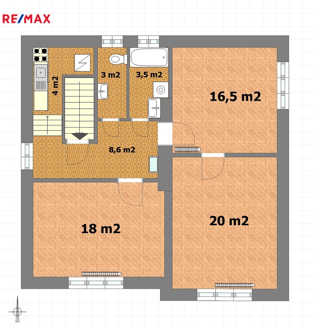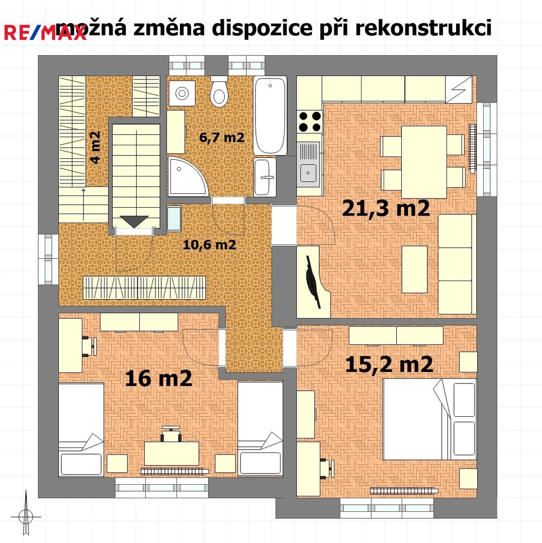 Samotná bytová jednotka (74 m2), která se nabízí, se nachází v 1. patře a je přístupná po schodišti ze společného zádveří. K dispozici je pak také polovina sklepu v suterénu domu o velikosti 13 m2 a další skladovací prostory na nižší půdě nad bytem.