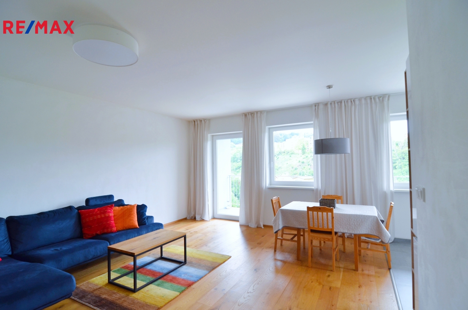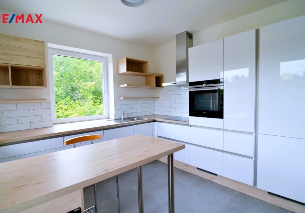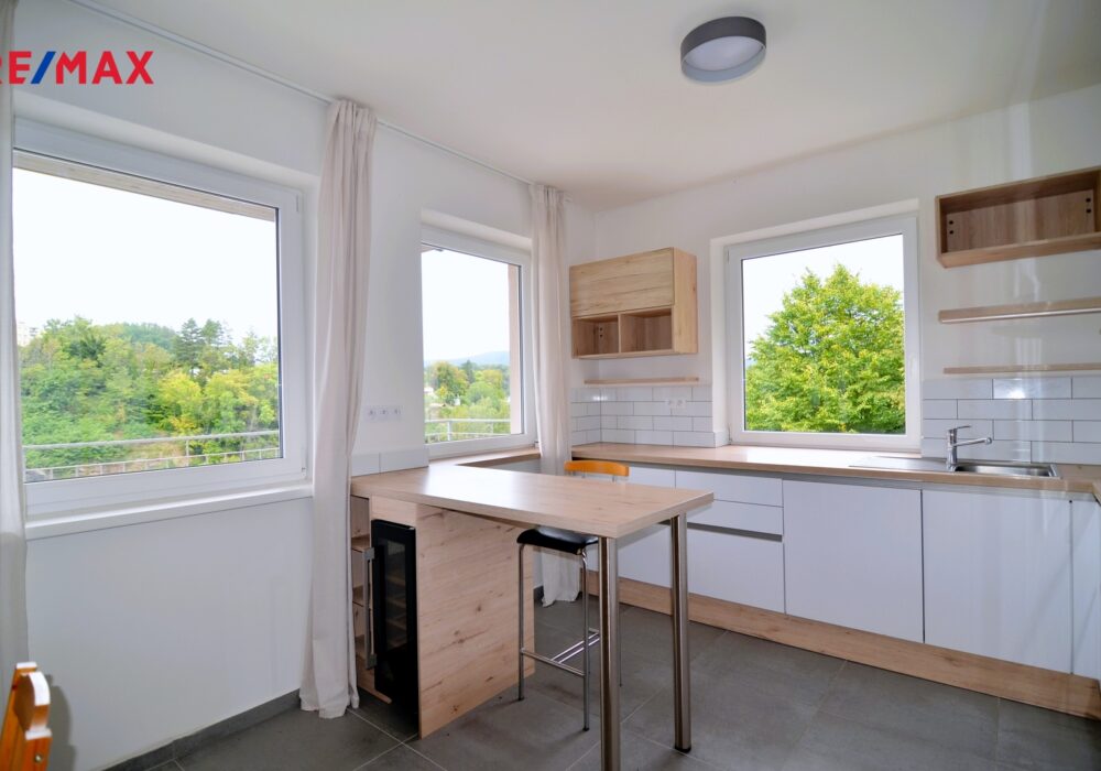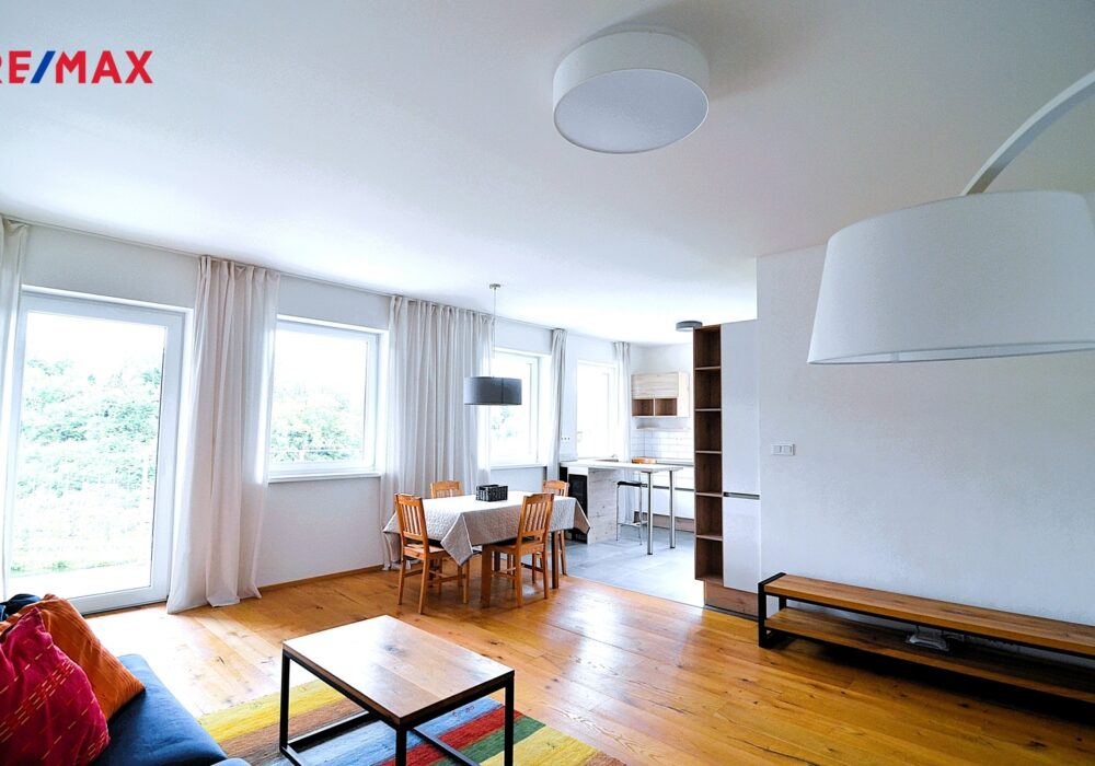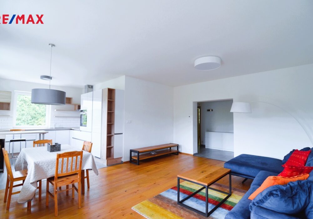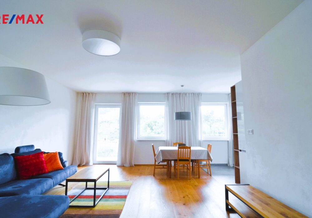Nabízíme ke koupi krásný, prostorný byt 3 + kk s velkoryse pojatým, prostorným, vzdušným obývacím pokojem (38 m2) vzdálený pouhých 20 minut pěší chůze od historického centra Českého Krumlova, s nádherným výhledem na řeku Vltavu a historickou krytou dřevěnou lávku u jezu Rechle.