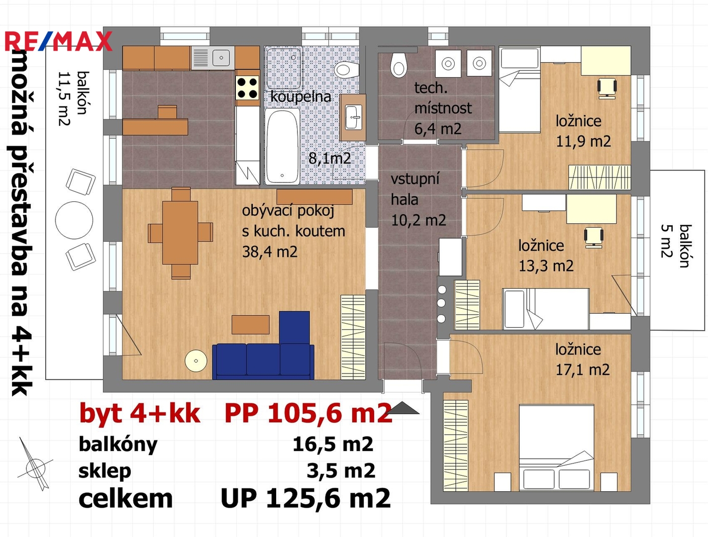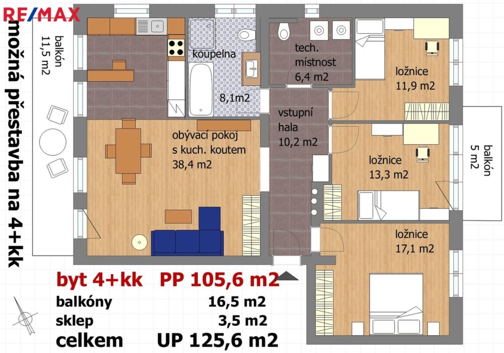 Současnou dispozici bytu 3+kk lze, v případě potřeby, snadno přestavět na praktickou dispozici 4 + kk, pouze vybudováním jedné příčky a přidáním dveří do větší ložnice (viz přiložené půdorysy bytu)