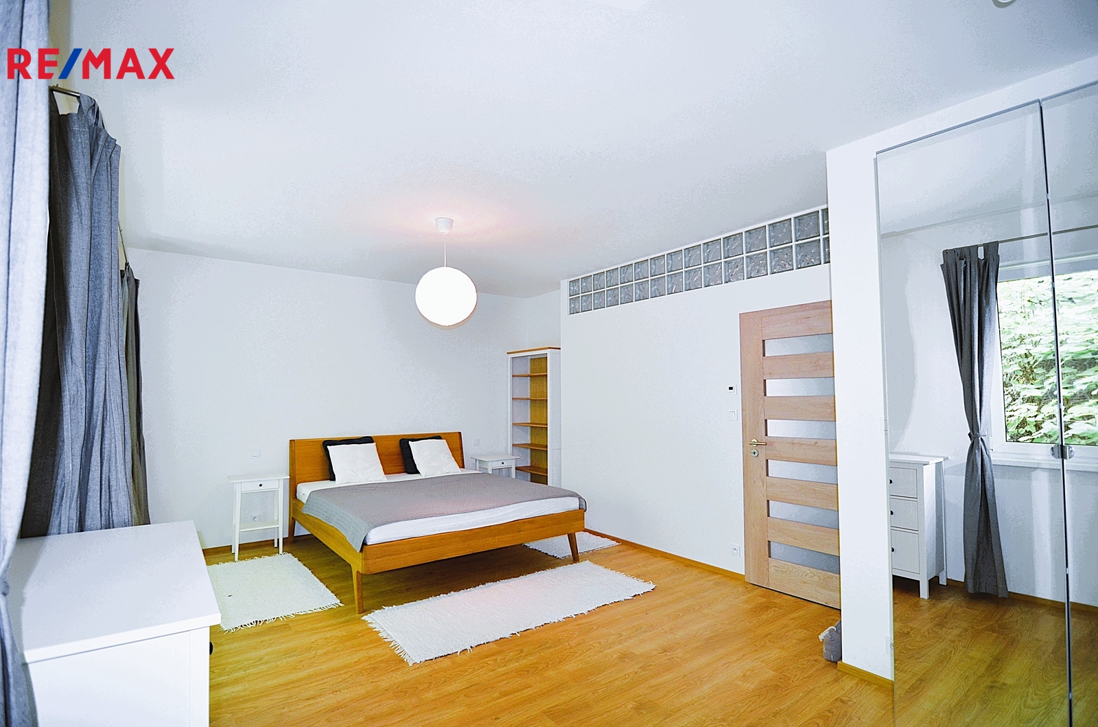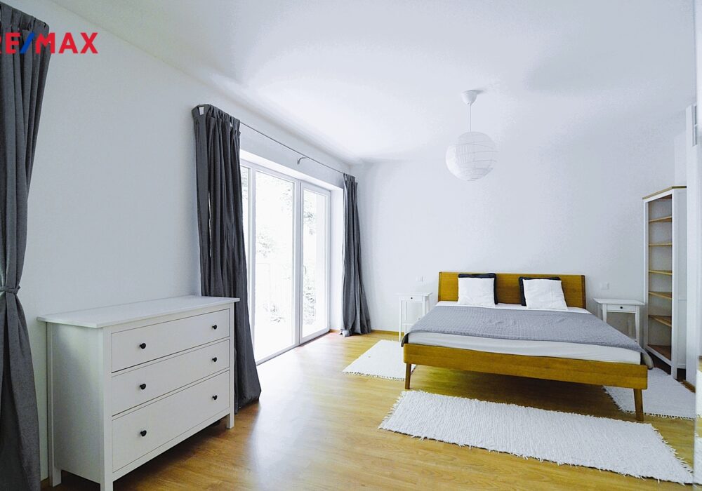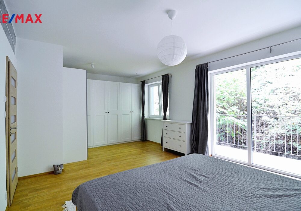 Byt se skládá ze světlého obývacího pokoje (38,4 m2) s kuchyňským koutem s mnoha okny na dvě světové strany a s výstupem na balkón o velikosti 11,5 m2. Dále z opravdu prostorné ložnice o velikosti 25,8 m2, s výstupem na druhý balkón o velikosti 5 m2 a další ložnice (17,1 m2), obě jsou orientované na východ. Prostorná světlá koupelna (8,1 m2) s přímým denním osvětlením je vybavena vanou, umyvadlem s koupelnovou skříňkou, WC a také sprchovým koutem. V technické místnosti (6,4 m2) je další WC s umyvadlem a bidetovou sprškou a také elektrický bojler, pračka a sušička. Z prostorné vstupní haly je vstup do všech místností v bytě. Je zde i možnost připojení krbu nebo krbových kamen. Samotný vstup do bytu je jištěn bezpečnostními dveřmi. Na podlahách je kvalitní dřevěná podlaha z masivu a velkoformátová dlažba, v koupelně pak působivá dlažba v patchwork designu. Dveře v bytě jsou dřevěné, částečně prosklené v obložkových zárubních. Okna jsou bílá, plastová.