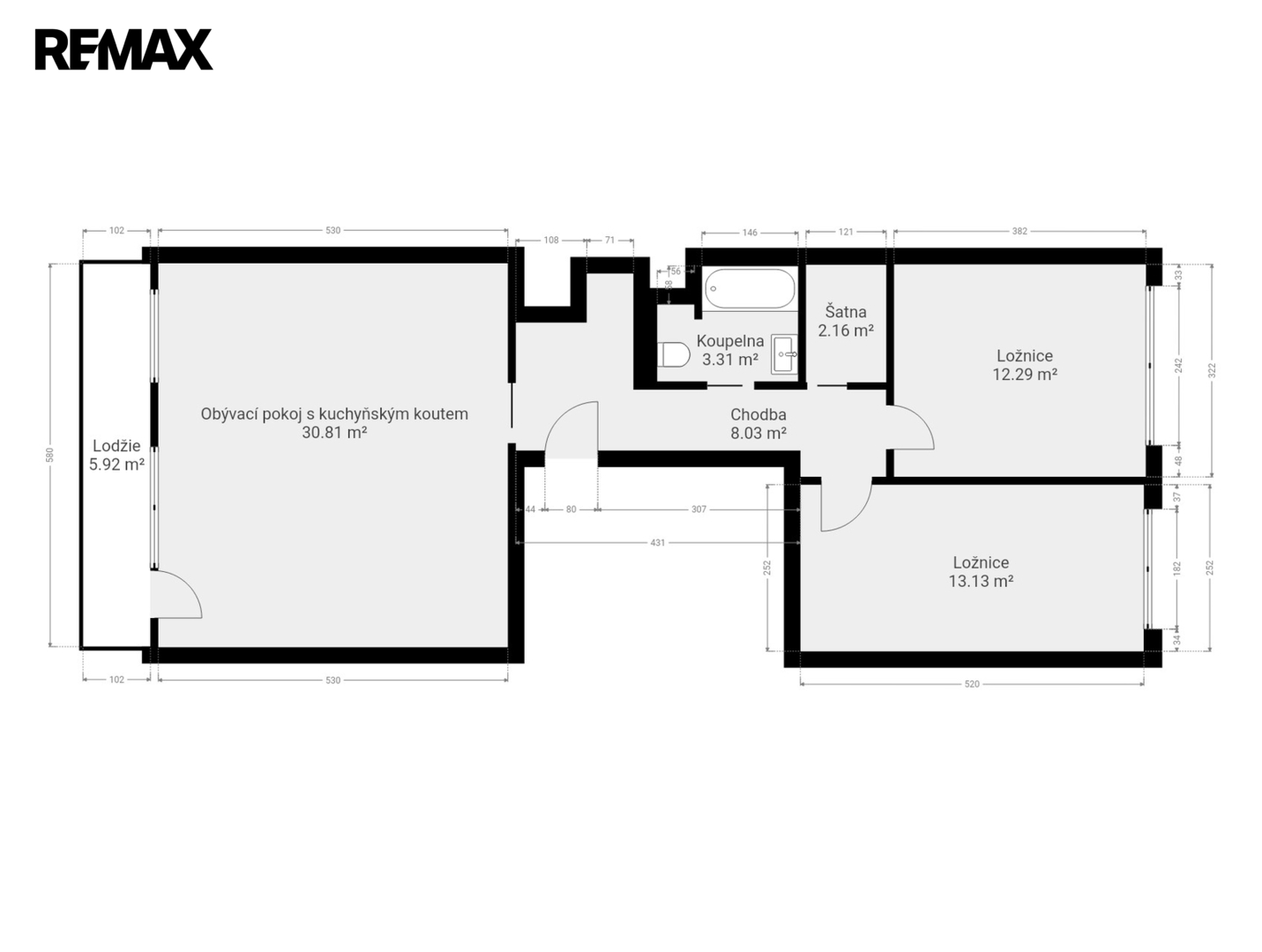 dispozice 3+kk, celková plocha 80 m²
