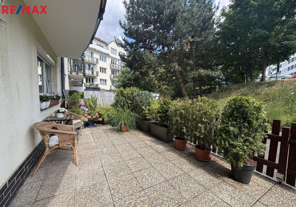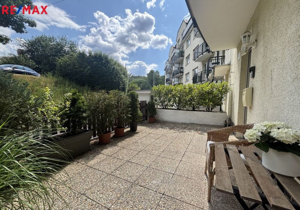 Velkou předností bytu je jeho umístění v klidném vnitrobloku a oplocená terasa, přes kterou se do bytu vstupuje. K bytu náleží garážové stání v domě a u domu je navíc vyhrazené parkoviště pouze pro rezidenty.
