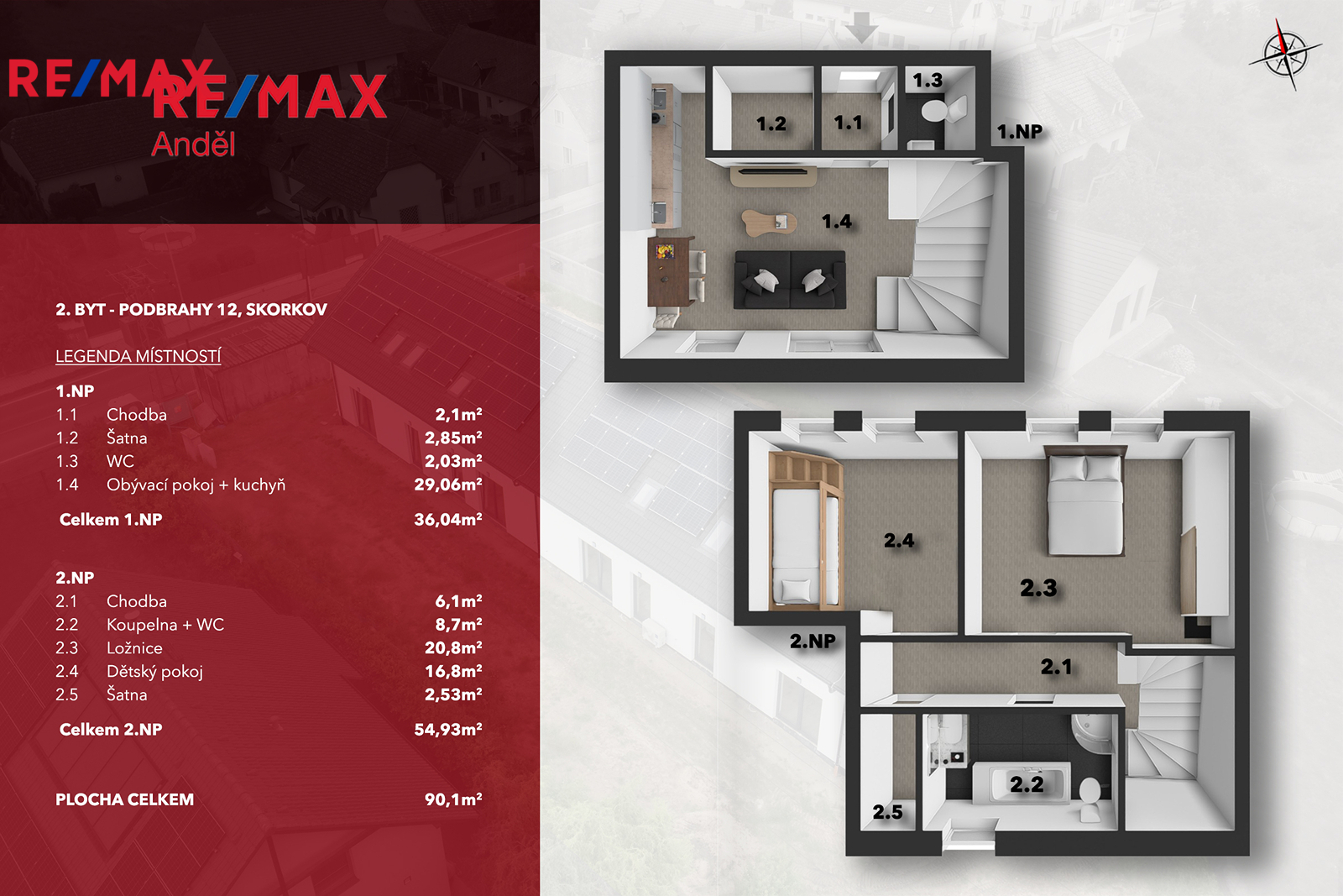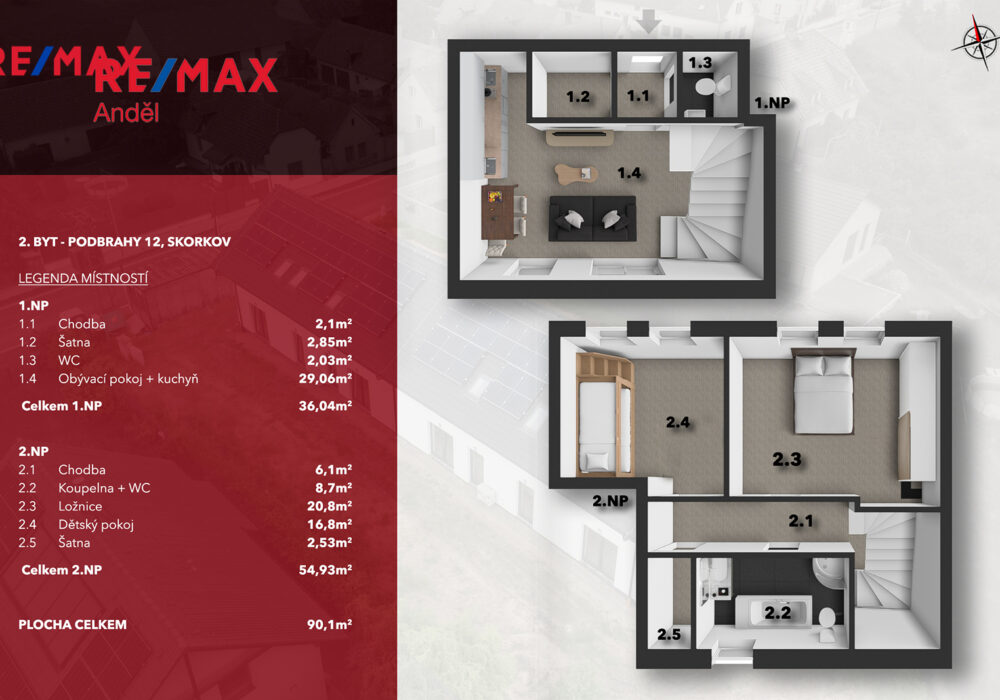 Moderně řešený mezonet o celkové ploše 90,1 m² nabízí pohodlné bydlení s důrazem na funkčnost.
