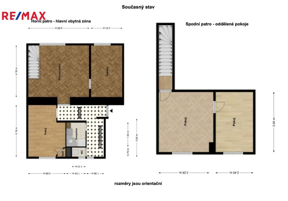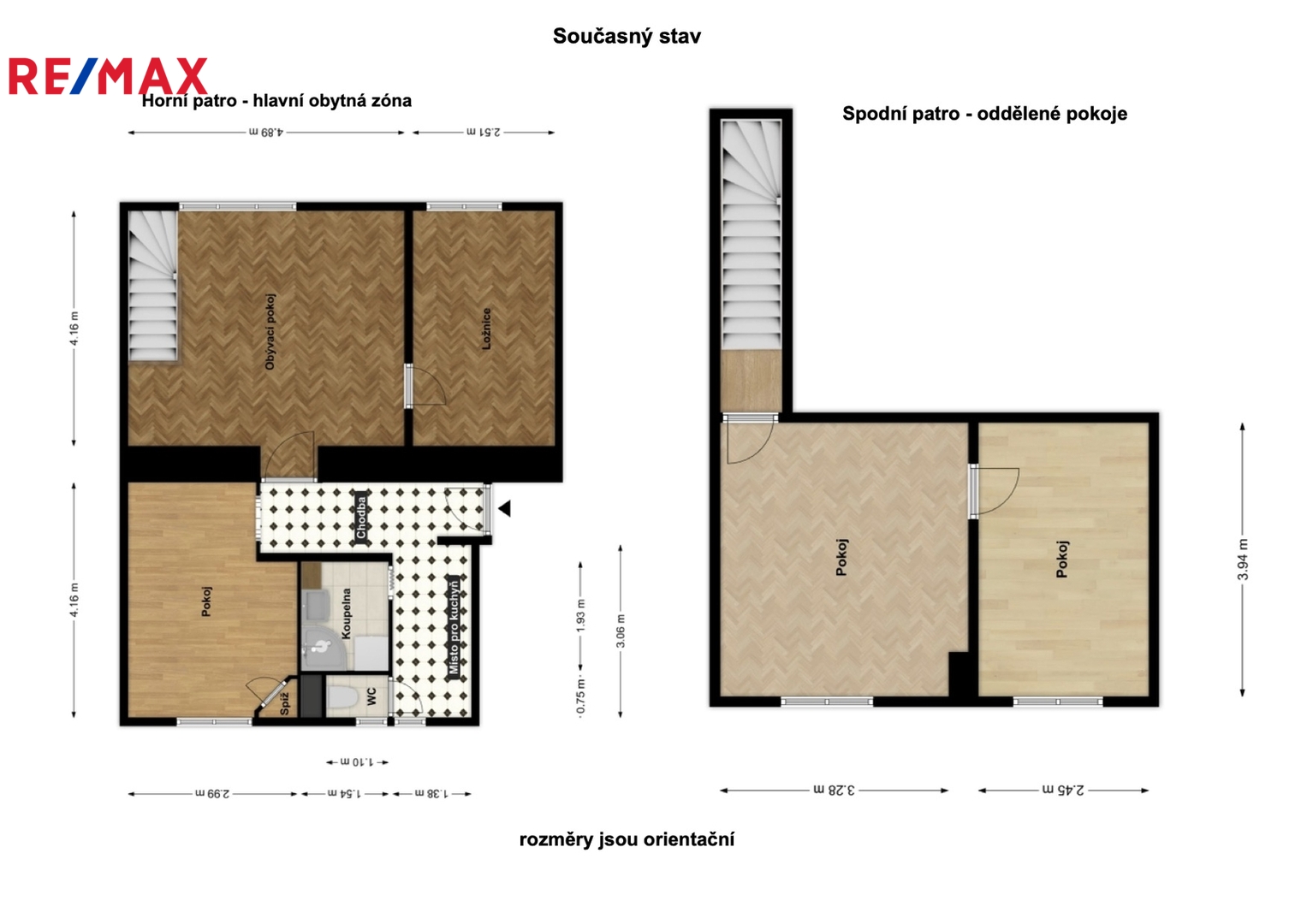 Byt původně 3+1 je upravený na 4+1 a nabízí zajímavé dvoupodlažní řešení. Hlavní obytná část se nachází ve zvýšeném přízemí a dva samostatné pokoje jsou umístěny v přízemním mezonetu. Právě tohle rozdělení dává bytu úplně jinou dynamiku než klasické dispozice.