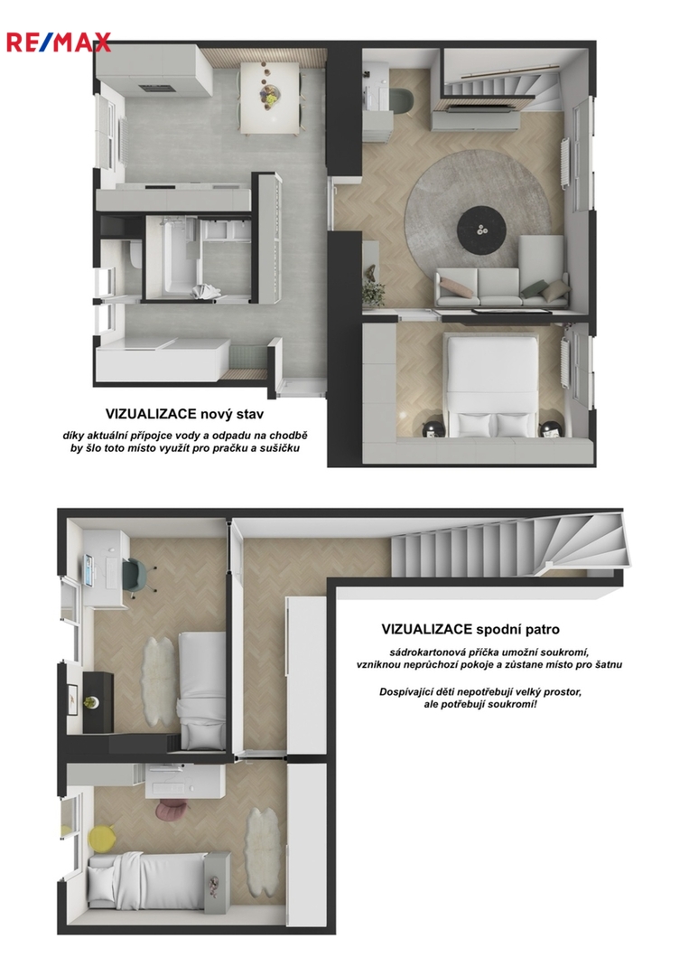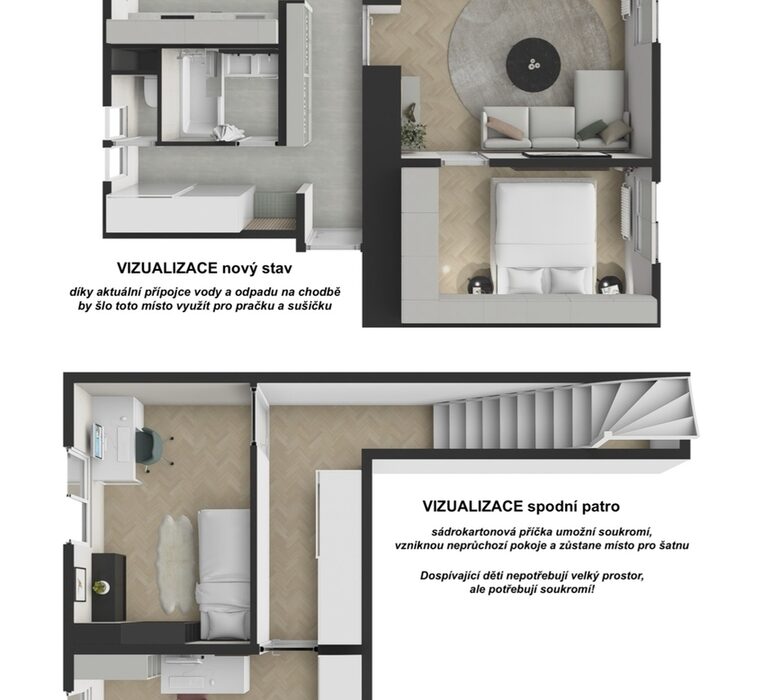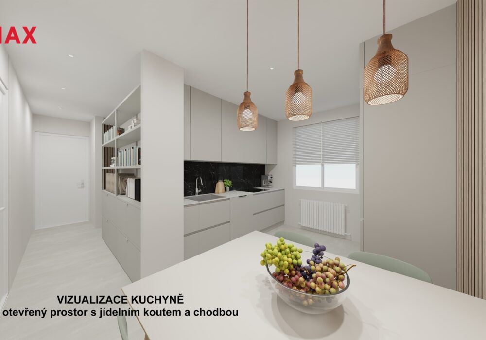 Je pravda, že byt je určen ke kompletní rekonstrukci. Čeká vás nová elektroinstalace, kuchyň, koupelna, povrchy a výměna dvou oken. Ano, znamená to investici času i peněz. Na druhou stranu získáte možnost vytvořit si zajímavý domov podle sebe, kde se budete cítit dobře. Kvalitní rekonstrukce může výrazně zvýšit hodnotu nemovitosti, což je příležitost i z investičního pohledu. Pro lepší představu o budoucím potenciálu bytu doporučujeme nahlédnout do připravených VIZUALIZACÍ.