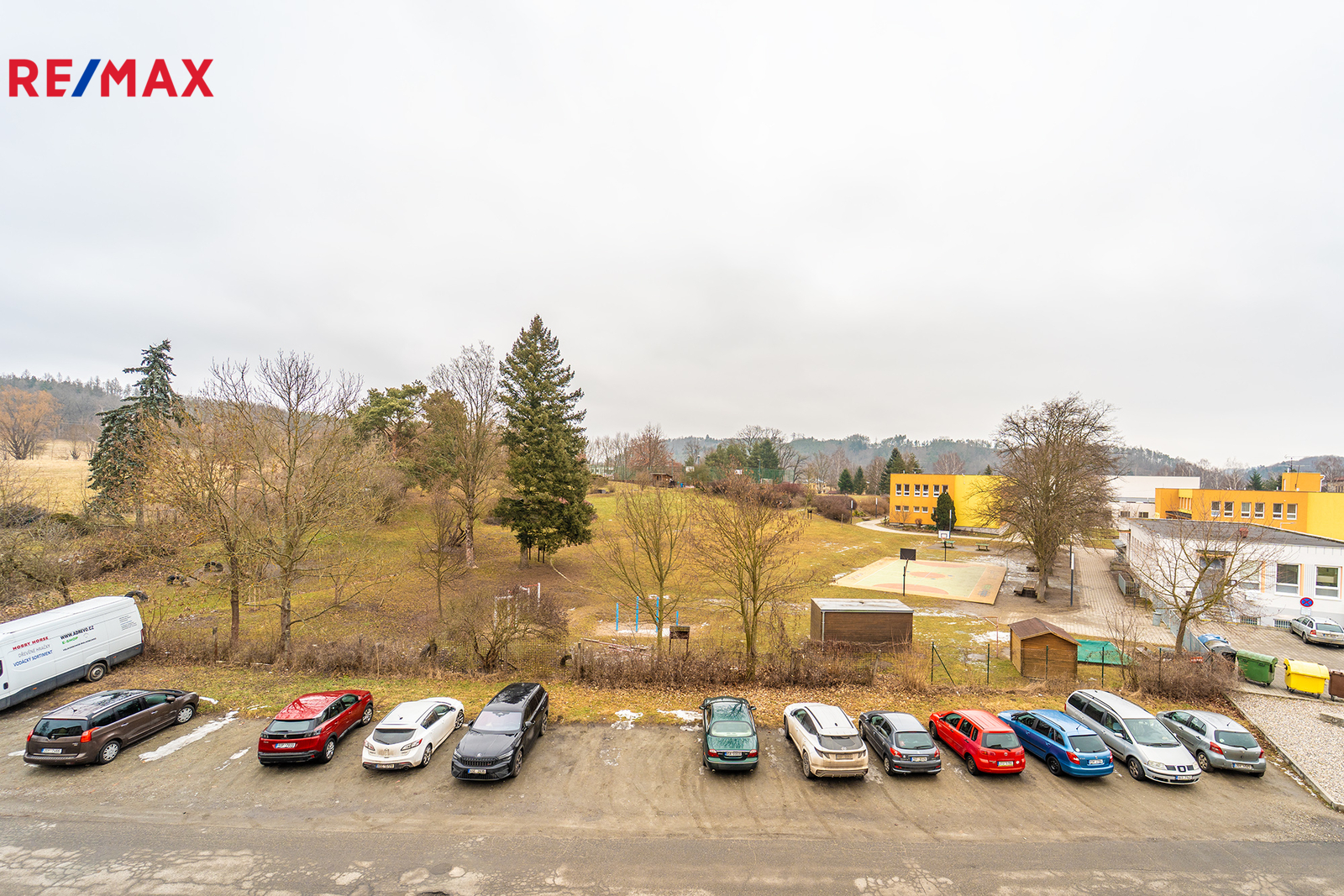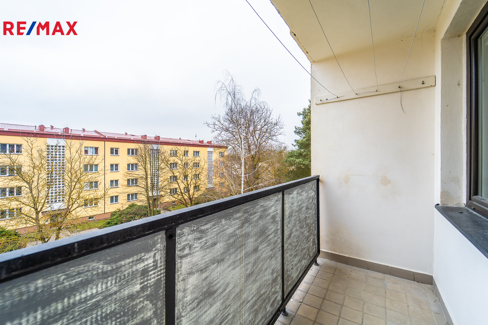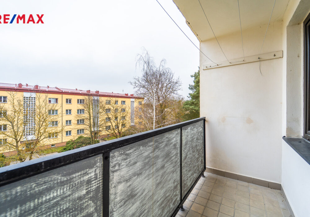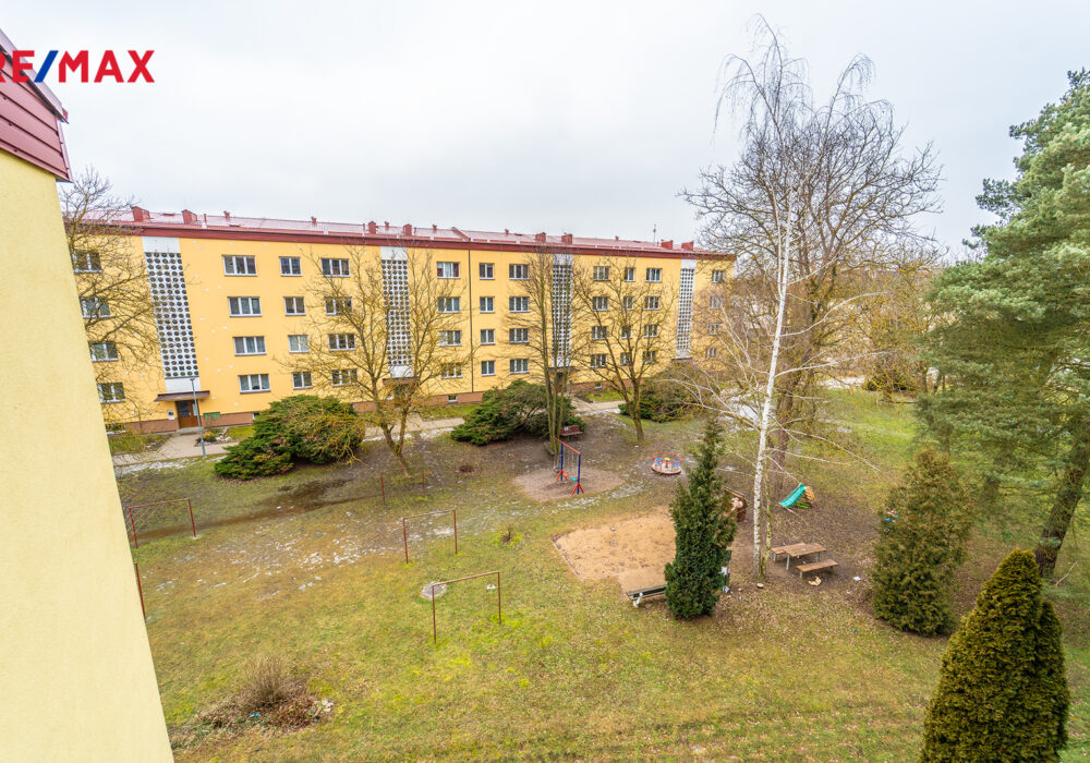 Výhled z balkonu je na jižní stranu do zeleně na dětské hřiště.