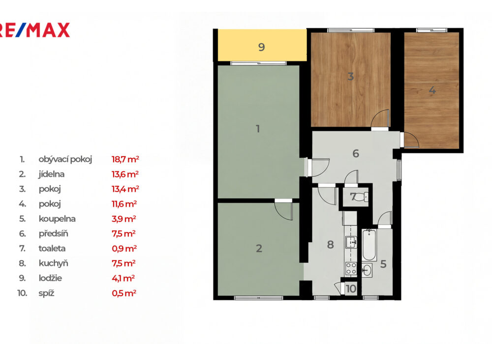 Dispoziční řešení bytu: Kuchyně se spíží, 4x pokoj, koupelna, samostatné WC, předsíň, lodžie. K bytu náleží prostorný sklep. Celková výměra zahrnuje lodžii a sklep. Podrobné rozkreslení včetně rozměrů naleznete v přiloženém půdorysu.