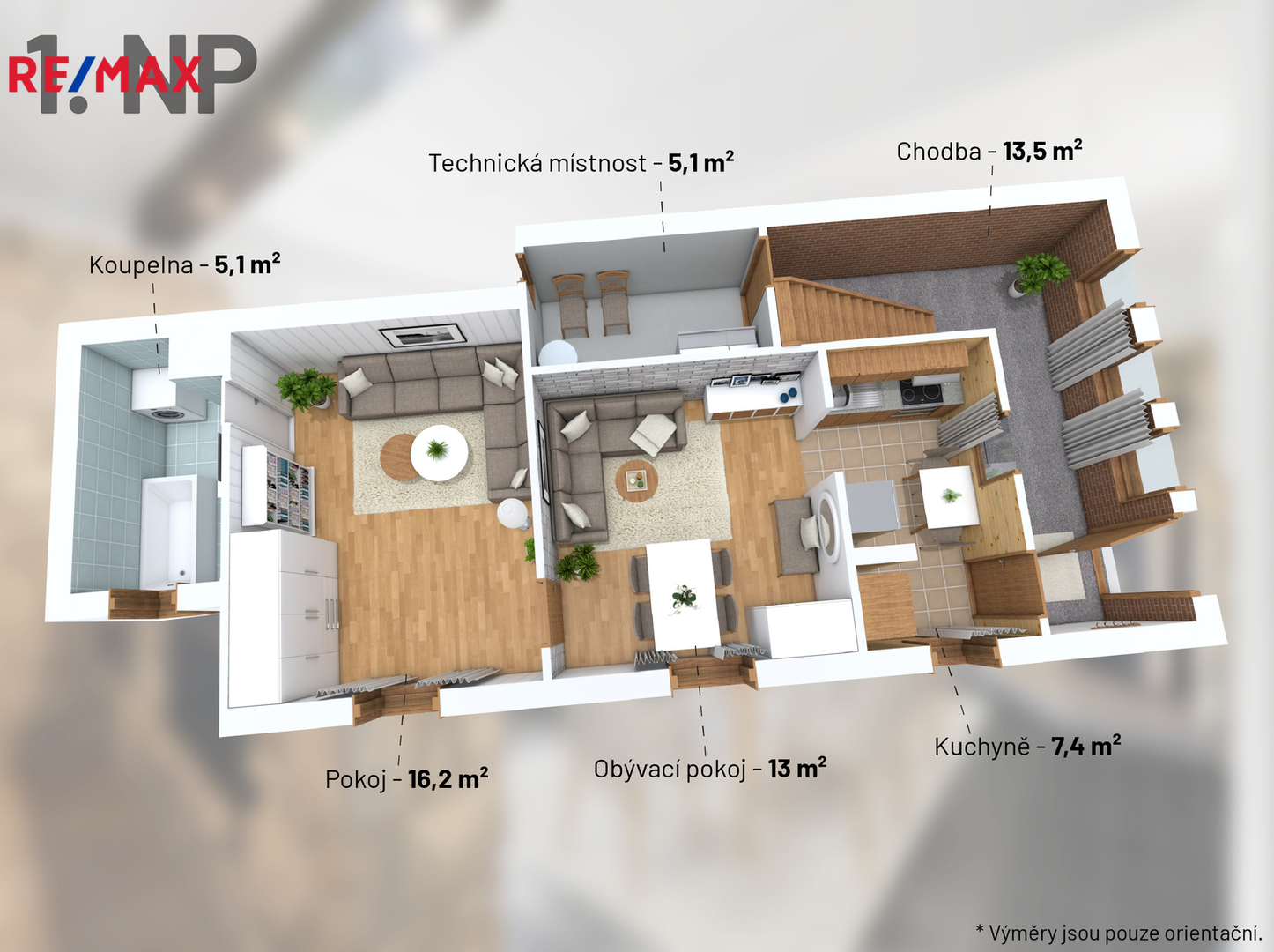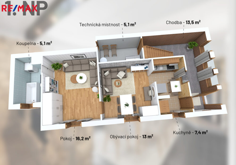 1.NP – vstupní chodba 13,5 m2, kuchyň 7,4 m2, obývací pokoj 13 m2, pokoj 16,2 m2, technická místnost 5,1 m2, koupelna 5,1 m2