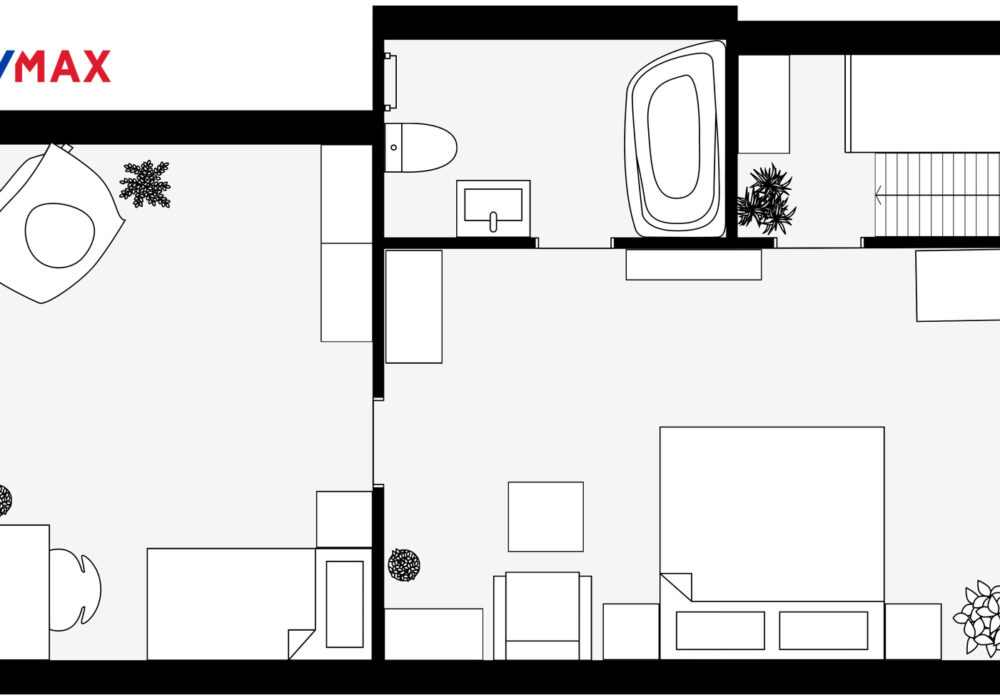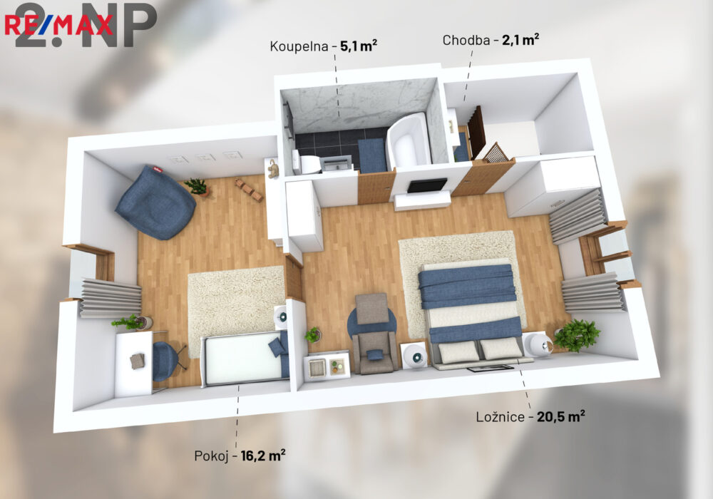 2.NP – pokoj 16,2m2, pokoj 20,5 m2, koupelna 5,1 m2, chodba 2,1 m2