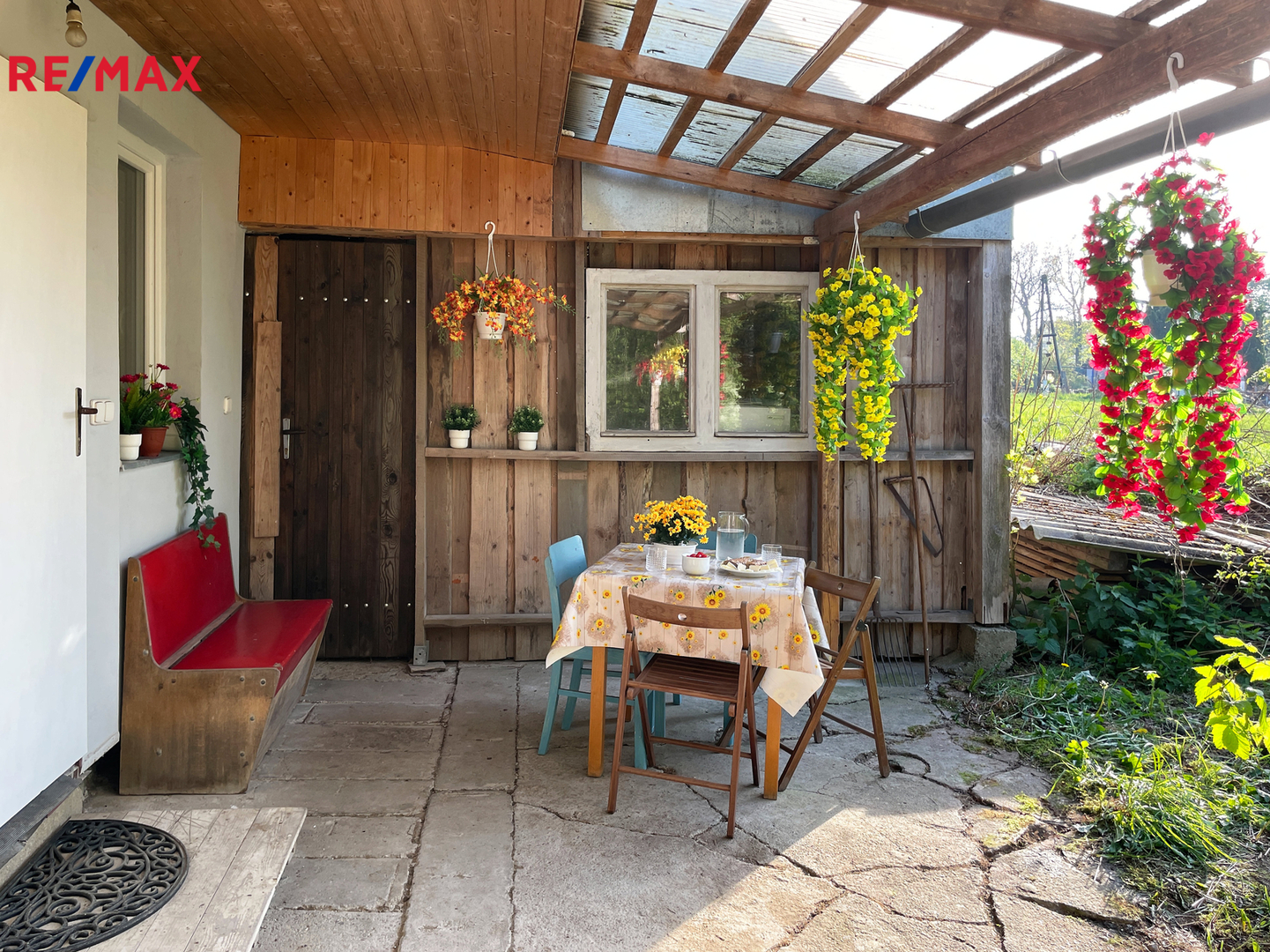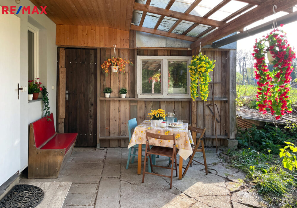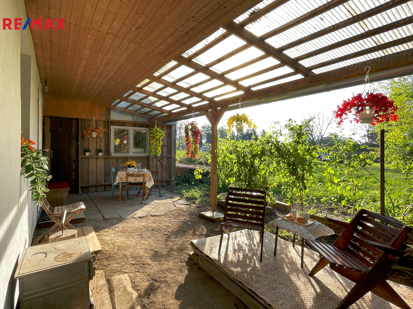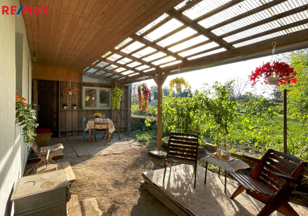 Na pozemku stojí zděný zahradní domek s užitnou plochou 21,3 m2 s dřevěnou pergolou (23,3 m2), na který navazuje dřevěná stodola (46,5 m2) a za ní je suché WC. Aktuálně probíhá řízení, aby tyto stavby byly zapsány v katastrální mapě s evidenčním číslem. Obytná část je napojená na elektřinu (230/400 V), obecní vodovod a kanalizační jímku. Stodola s okny slouží jako sklad nářadí a materiálu. Na pozemku se aktuálně nachází také dlouhá dřevěná maringotka, dvě vlečky na kolech a několik hromad řezaného dřeva (fošny, latě, otop).