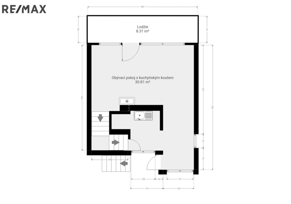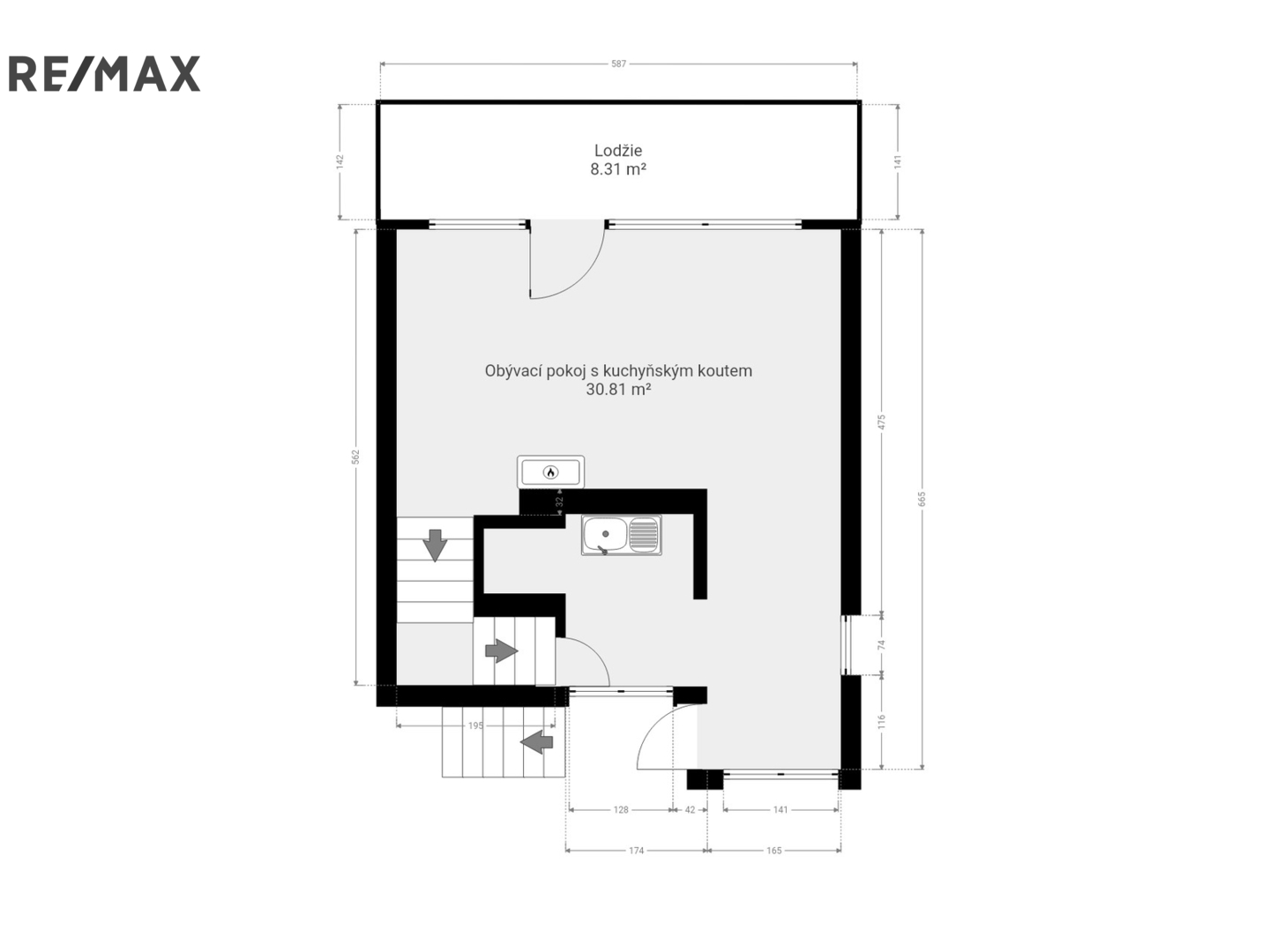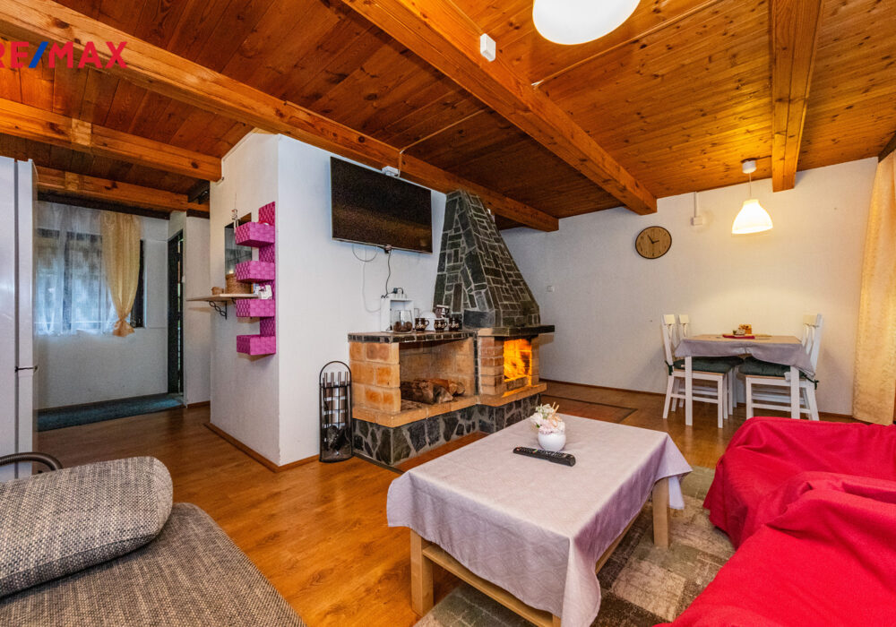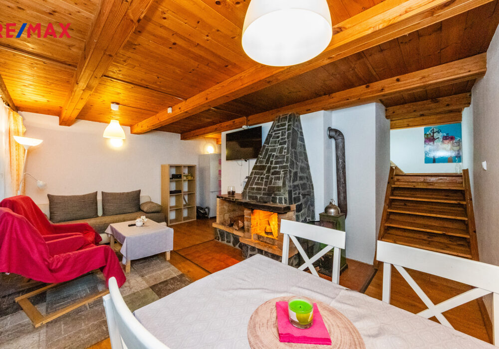 1. NP: Kuchynský kout, obývací pokoj s krbem a lodžií.