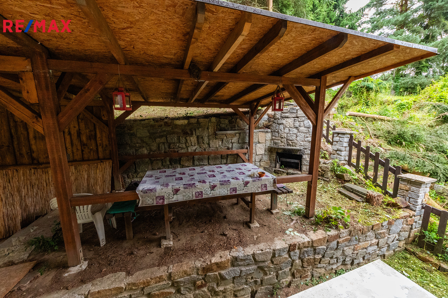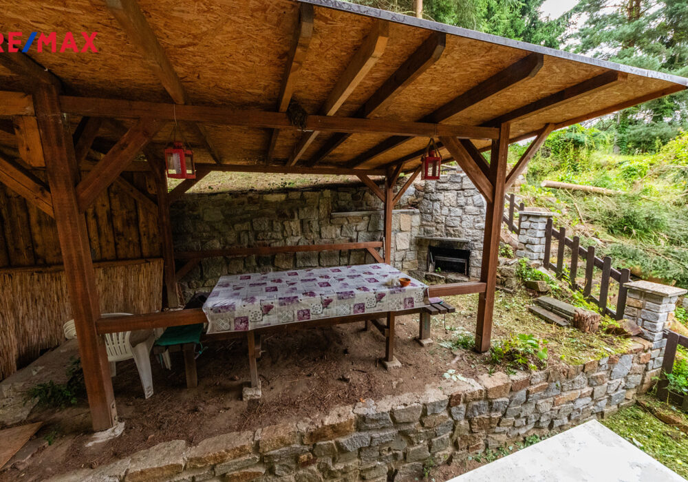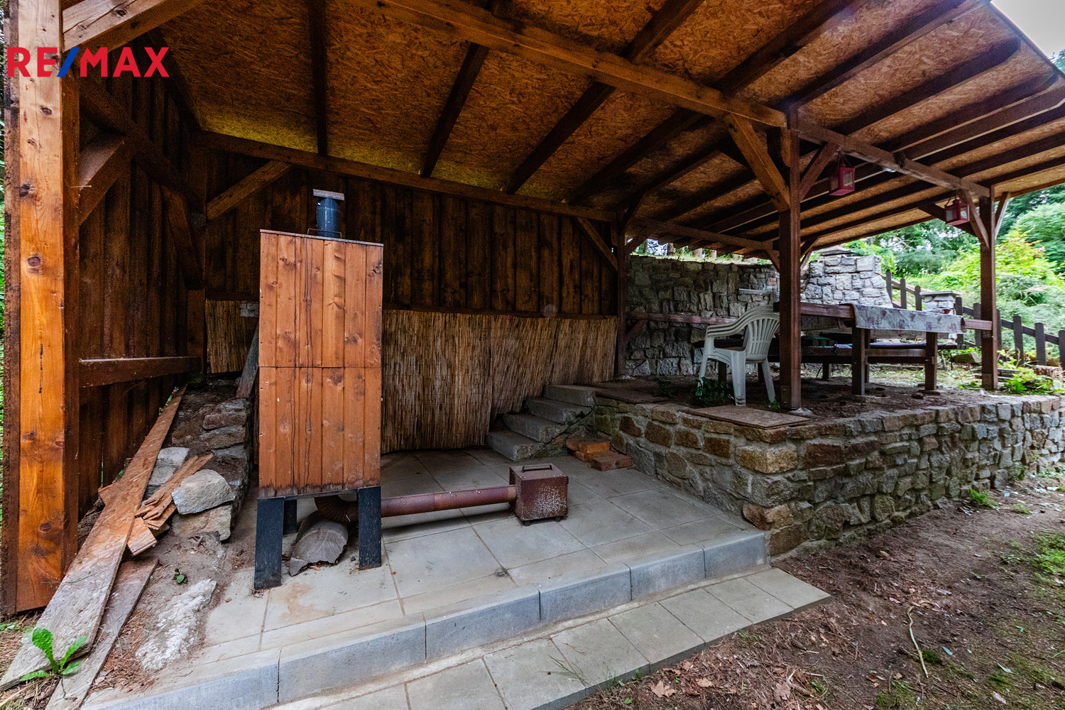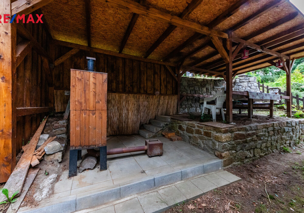 Za chatou pergola s venkovním krbem, udírnou a posezením v soukromí.