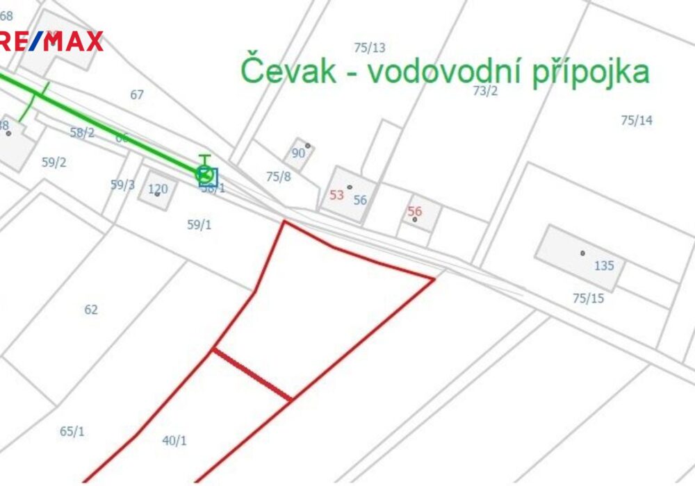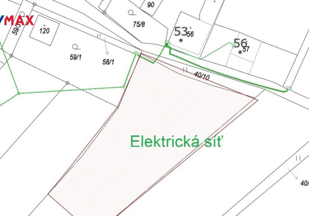 Elektrické vedení prochází okrajem pozemku a obecní vodovod je vzdálen cca 22 m od hranice pozemku. Viz. obrazová příloha inzerce.