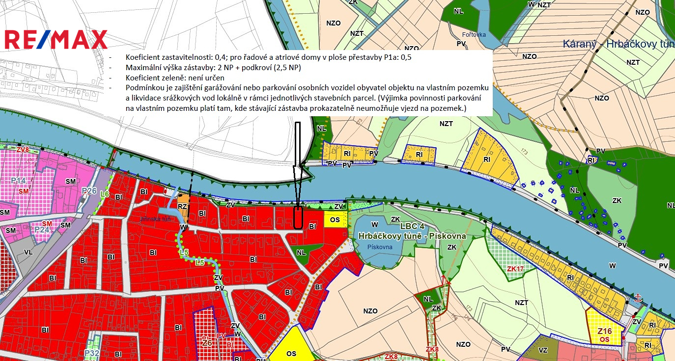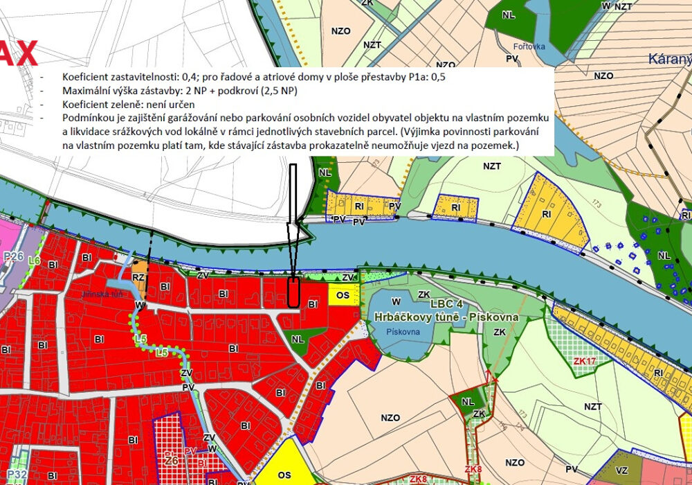 Podmínky ÚP: zastavitelnost (0,4), výška 2 NP + podkroví, parkování a likvidace srážkových vod na pozemku.