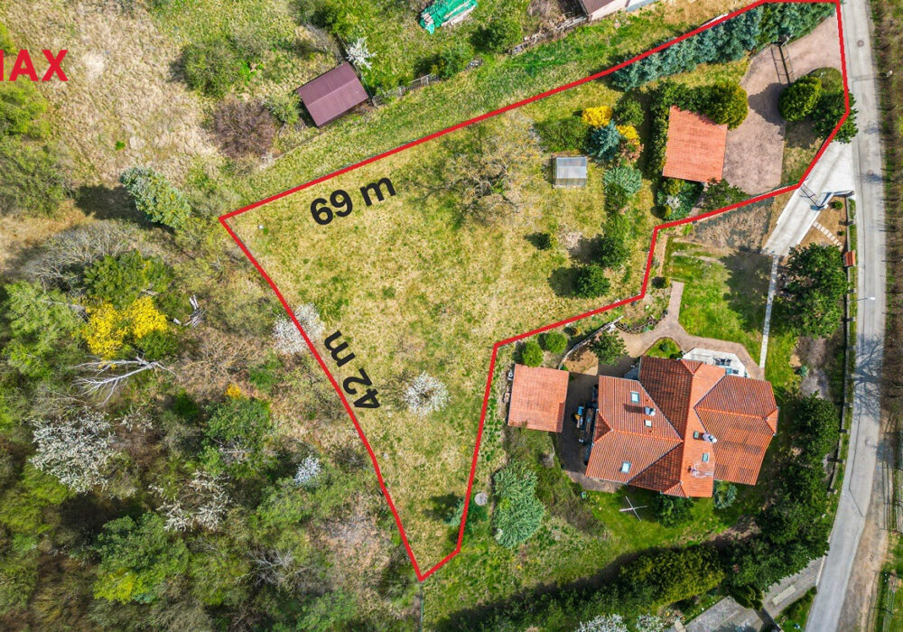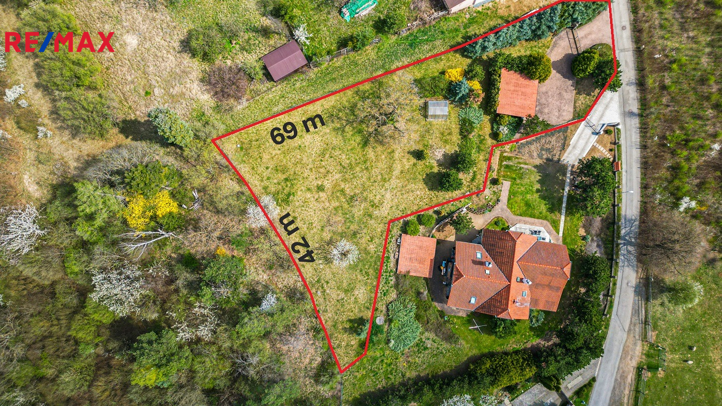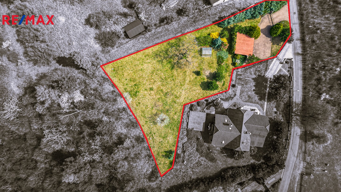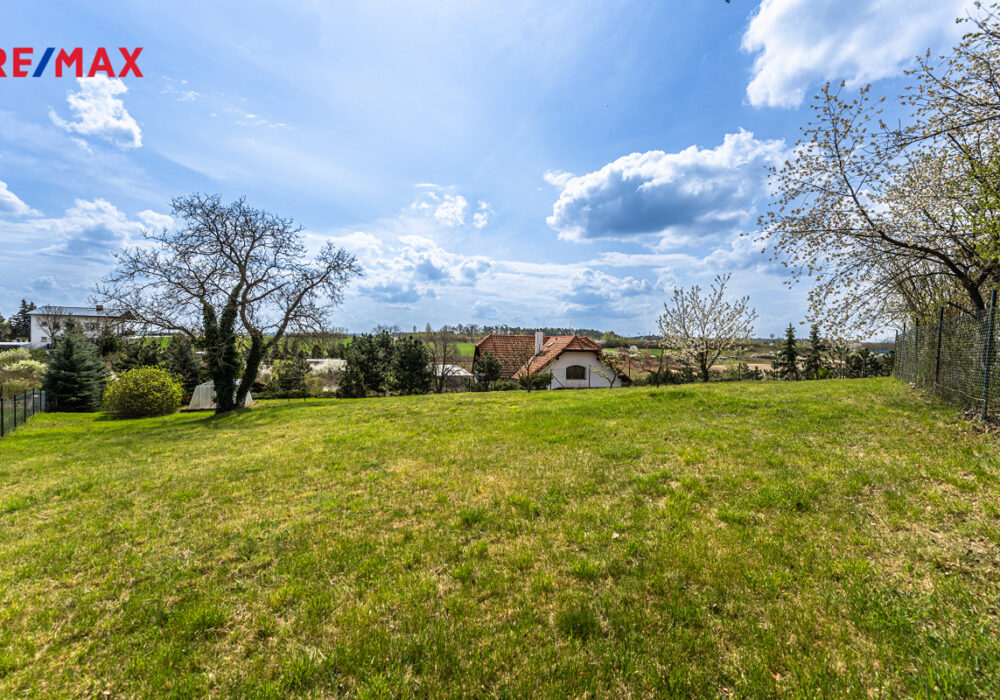 Nabízíme ke koupi zajímavý prostorný pozemek o velikosti 1550 m2, dle územního plánu spadající do kategorie OB-A, což umožňuje např. výstavbu bungalovu o zastavěné ploše až 310 m2 či dvoupodlažního domu o zastavěné ploše 150 až 200 m2. Pozemek se nachází uprostřed zástavby rodinných domů na mírně svažitém terénu s jižní orientací. Vjezd na pozemek je posuvnou bránou na dálkové ovládání z klidné komunikace s minimálním provozem, za vjezdovou bránou je prostranství ze zámkové dlažby a otevřená garáž pro dva automobily. Střecha garáže je šikmá, orientovaná na jih, tedy s možností umístit zde výhledově na střeše fotovoltaiku na nabíjení např. elektromobilů. Vpravo od garáže, při východní hraně pozemku, je pruh o šířce více než 6 metrů, kterým se dostanete na horní část pozemku vhodnou k zastavění rodinným domem. Tato nejširší část pozemku je už více rovinatá a je ze tří stran obklopena zelení, kde se, dle územního plánu, již nic dalšího v sousedství nemůže stavět, což garantuje budoucímu vlastníku dostatečný klid a soukromí a zeleň v okolí.