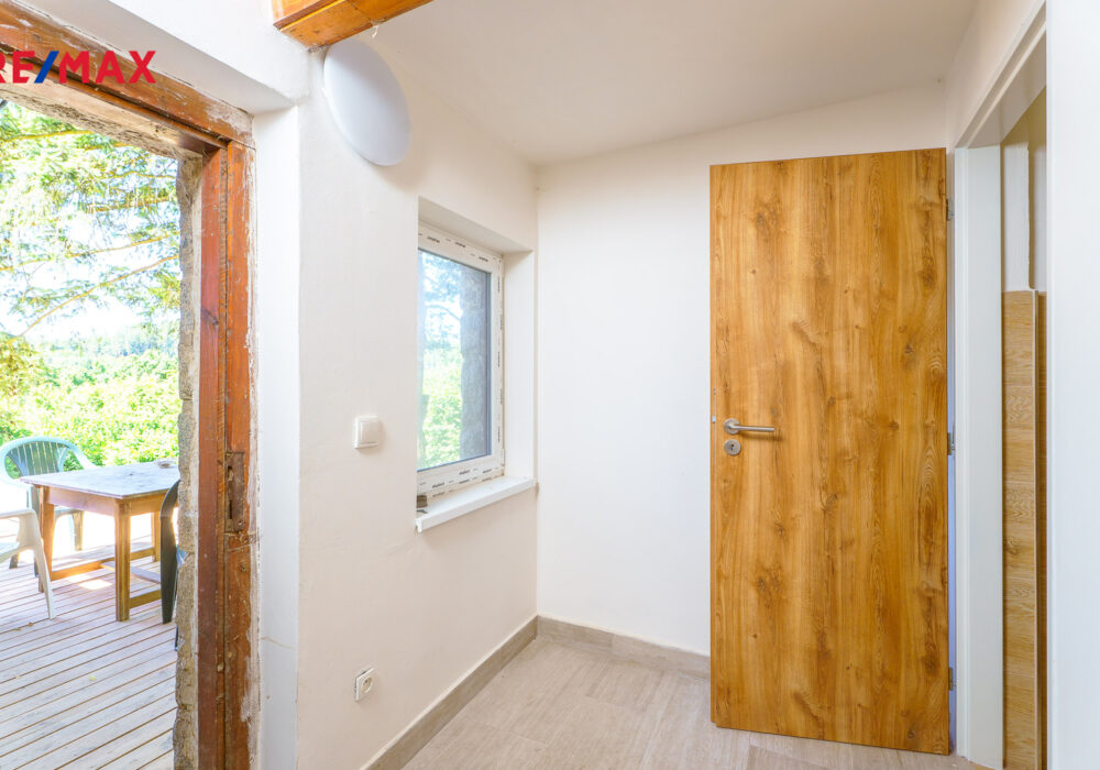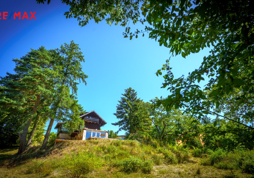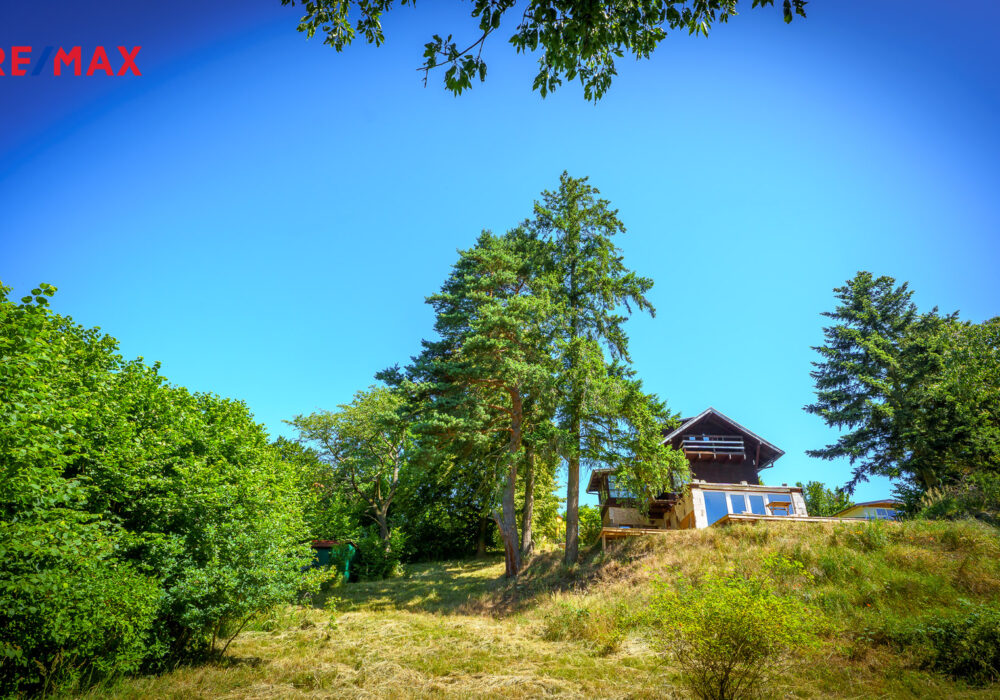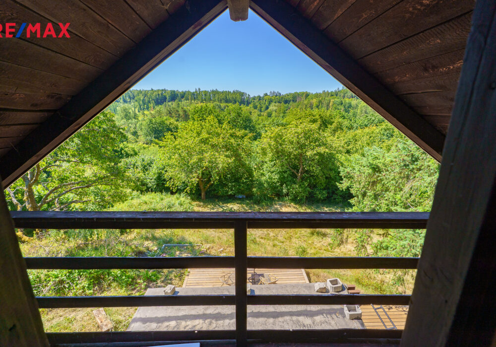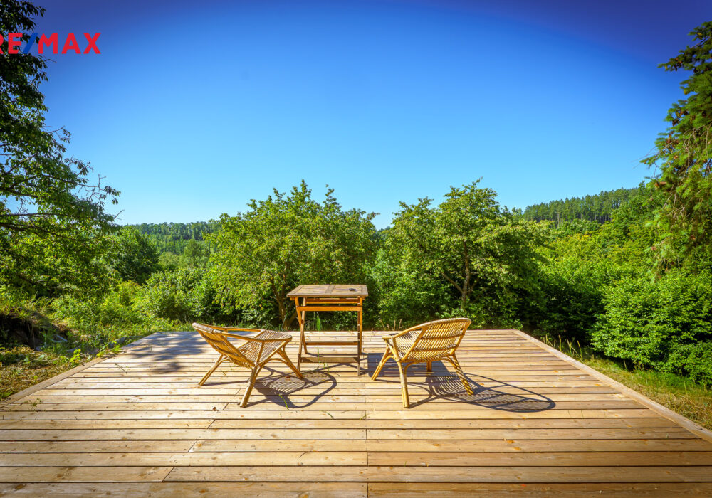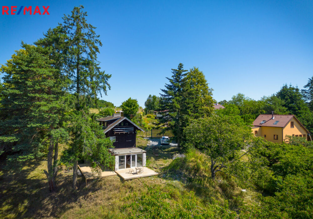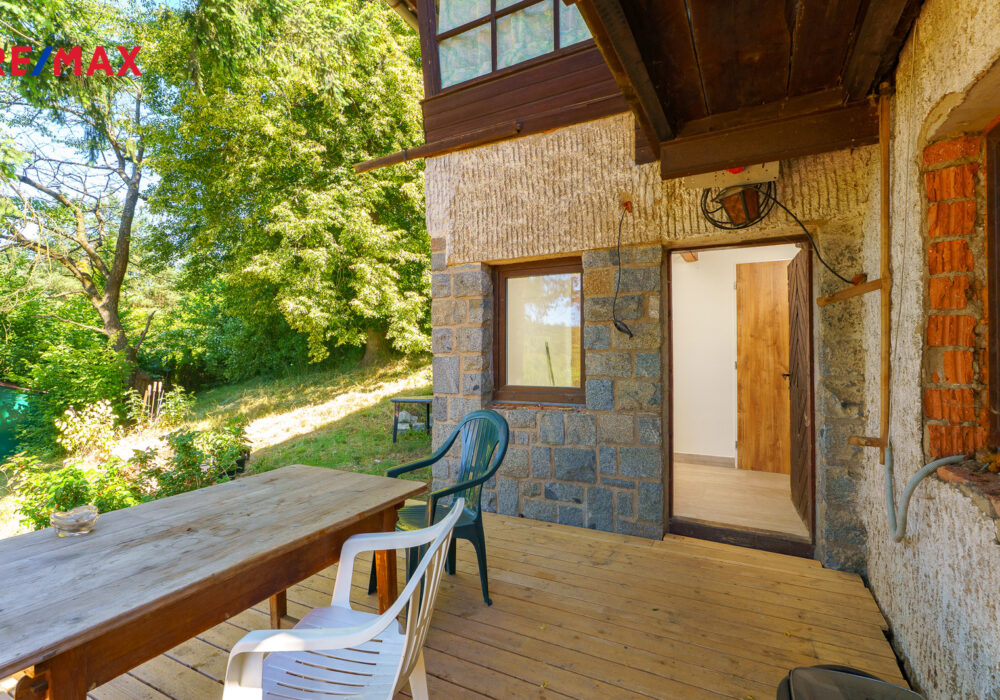 Za vjezdovými vraty má na rovině dvě parkovací místa a ještě v horní části dřevěnou chatu s velkou jižně orientovanou terasou.