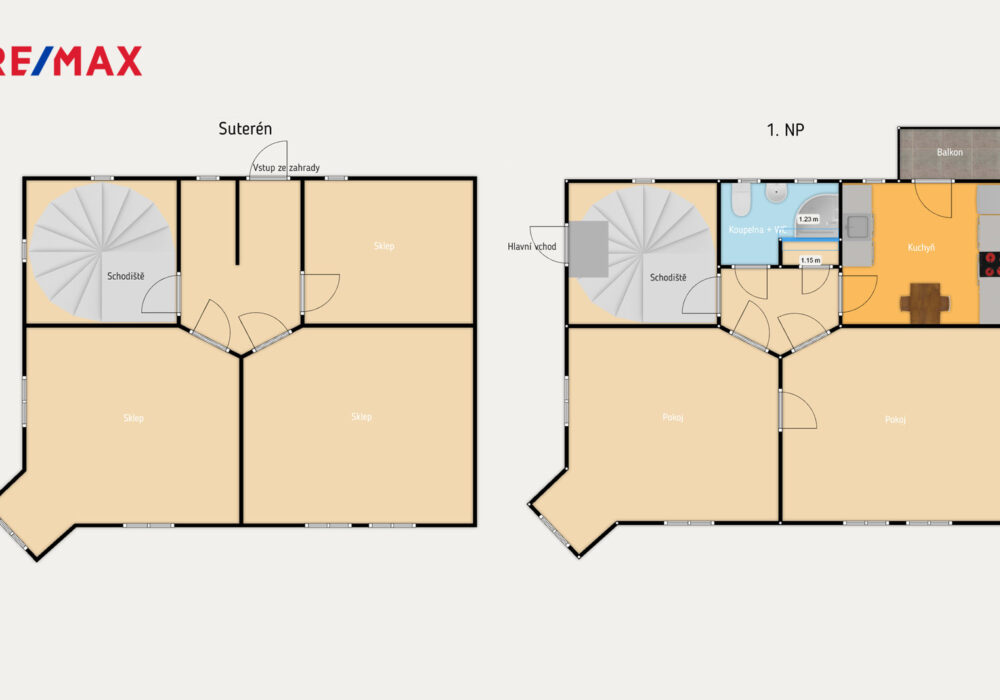 Suterén má samostatný vchod také ze zahrady. Je zde předsíň a 3 sklepní místnosti (původně sklep, prádelna a sklad potravin).