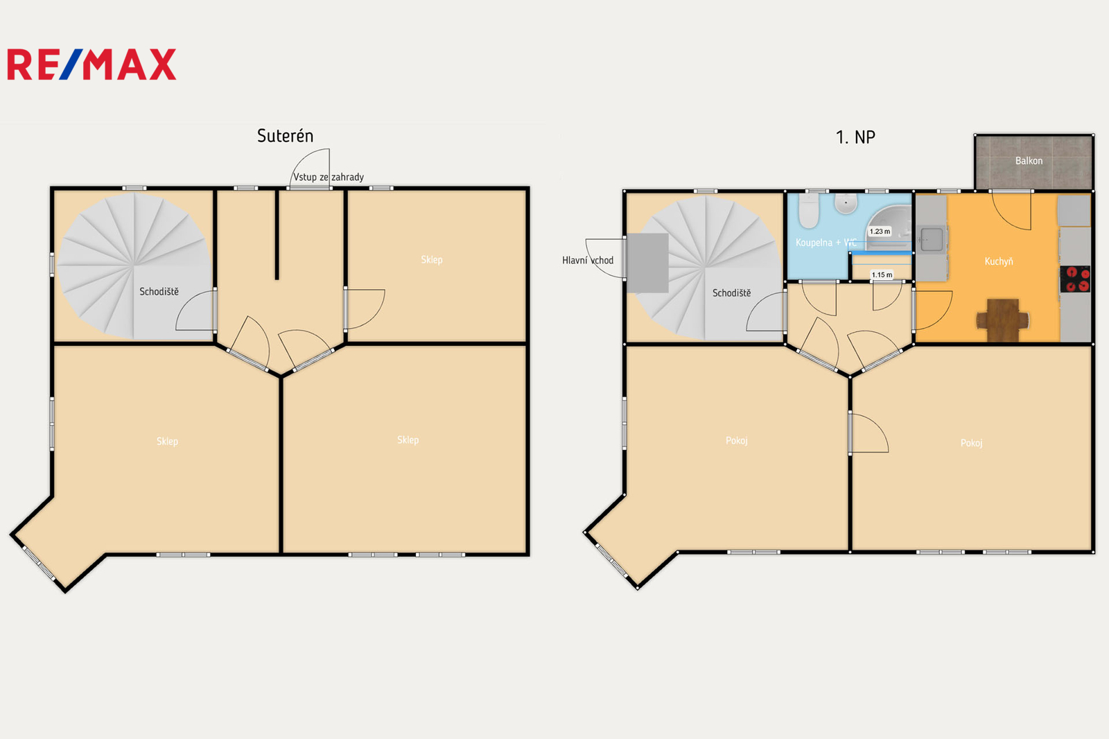 V prvním nadzemním podlaží se z předsíně vstupuje do kuchyně, dvou pokojů a koupelny se sprchou a WC.
