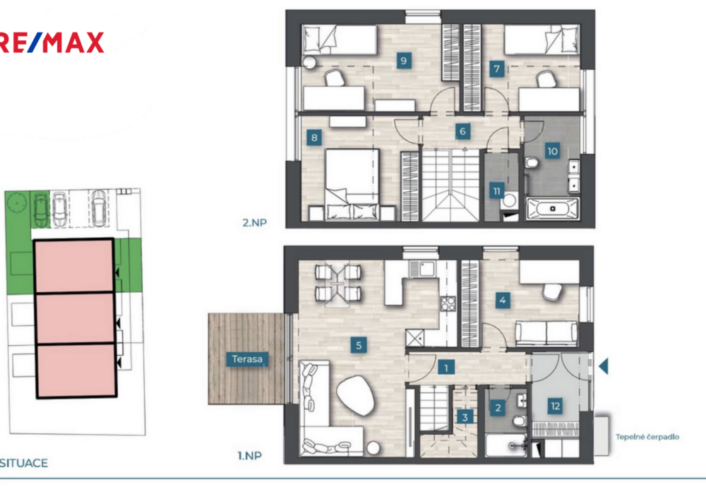 Každý dům nabízí do detailu promyšlenou dispozici 5+kk – 4 samostatné pokoje, obývací pokoj s kuchyňským koutem, 2 koupelny a technickou místnost. Venku posedíte na terase či na zahradě a před domem zaparkujete dva své vozy.