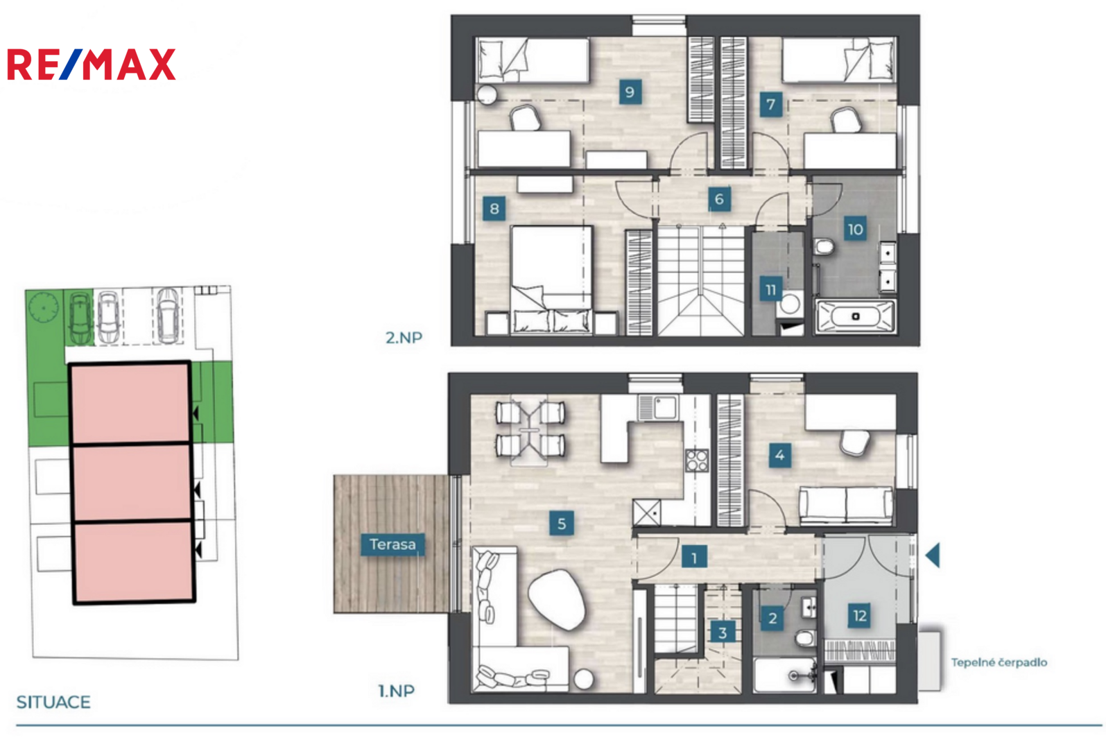 Každý dům nabízí do detailu promyšlenou dispozici 5+kk – 4 samostatné pokoje, obývací pokoj s kuchyňským koutem, 2 koupelny a technickou místnost. Venku posedíte na terase či na zahradě a před domem zaparkujete dva své vozy.