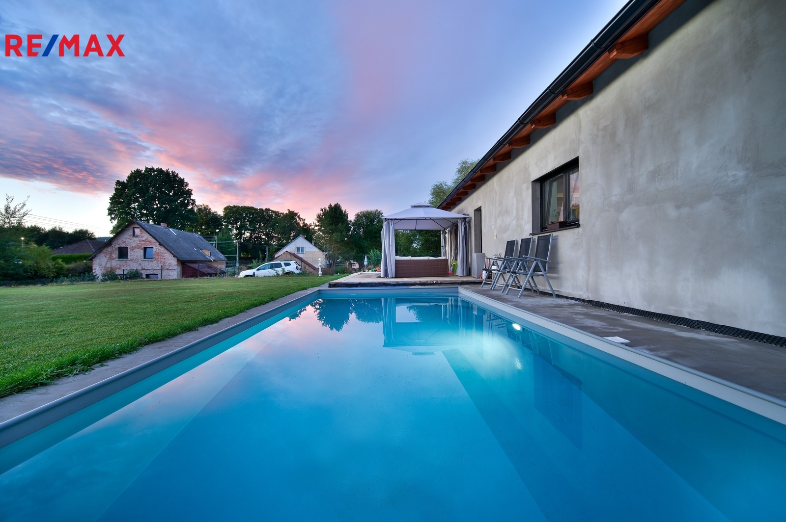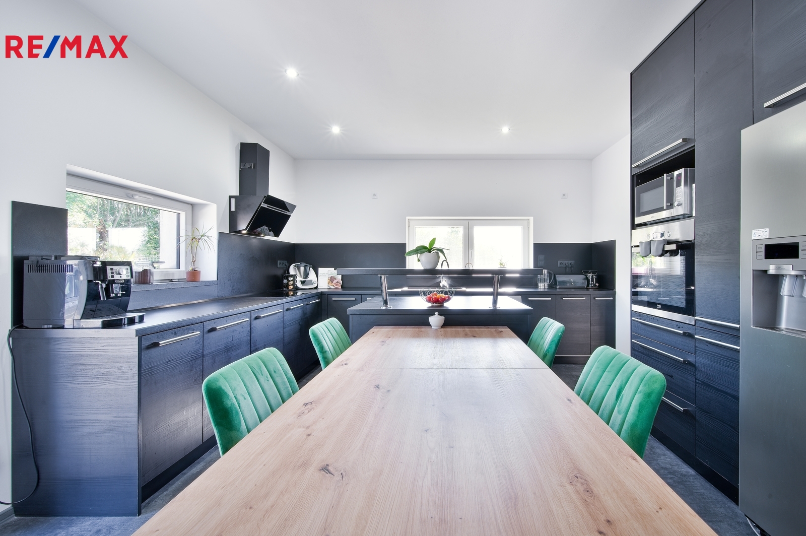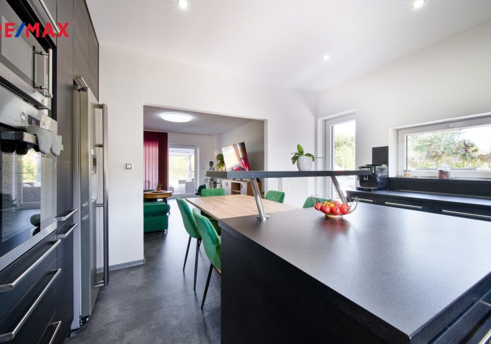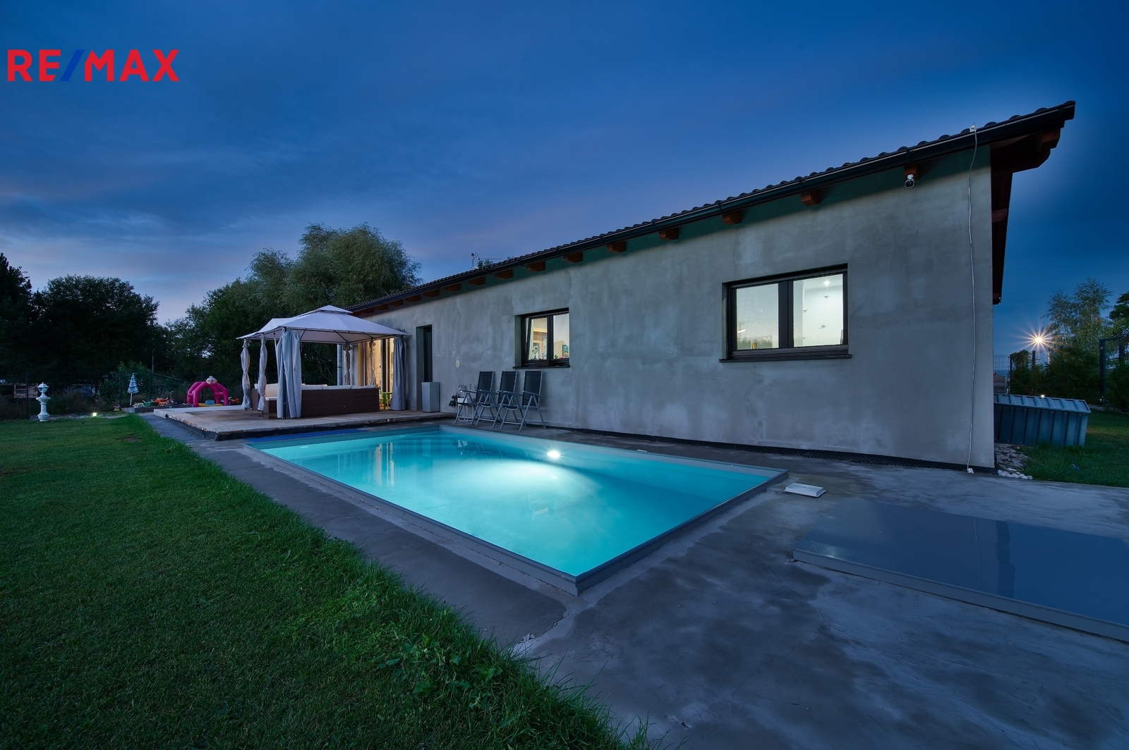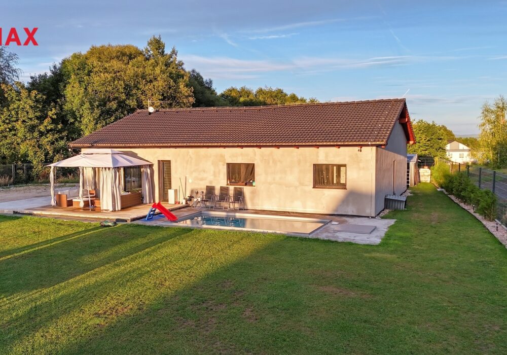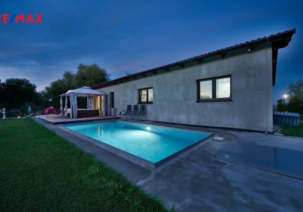Zděný dům byl kolaudován v roce 2022, má skvěle promyšlenou dispozici i pro početnější rodinu. Výstup z obývacího pokoje přímo na terasu k bazénu (s protiproudem), je přesně to co chcete při teplých letních dnech. Obývací pokoj spolu s krásnou designovou kuchyní disponuje bezmála 40m2. Technická místnost (prádelna) s toaletou je přesně to co ocení každá žena v domácnosti, stejně tak jako šatní místnost přímo u hlavní ložnice. Dětské pokoje jsou zde dva, které jsou přes chodbu od hlavní ložnice a každý člen rodiny tím získává dostatek soukromí.