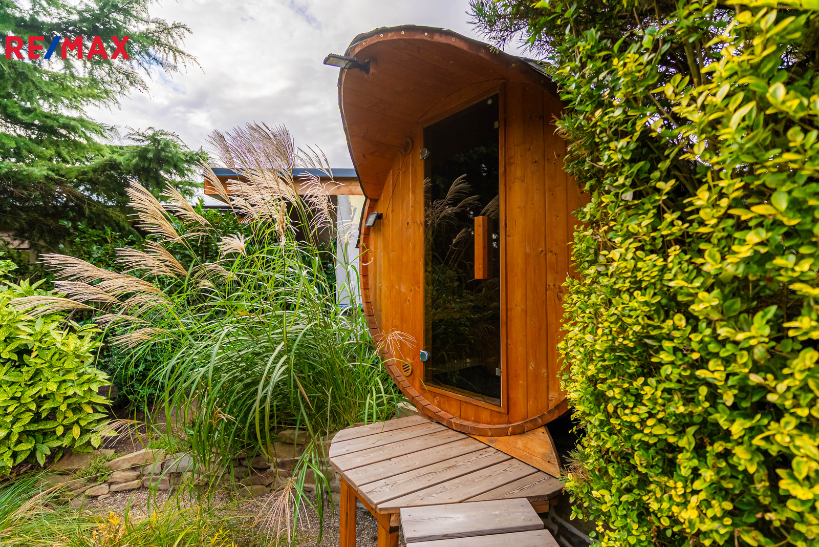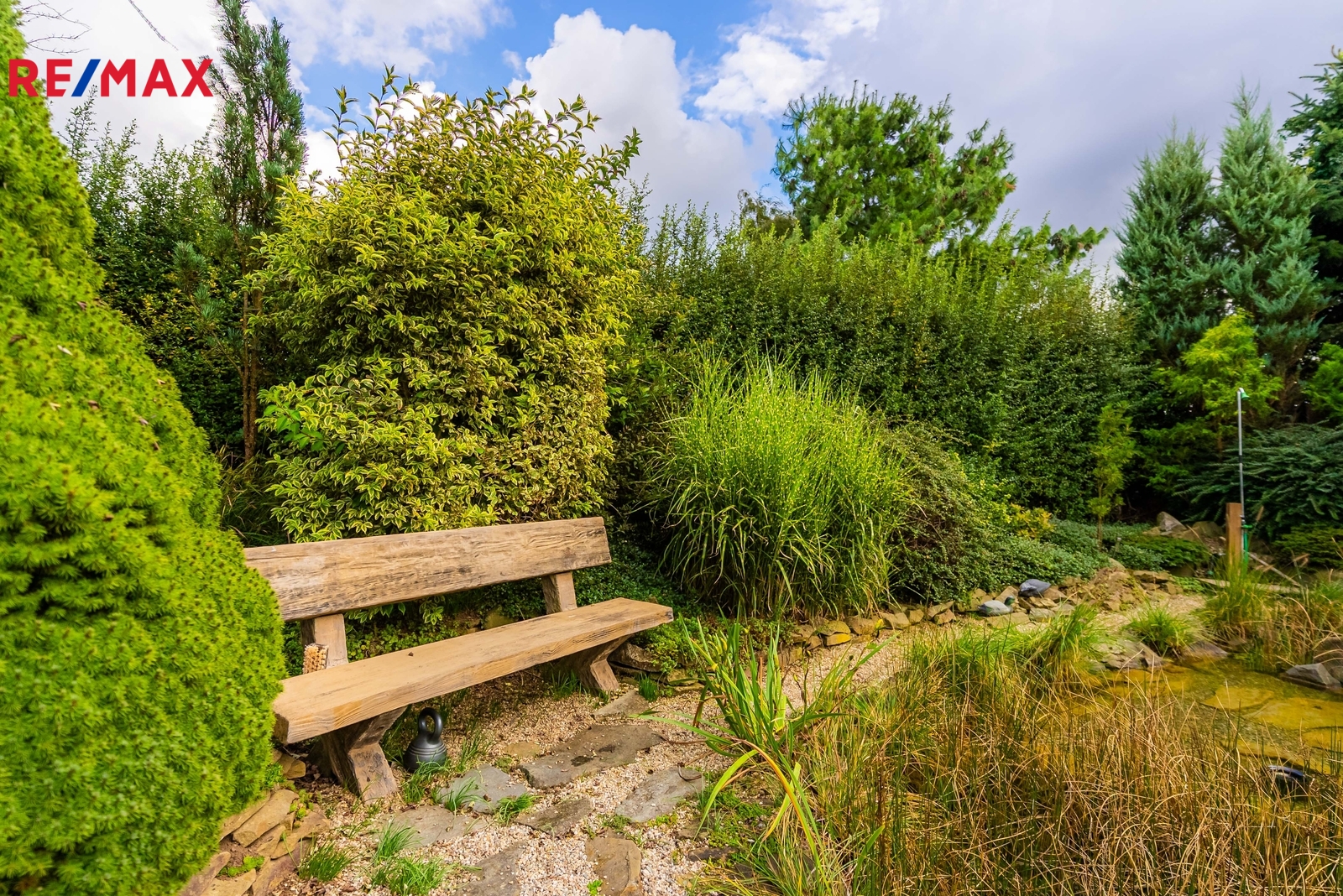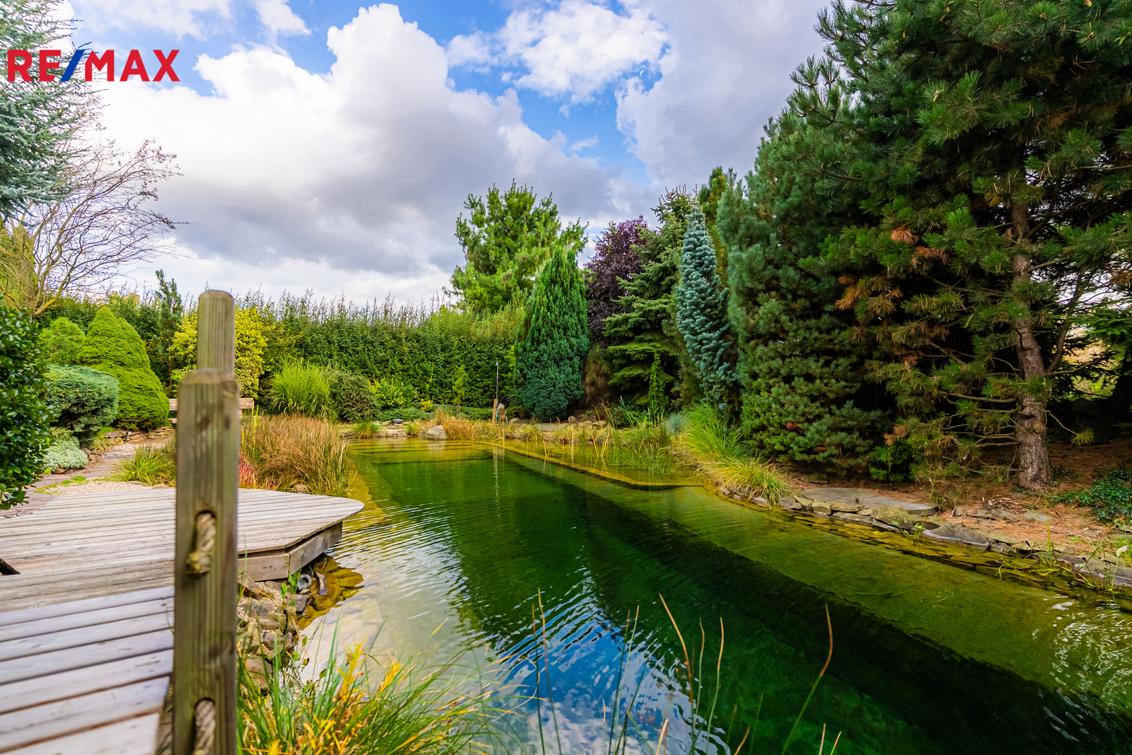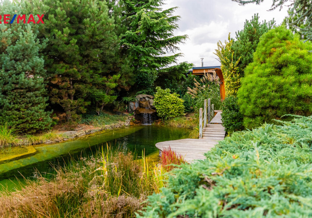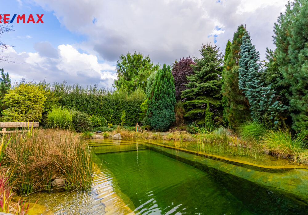 Největší předností je zahrada orientovaná na jihozápad, kde si vychutnáte slunce od odpoledne až do večera. Dominantou pozemku je velké koupací jezírko – biotop (cca 17 × 4 m), které slouží nejen k osvěžení, ale i k plavání. Atmosféru doplňuje finská sauna, venkovní gril a vzrostlé stromy – cedr, borovice, smrk i jedle. Na zahradě je automatické zavlažování a vlastní studna.