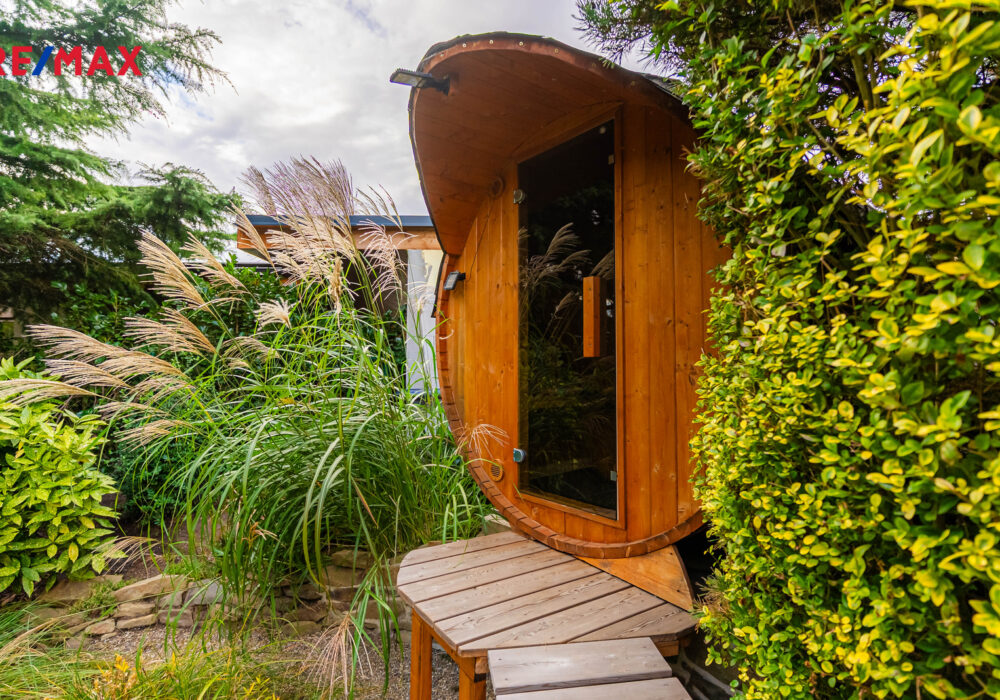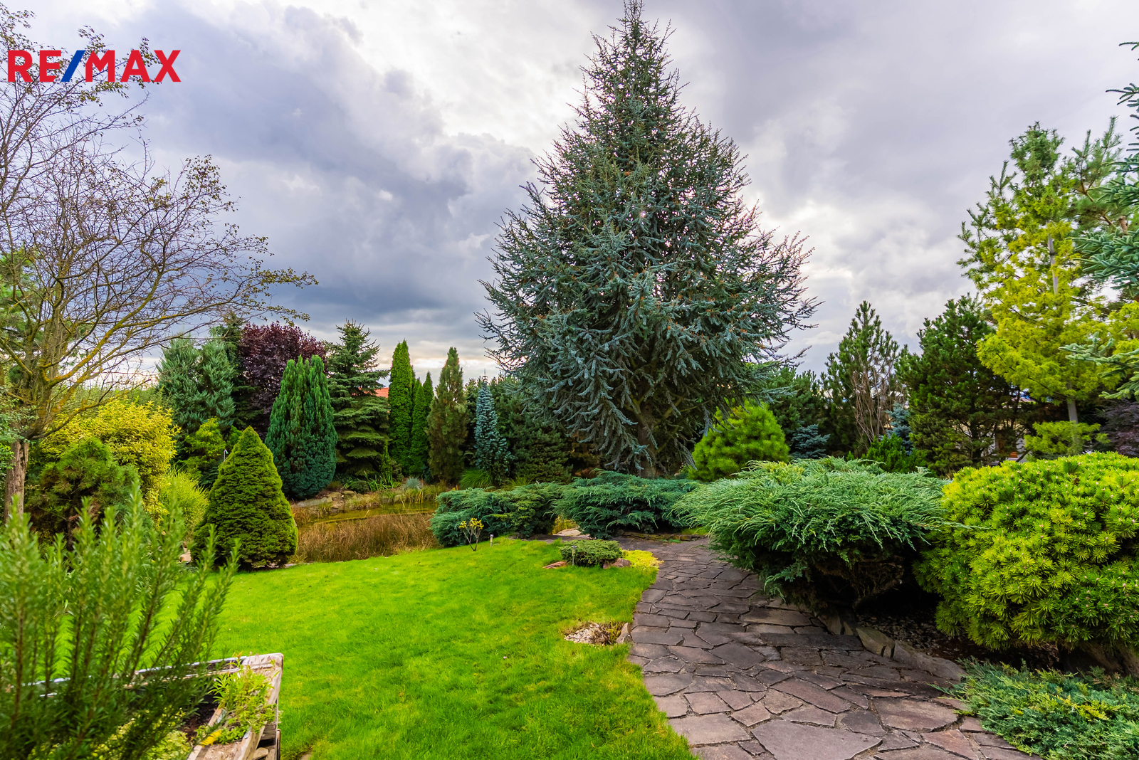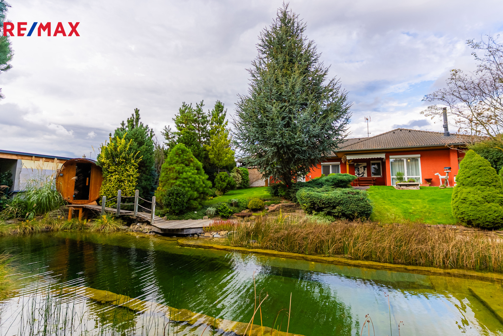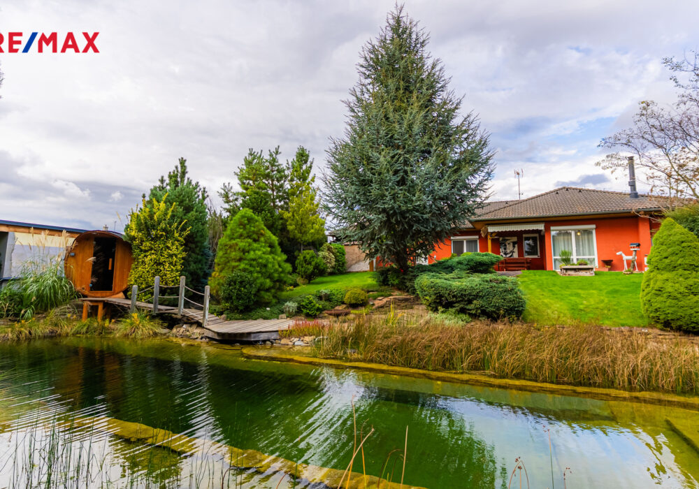 Největší předností je zahrada orientovaná na jihozápad, kde si vychutnáte slunce od odpoledne až do večera. Dominantou pozemku je velké koupací jezírko – biotop (cca 17 × 4 m), které slouží nejen k osvěžení, ale i k plavání. Atmosféru doplňuje finská sauna, venkovní gril a vzrostlé stromy – cedr, borovice, smrk i jedle. Na zahradě je automatické zavlažování a vlastní studna.