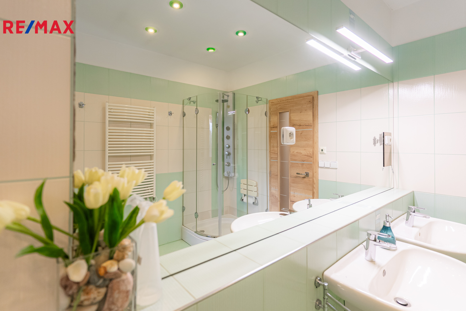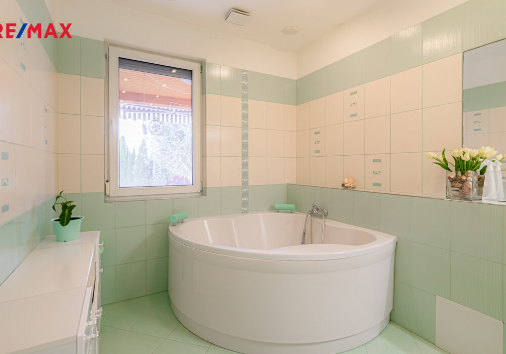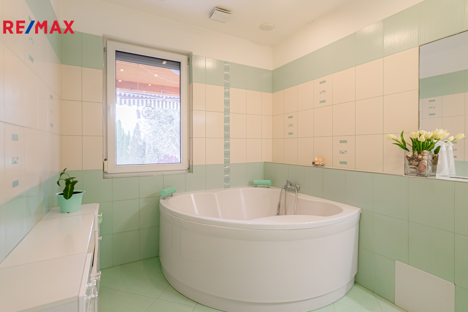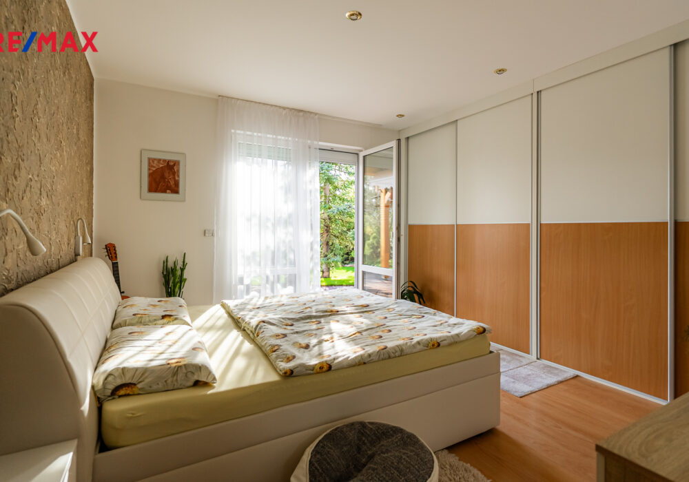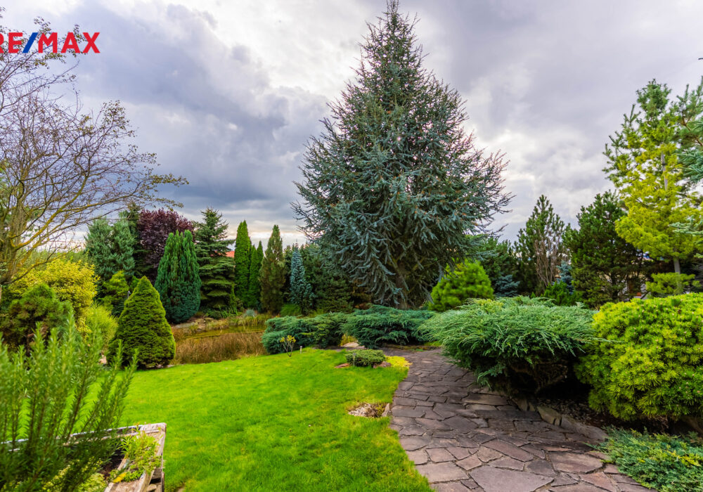 Největší předností je zahrada orientovaná na jihozápad, kde si vychutnáte slunce od odpoledne až do večera. Dominantou pozemku je velké koupací jezírko – biotop (cca 17 × 4 m), které slouží nejen k osvěžení, ale i k plavání. Atmosféru doplňuje finská sauna, venkovní gril a vzrostlé stromy – cedr, borovice, smrk i jedle. Na zahradě je automatické zavlažování a vlastní studna.