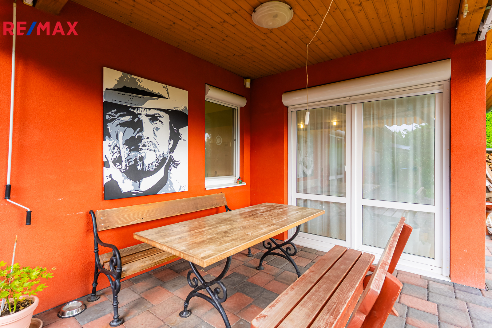K zázemí patří dvě velké garáže (32 m², 27m²) s dílnou, dřevárnou a WC a vydlážděné plochy kolem domu s další možností parkování.
