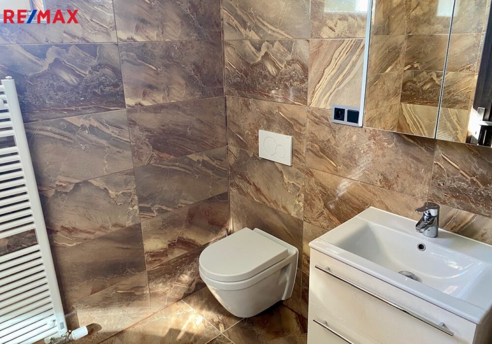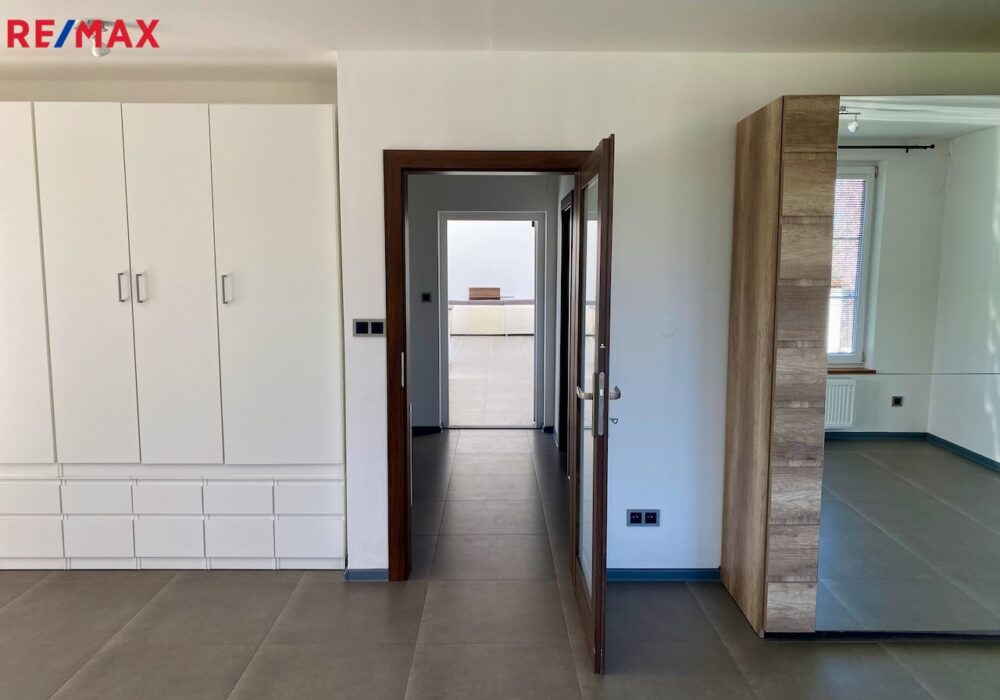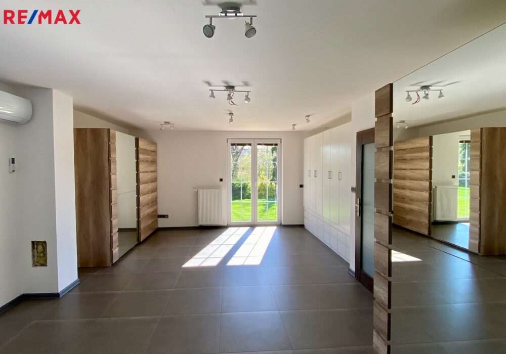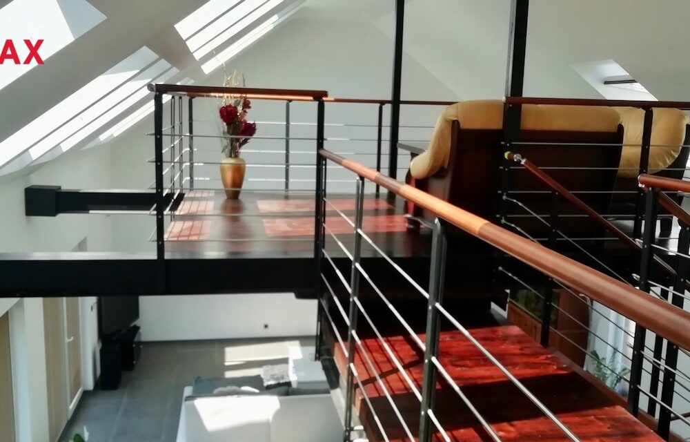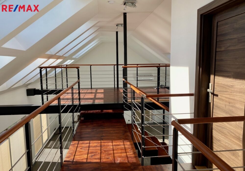 Střešní okna zajišťují přirozené světlo a venkovní rolety společně s klimatizací vytváří příjemné prostředí i v letních měsících. Vstup na vzrostlou zahradu je i z ložnice (v přízemí je praktické 2kk) a relaxovat můžete na terasách či na anglickém trávníku, o který se stará automatická závlaha.