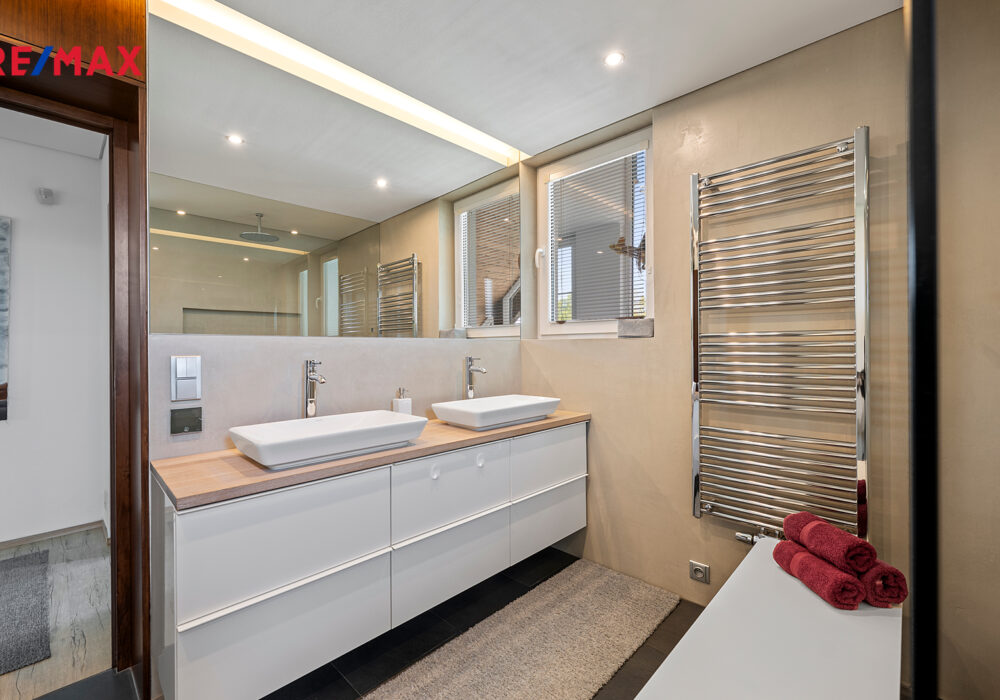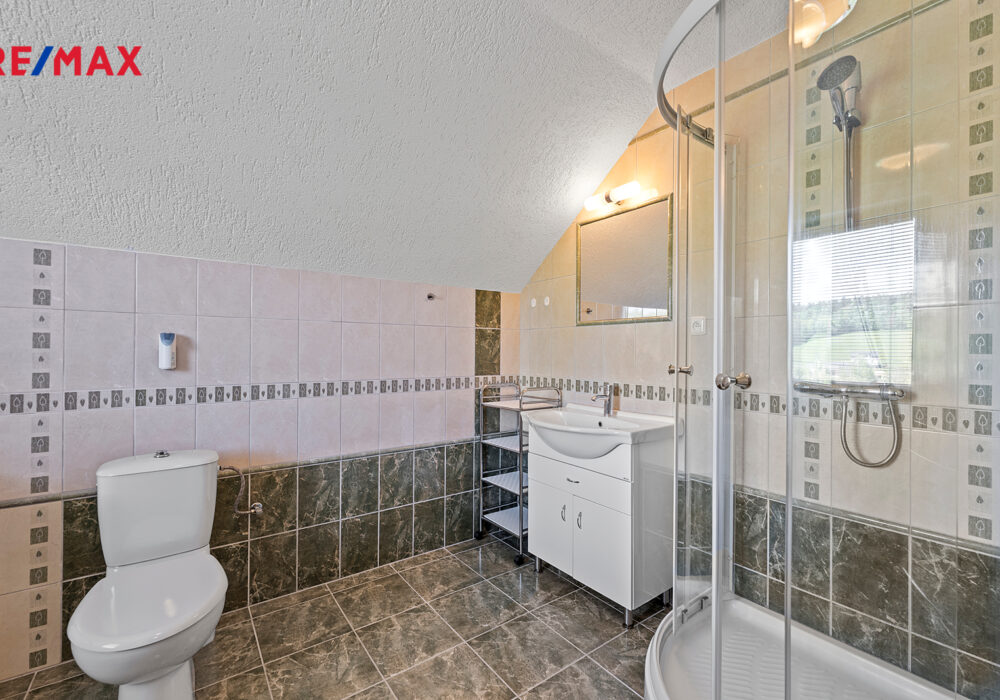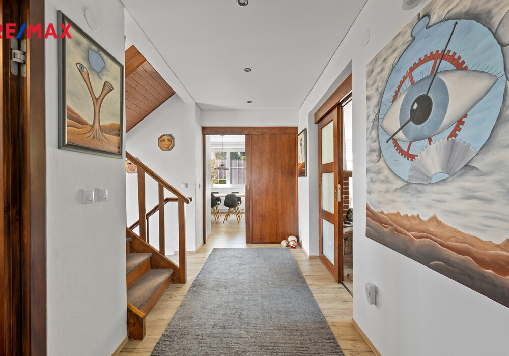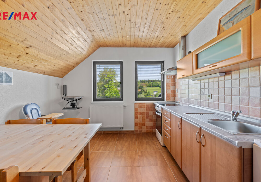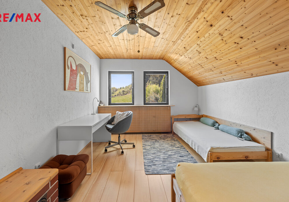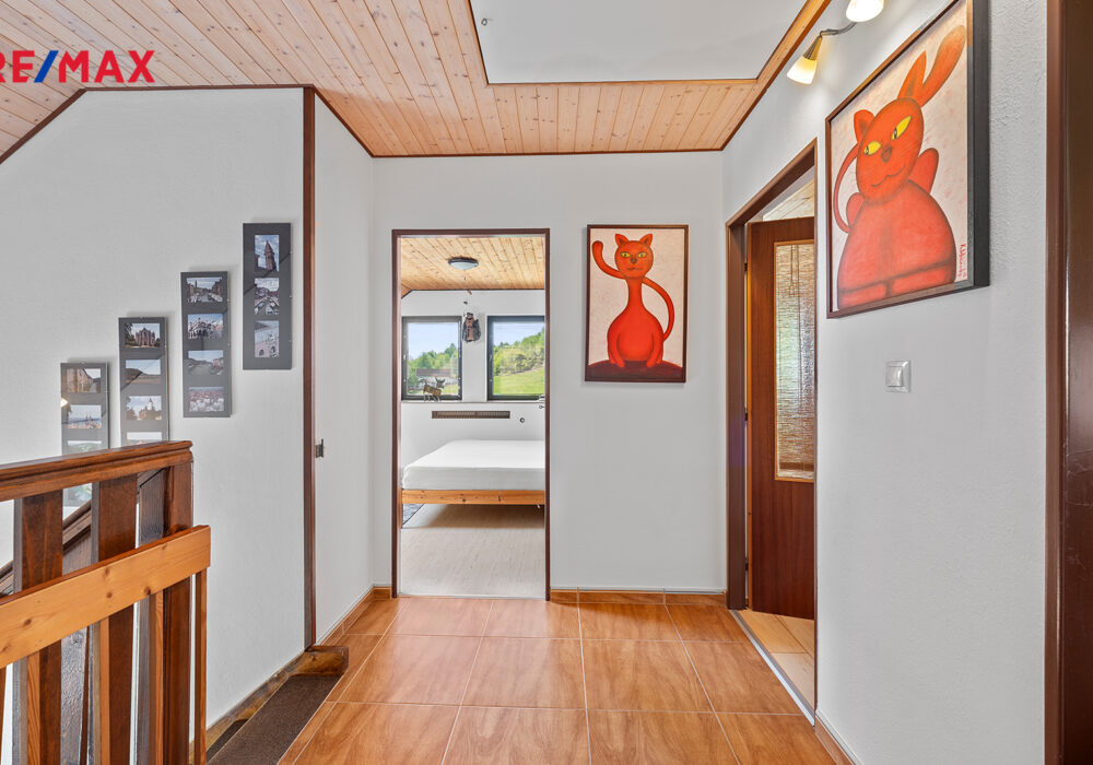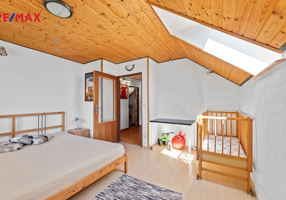 Z chodby je přístup do druhého podlaží, kde jsou dva pokoje, koupelna se sprchovým koutem a s WC, šatna a samostatná kuchyně. V chodbě je výlez na půdu, kde by byla možnost vybudování podkroví o vel. cca 60 m2.