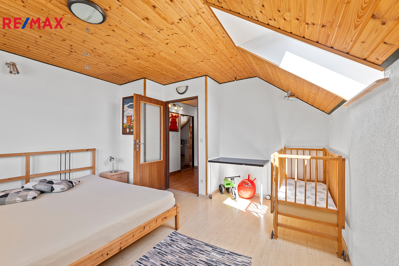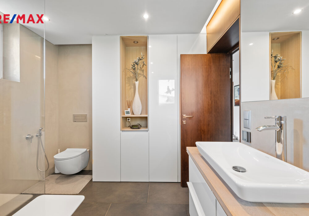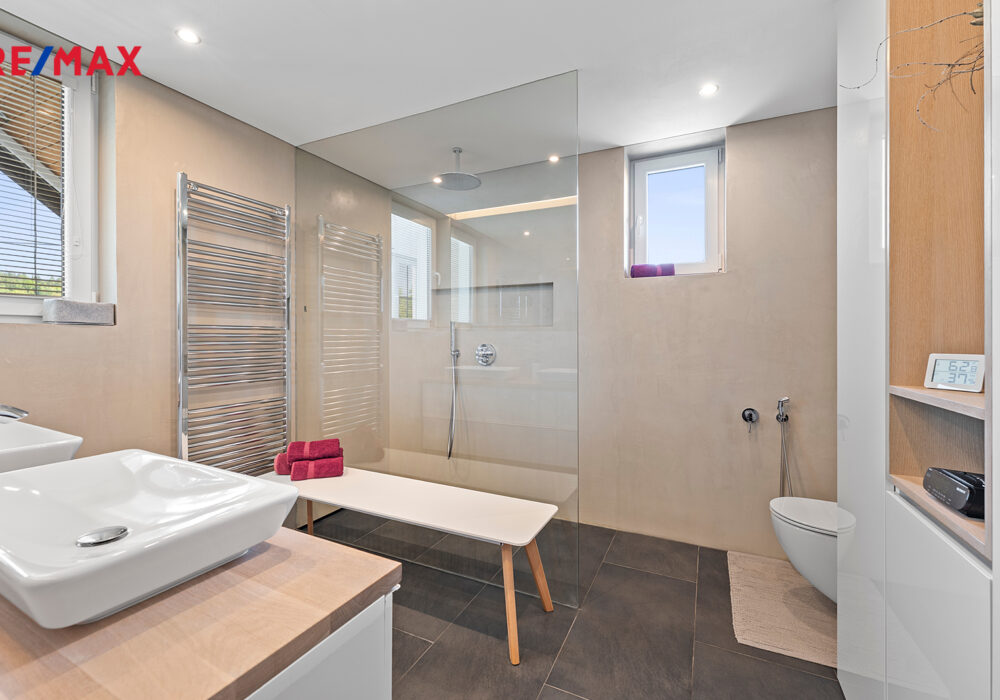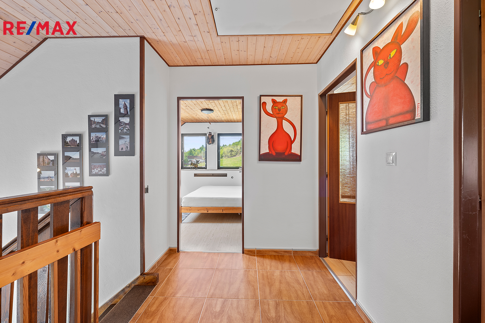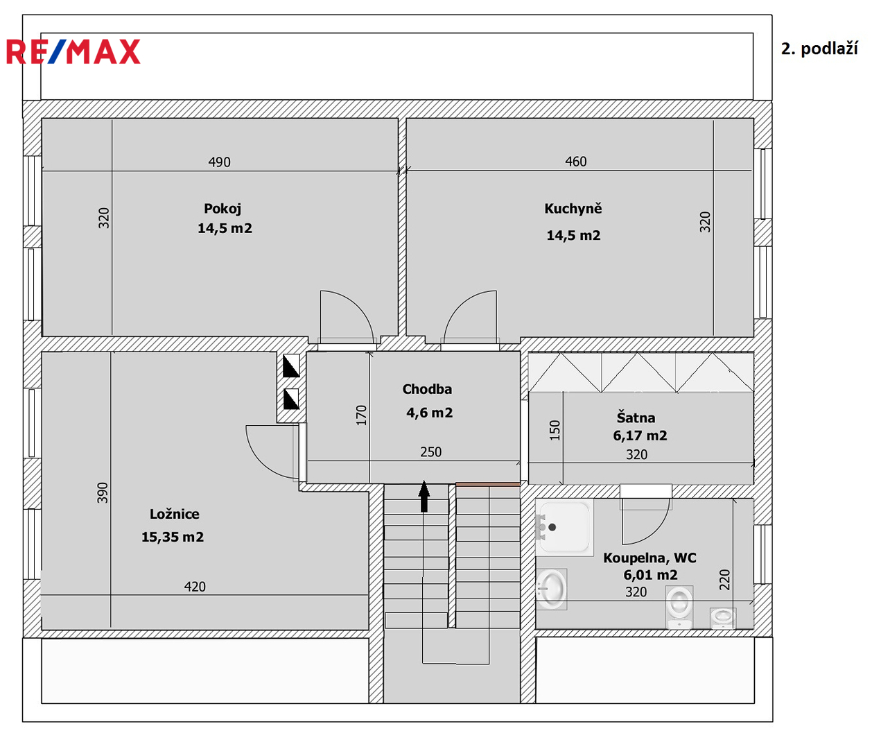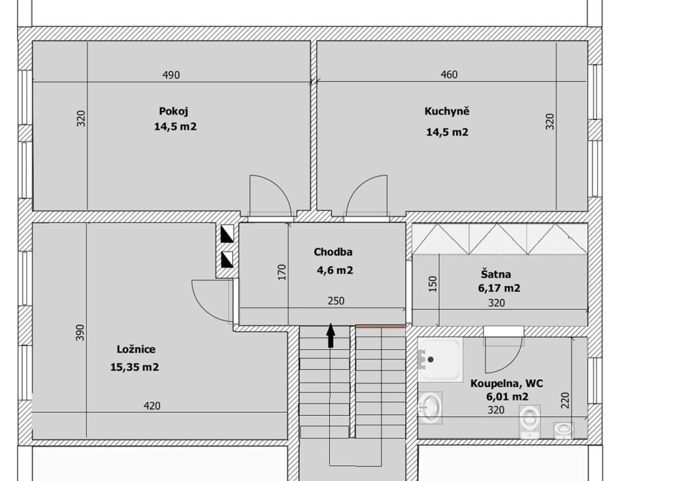 Z chodby je přístup do druhého podlaží, kde jsou dva pokoje, koupelna se sprchovým koutem a s WC, šatna a samostatná kuchyně. V chodbě je výlez na půdu, kde by byla možnost vybudování podkroví o vel. cca 60 m2.