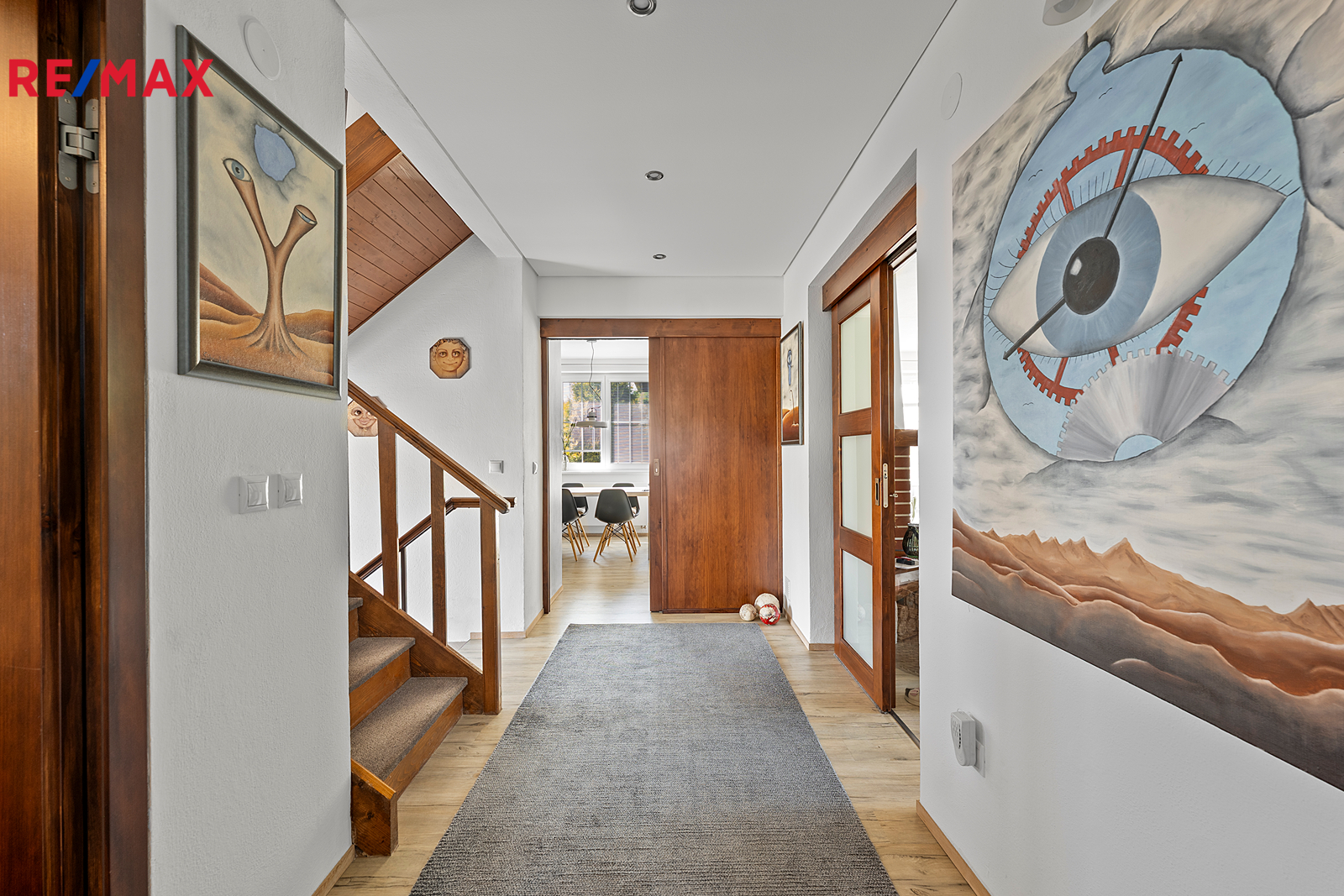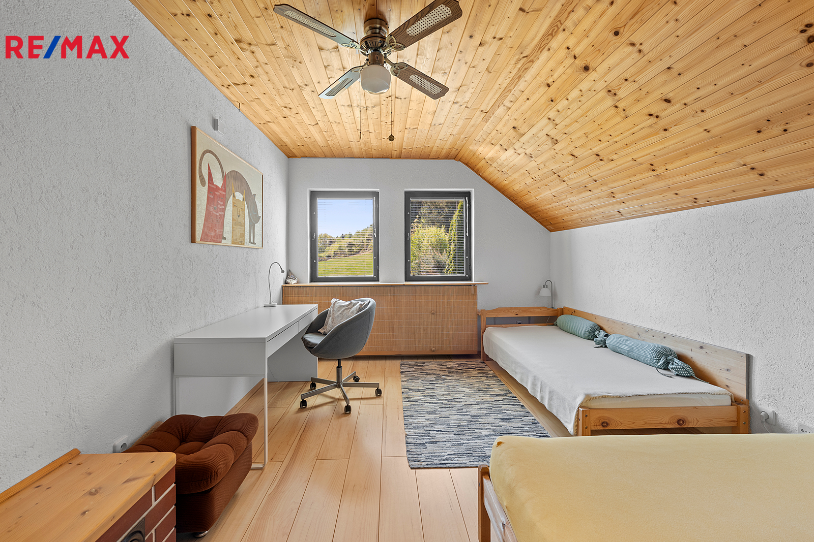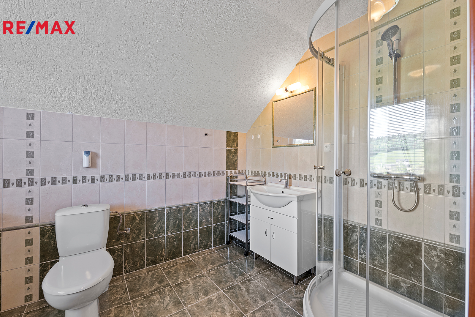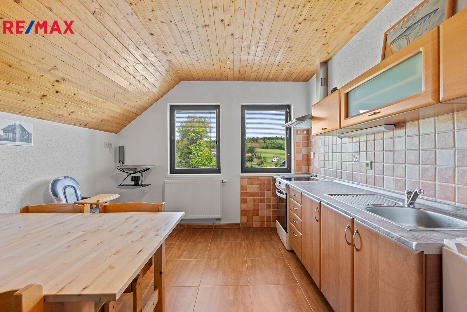 Z chodby je přístup do druhého podlaží, kde jsou dva pokoje, koupelna se sprchovým koutem a s WC, šatna a samostatná kuchyně. V chodbě je výlez na půdu, kde by byla možnost vybudování podkroví o vel. cca 60 m2.