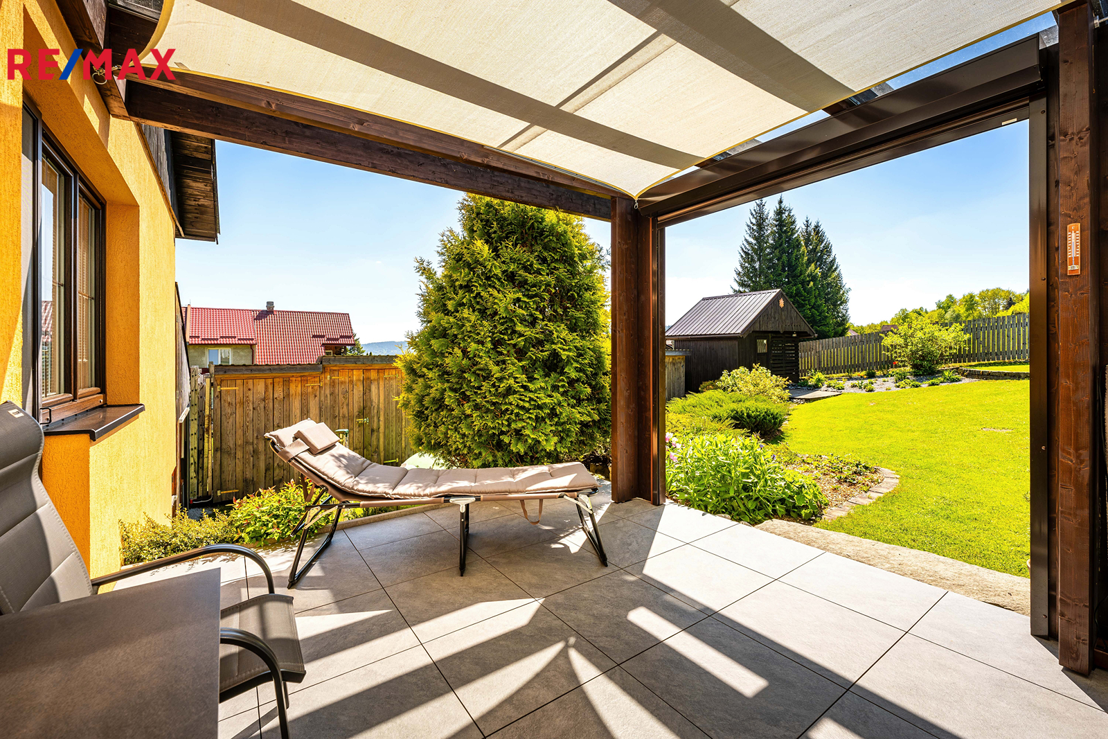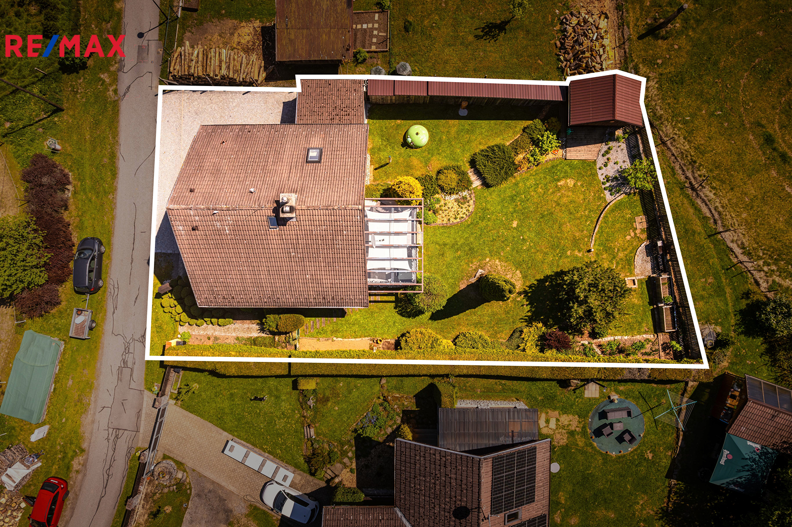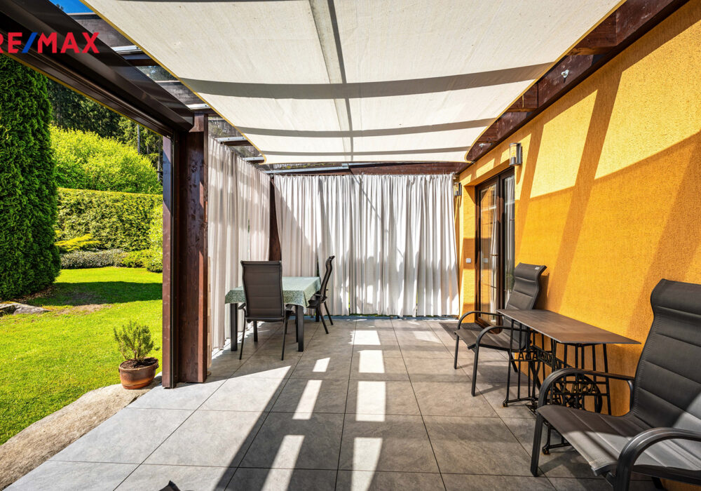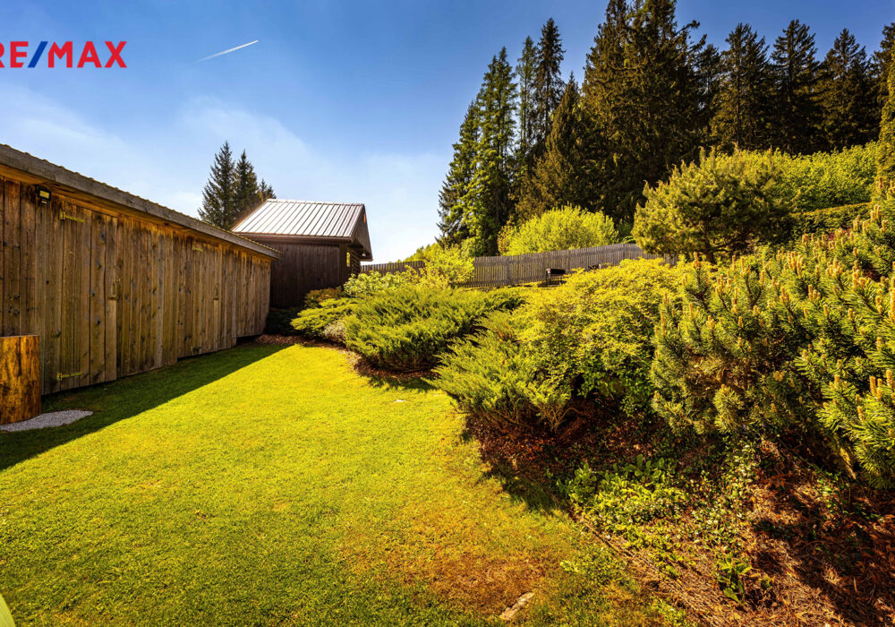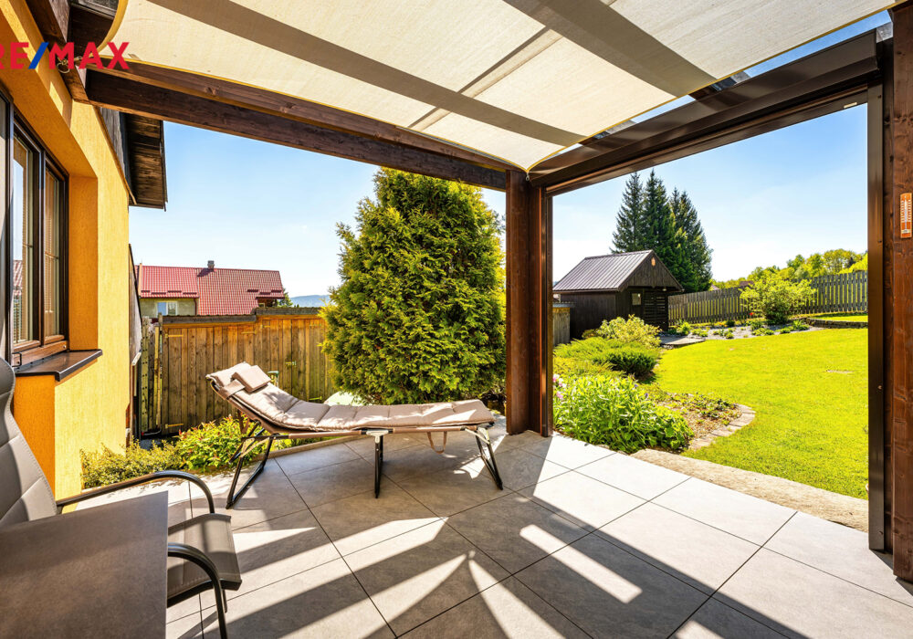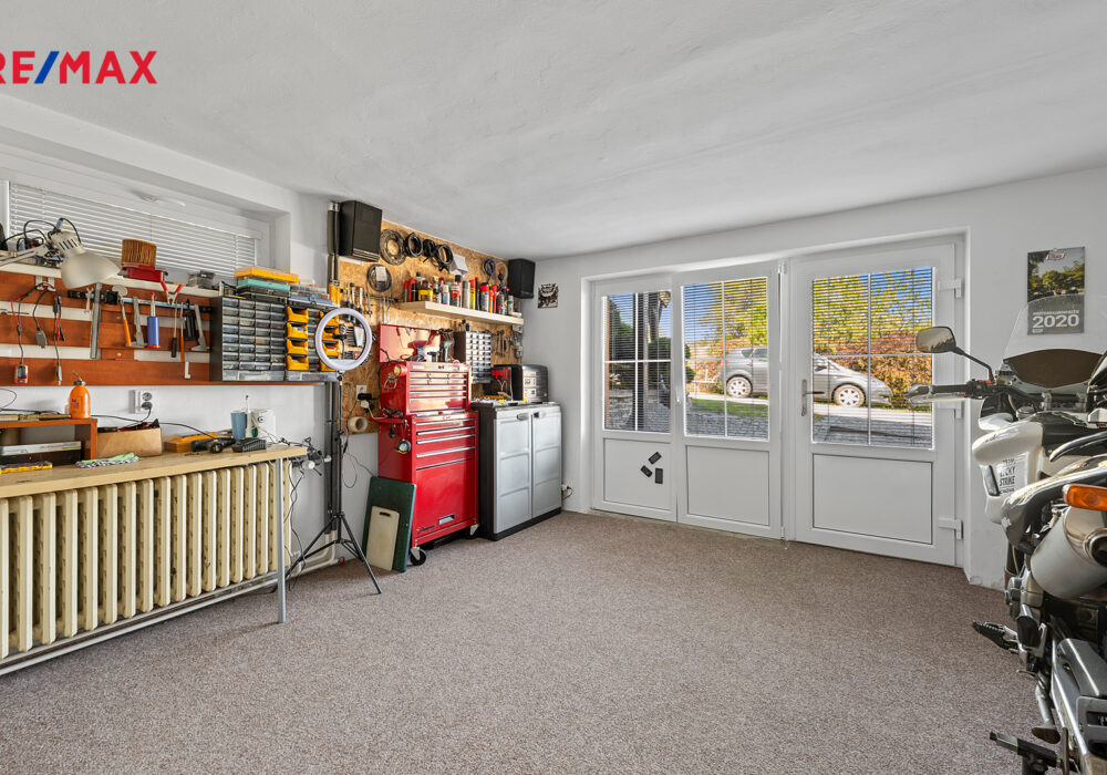 Součástí je garáž s průchodem na zahradu, zahradní domek a kůlny na uskladnění dřeva a dalšího příslušenství. Dále částečně prosklená terasa s pergolou. Oplocená zahrada je osázená množstvím okrasných dřevin, díky nimž je na celém pozemku příjemné soukromí. Parkování je možné v garáži nebo na vydlážděné ploše před ní.