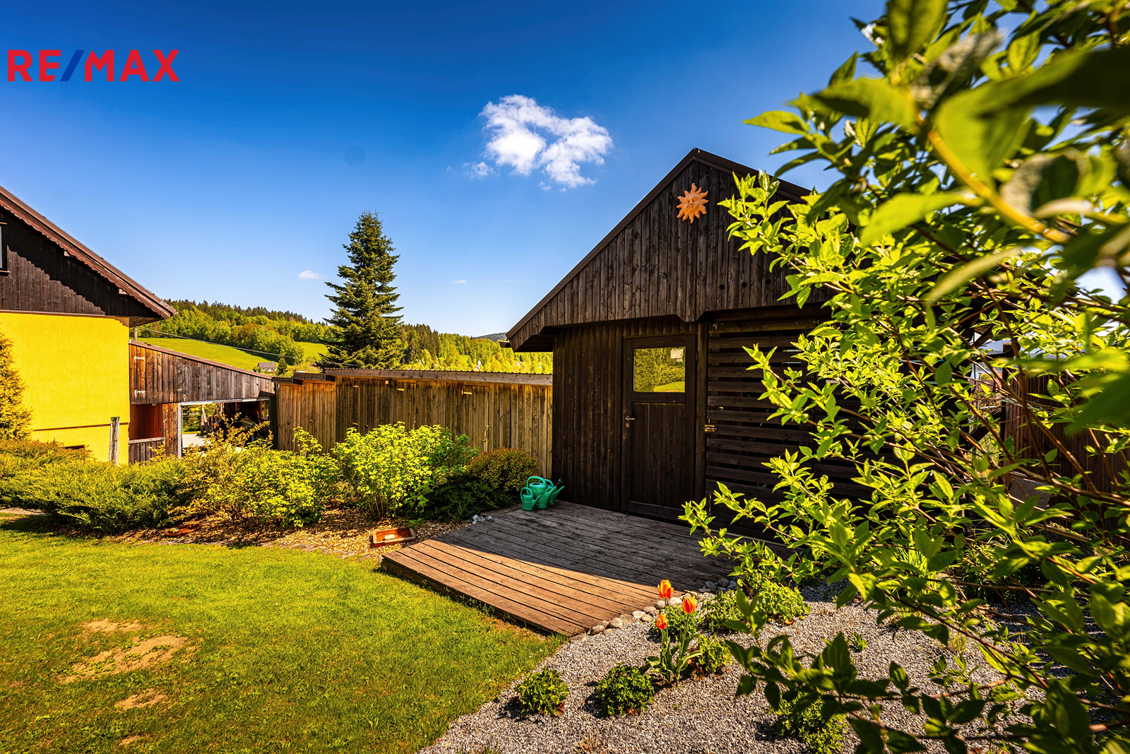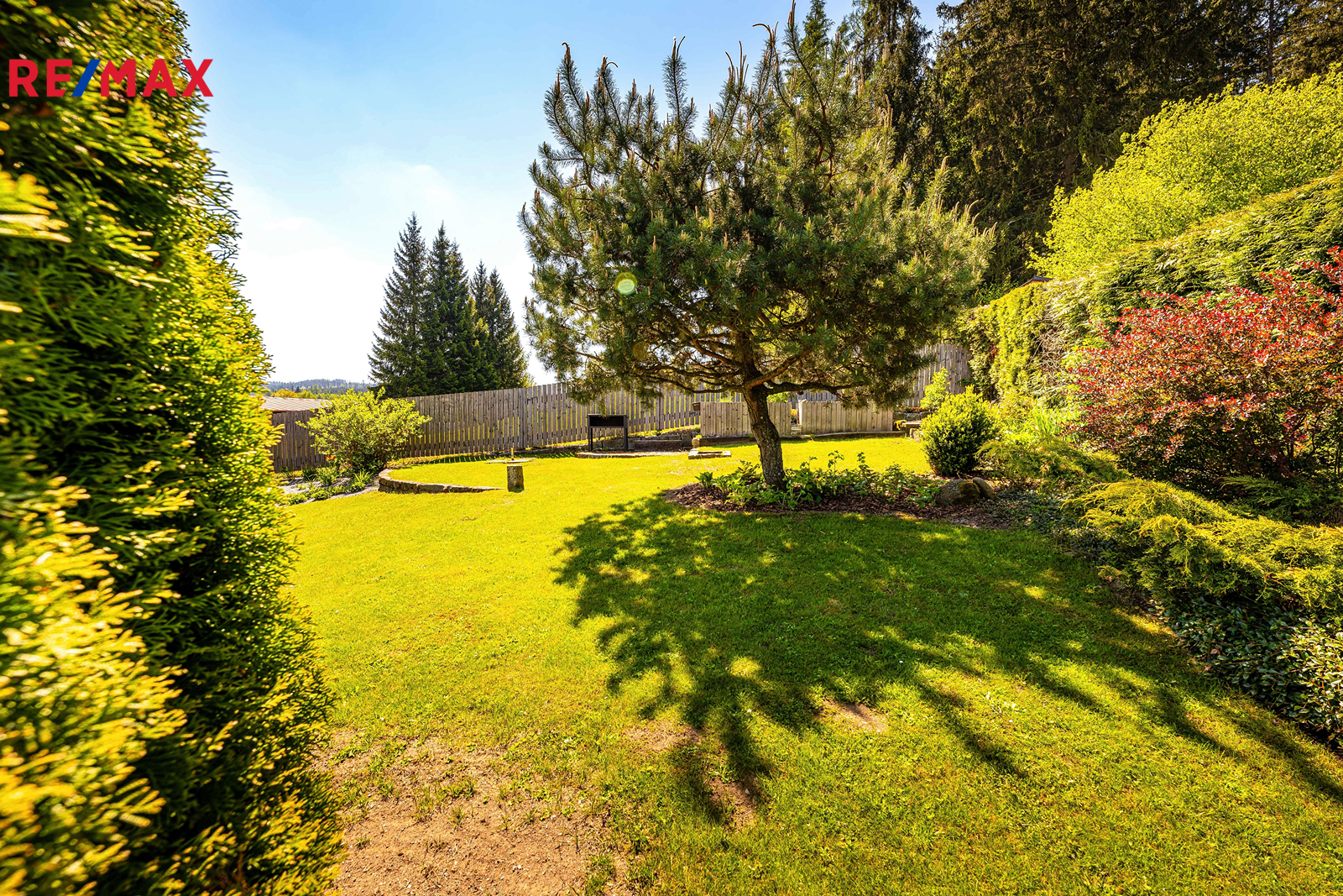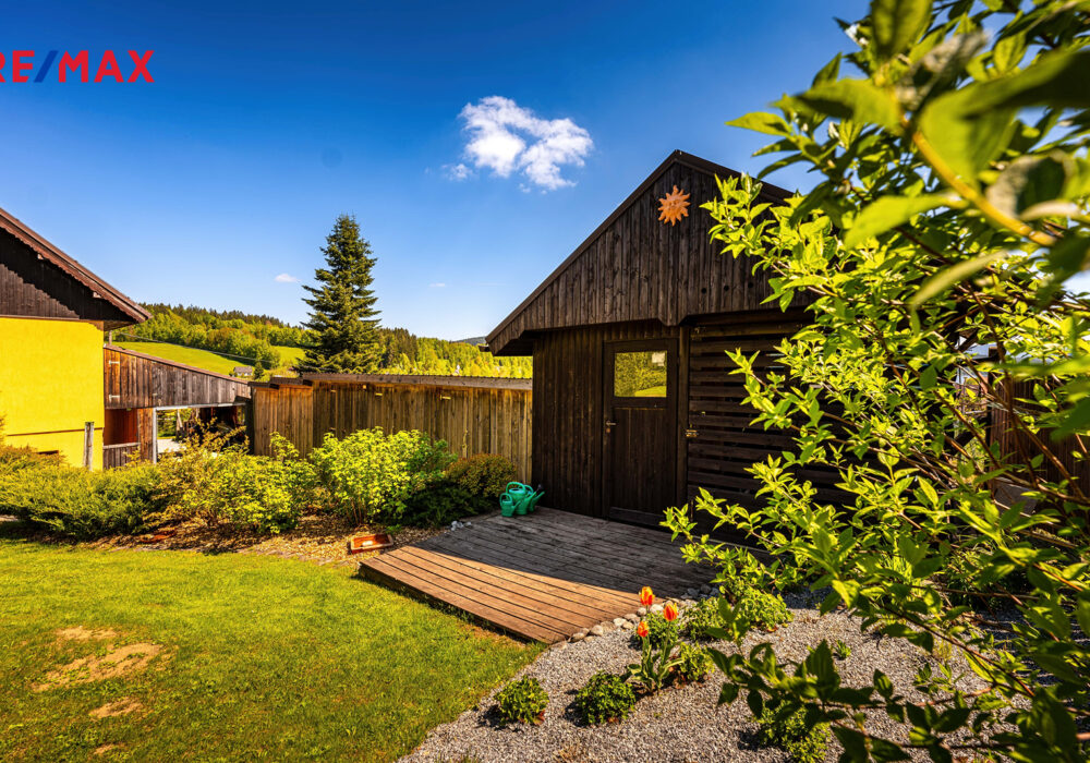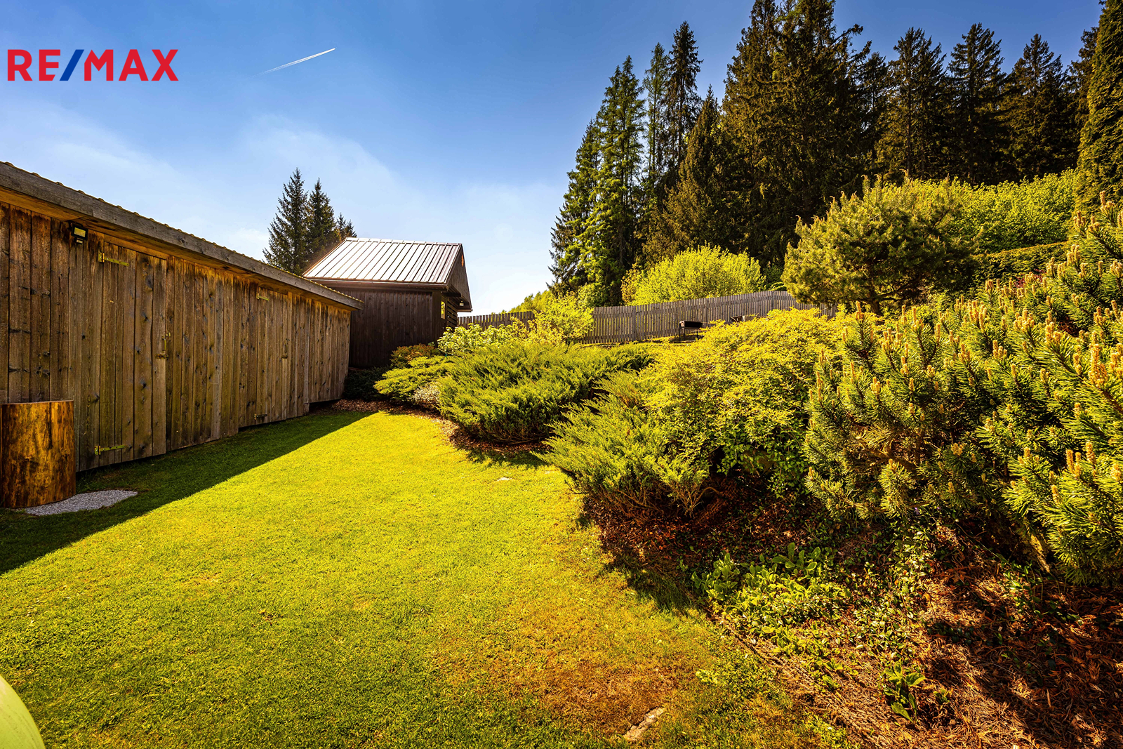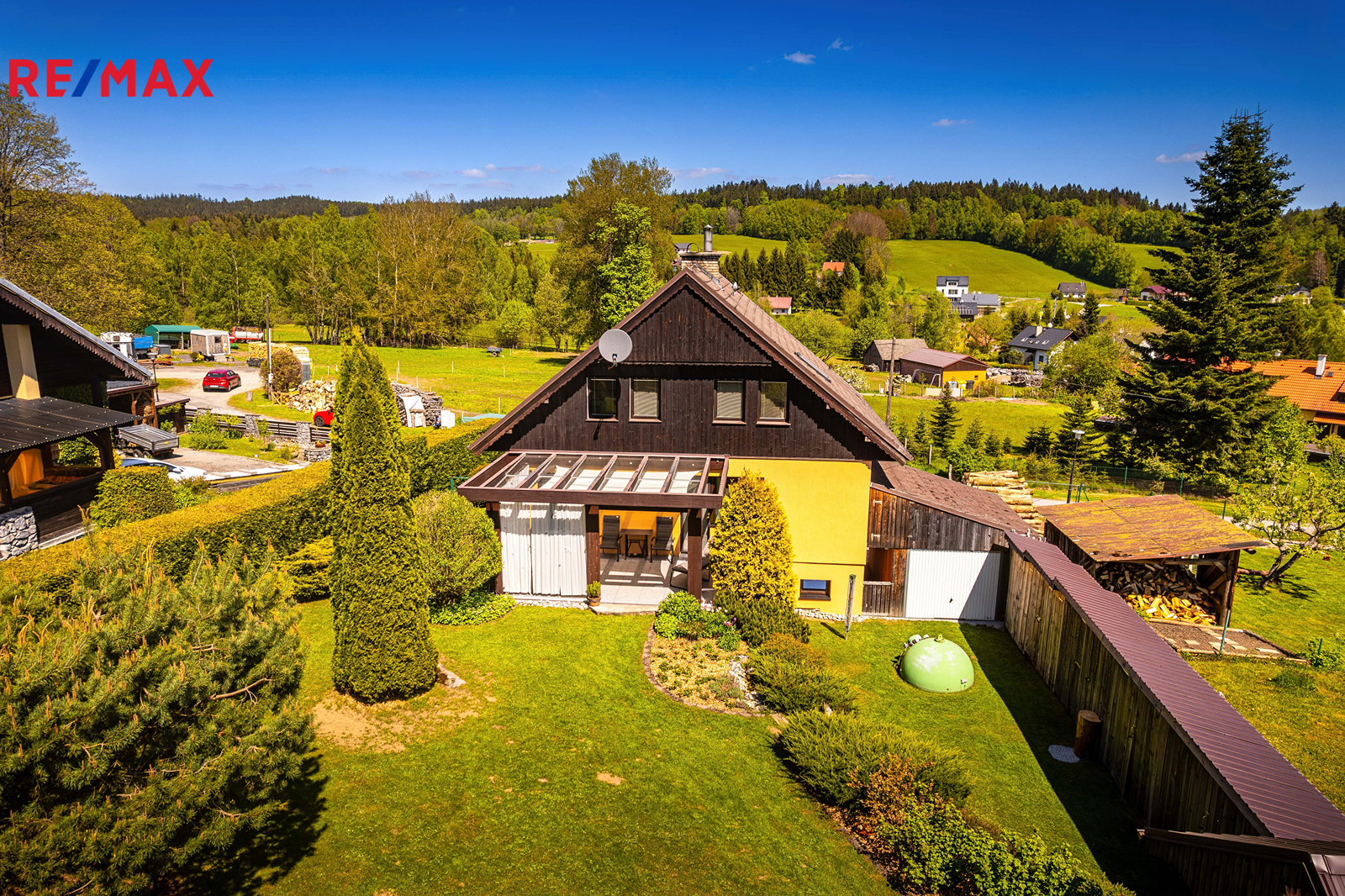 Součástí je garáž s průchodem na zahradu, zahradní domek a kůlny na uskladnění dřeva a dalšího příslušenství. Dále částečně prosklená terasa s pergolou. Oplocená zahrada je osázená množstvím okrasných dřevin, díky nimž je na celém pozemku příjemné soukromí. Parkování je možné v garáži nebo na vydlážděné ploše před ní.