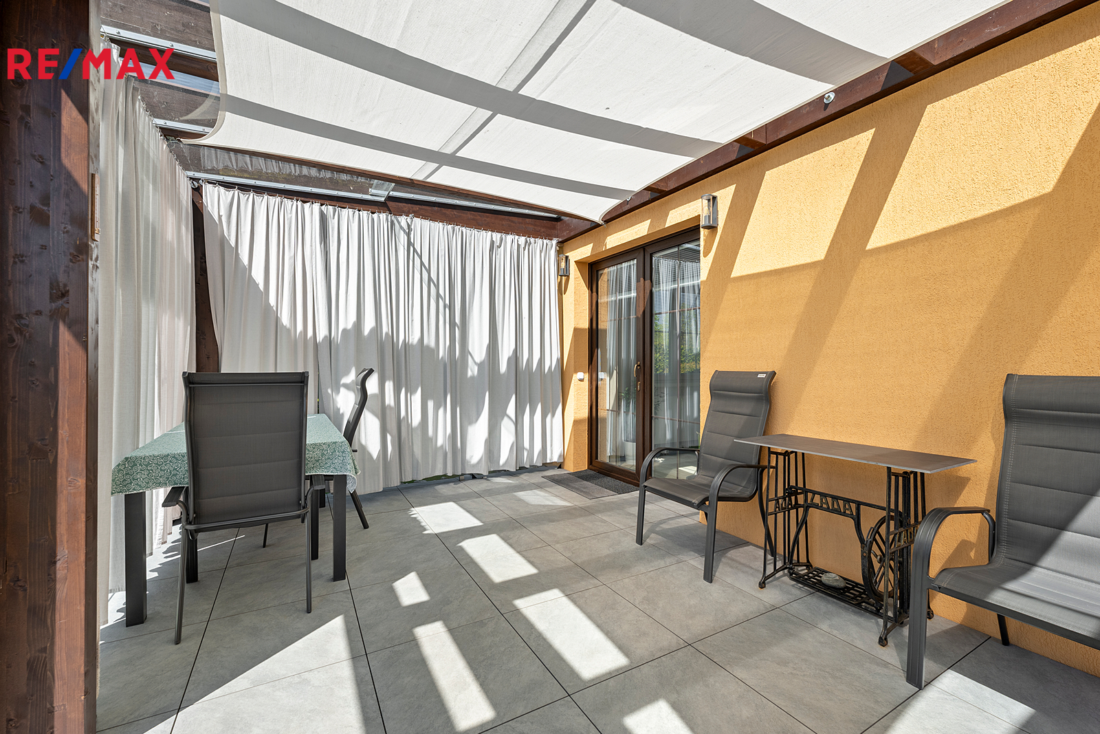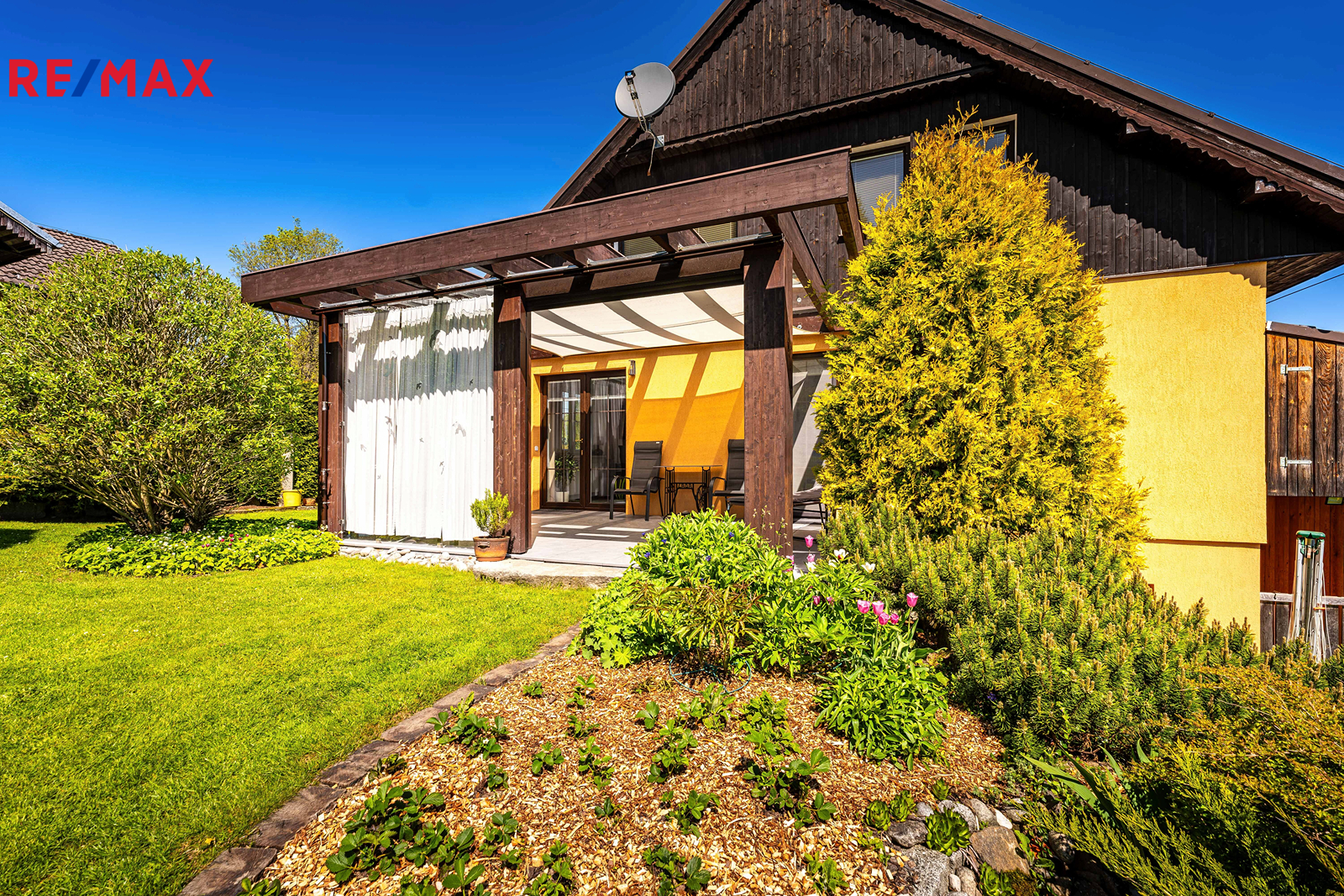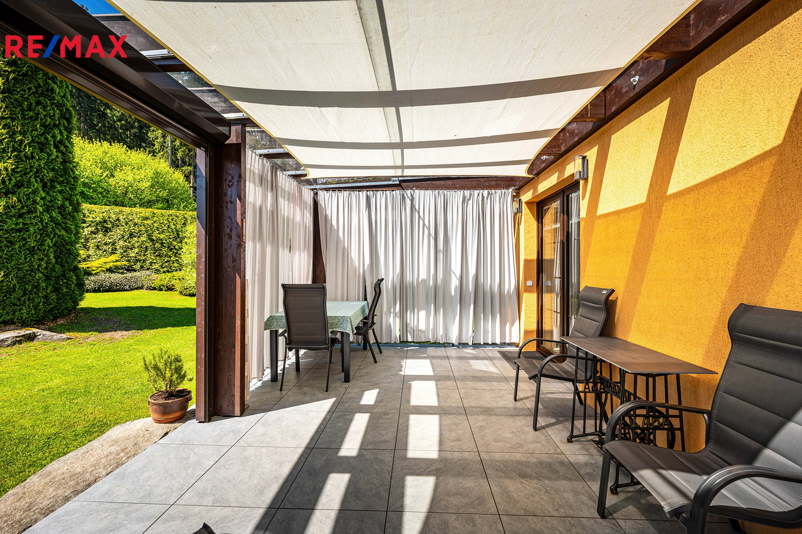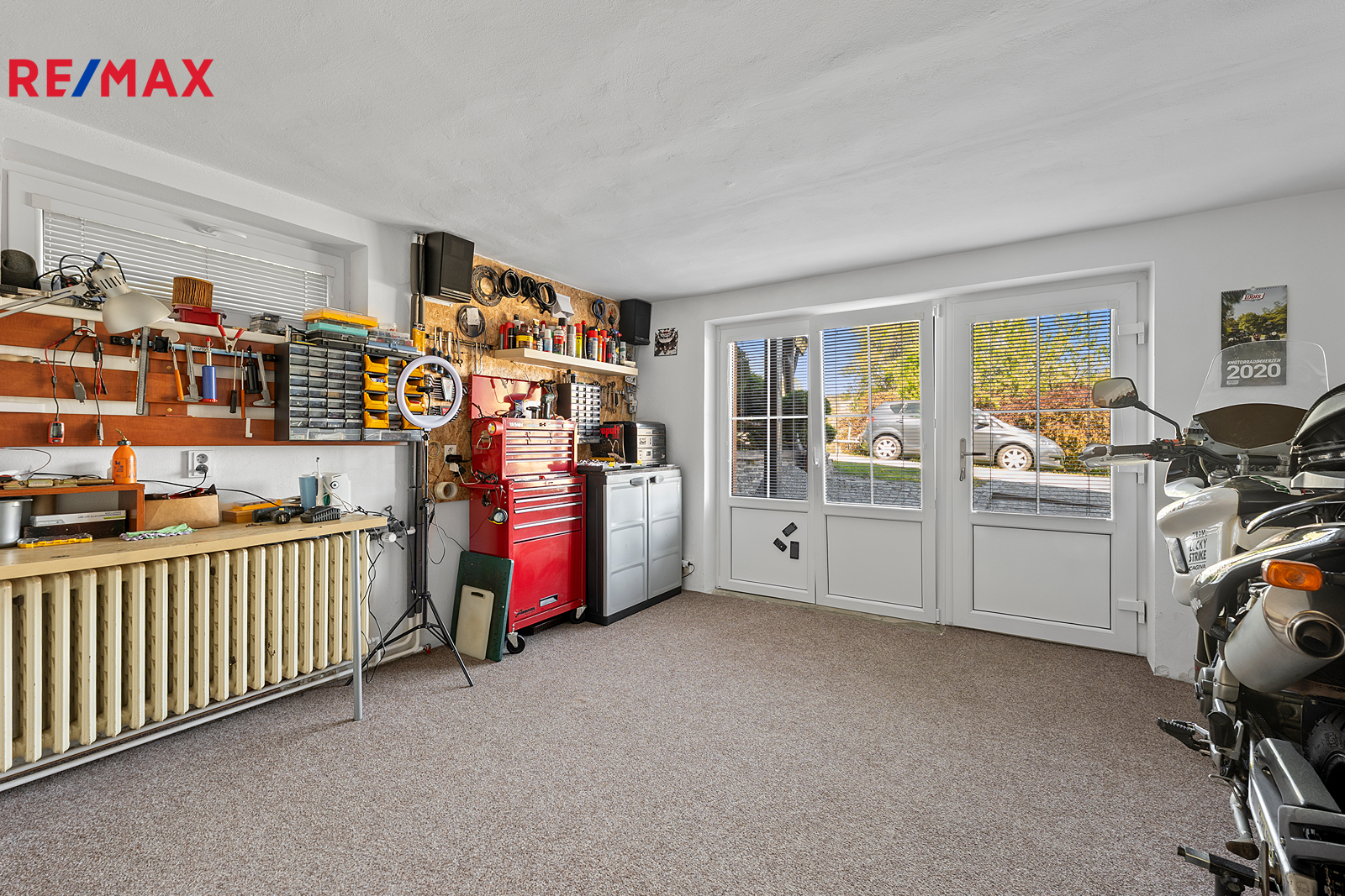 Součástí je garáž s průchodem na zahradu, zahradní domek a kůlny na uskladnění dřeva a dalšího příslušenství. Dále částečně prosklená terasa s pergolou. Oplocená zahrada je osázená množstvím okrasných dřevin, díky nimž je na celém pozemku příjemné soukromí. Parkování je možné v garáži nebo na vydlážděné ploše před ní.
