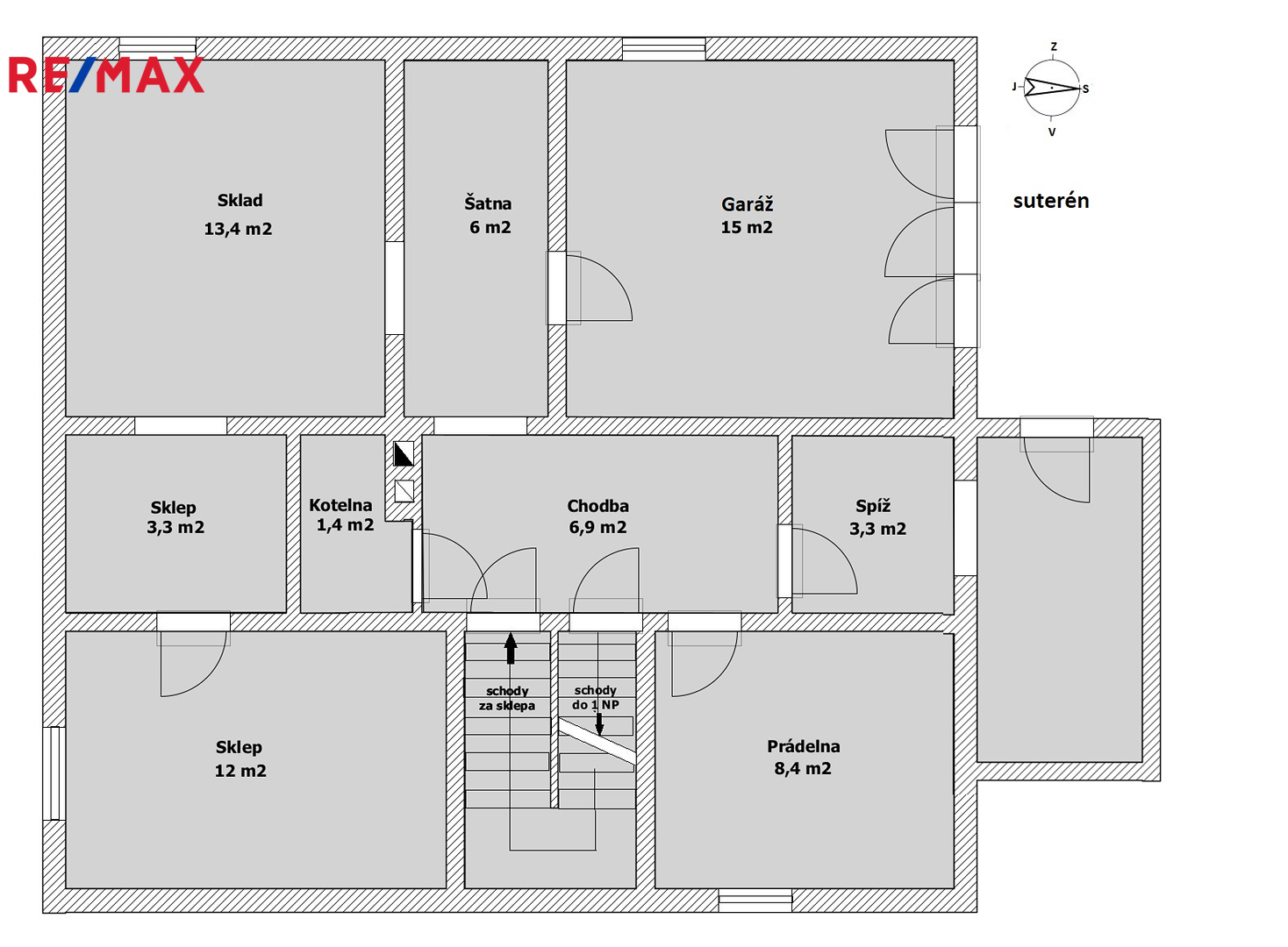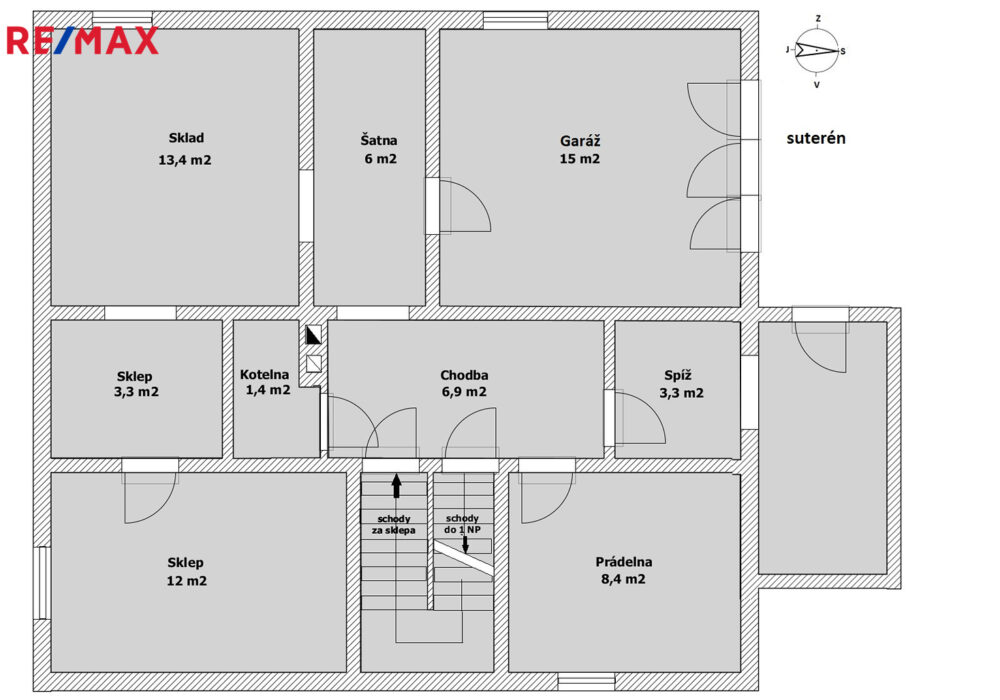 V technickém přízemí domu je bývalá garáž, sloužící jako pracovna, další tři místnosti, z nichž v jedné je příprava na prádelnu a kotelna.