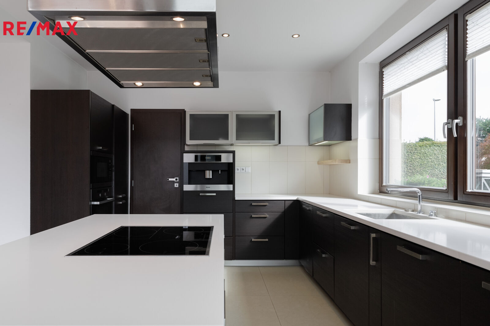 Dominantou celého domu je jeho přízemí. Kuchyň, která je do posledního detailu navržena nábytkem na míru zn. Sykora. Vestavěné spotřebiče zn. Miele jsou samozřejmostí, stejně jako zabudovaný kávovar. Ženy jistě ocení špajz, který ke kuchyni patří.