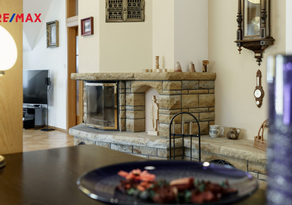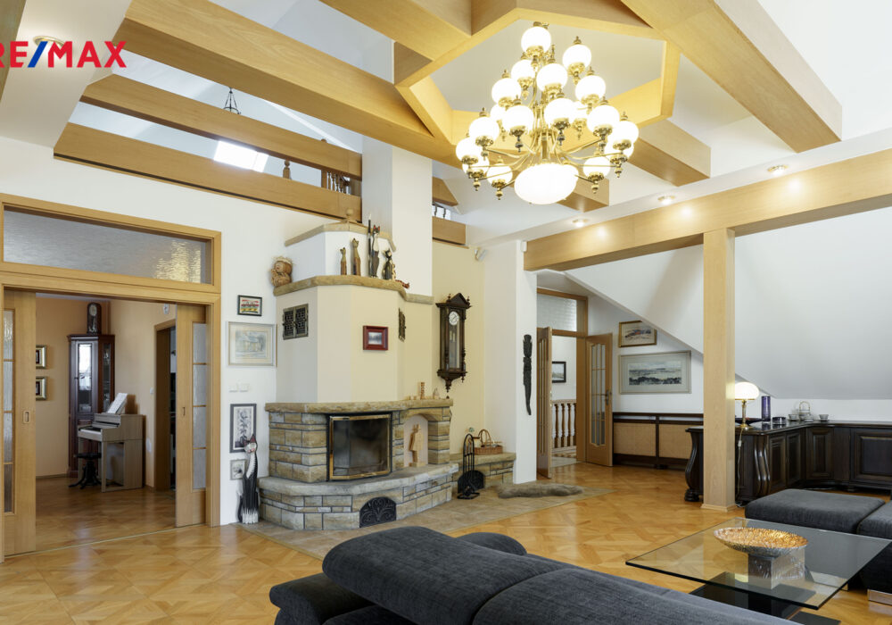 – velkorysý obývací prostor s krbem, vysokými stropy a vstupem na terasu